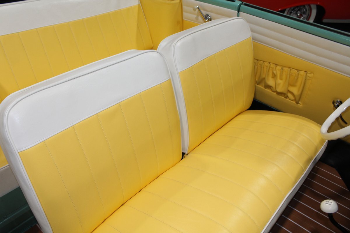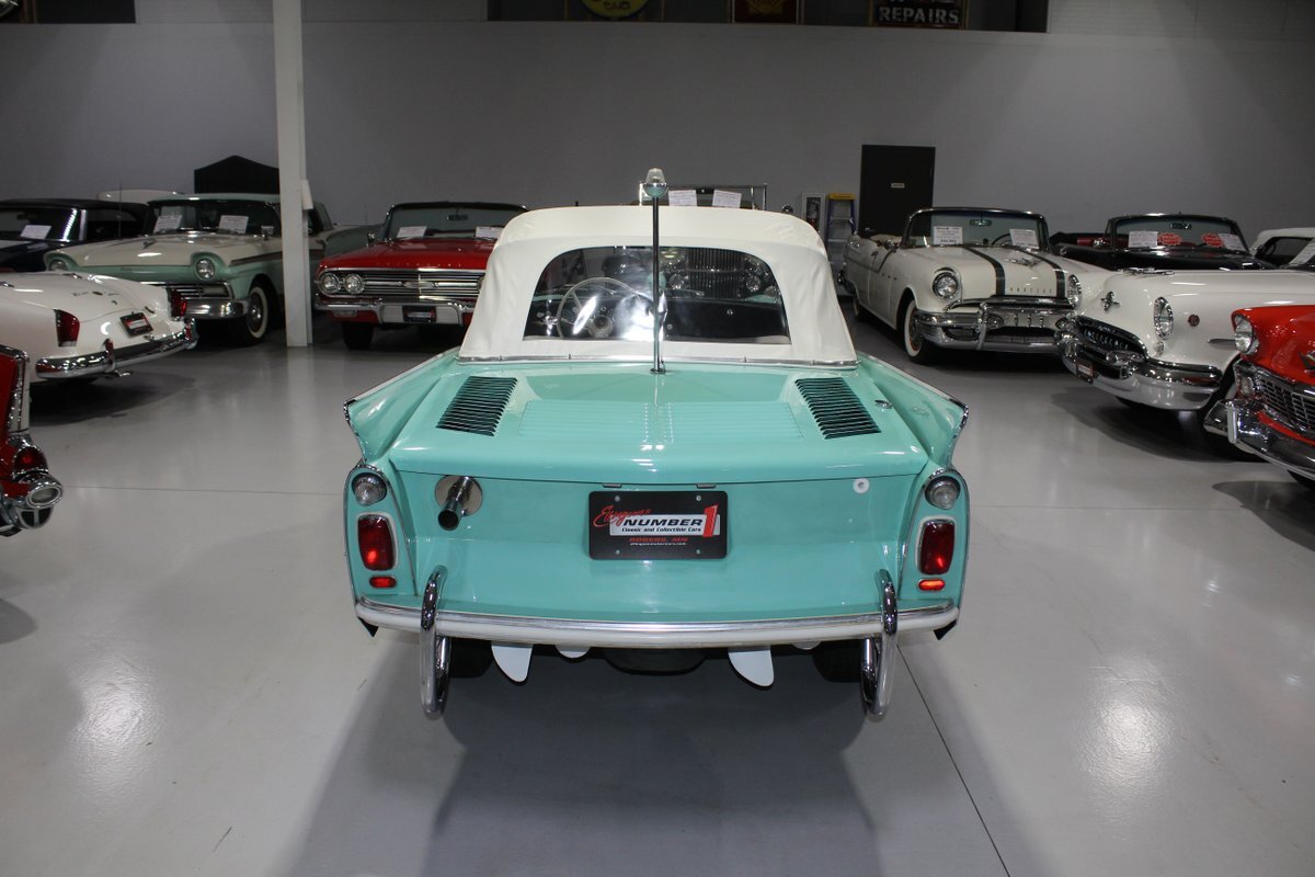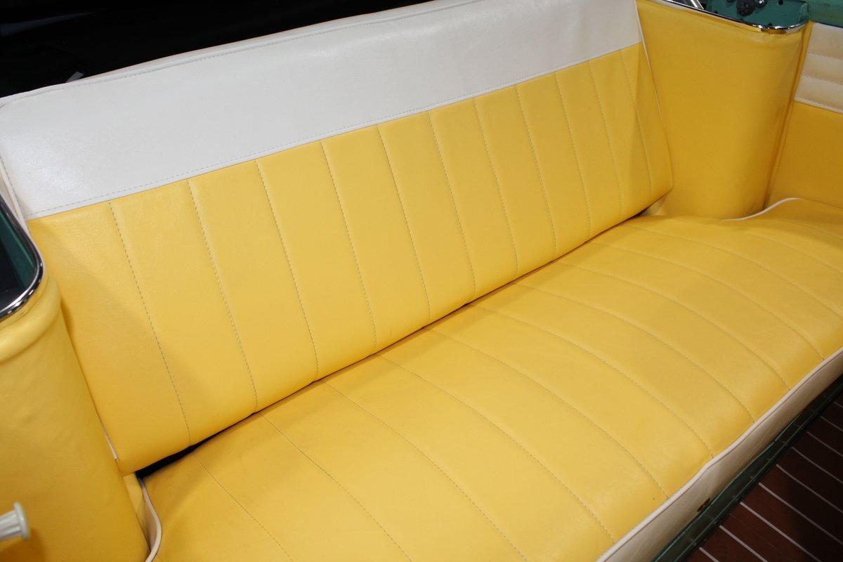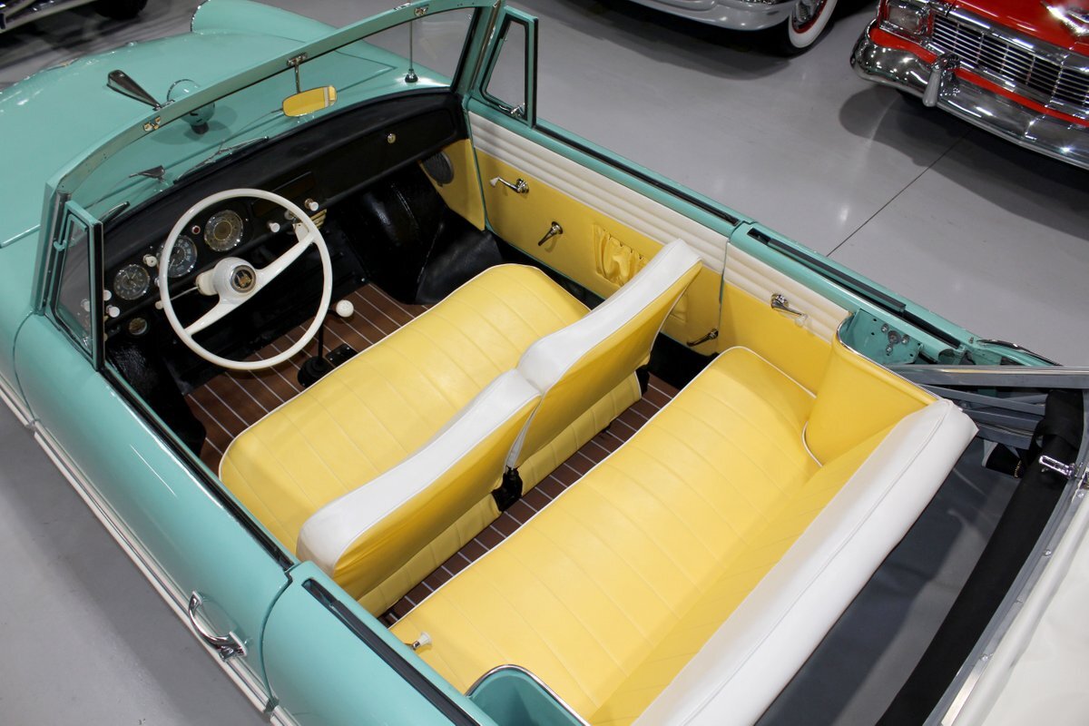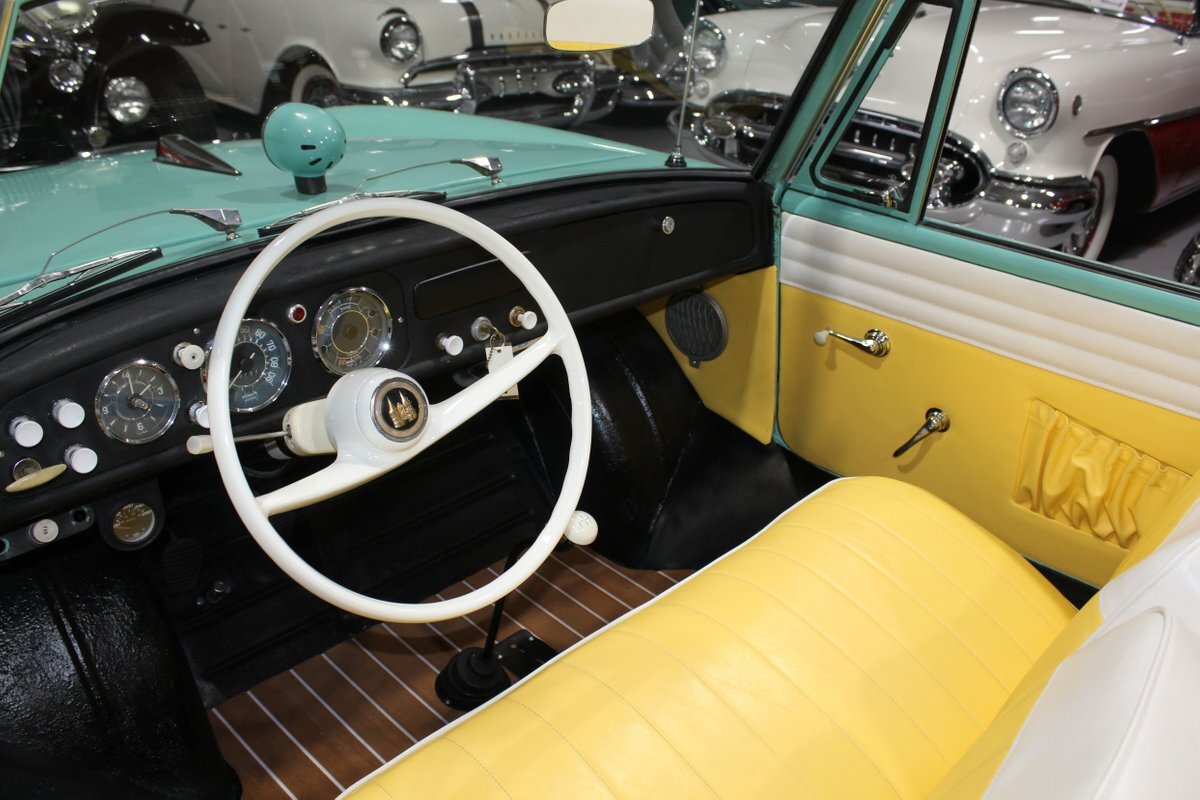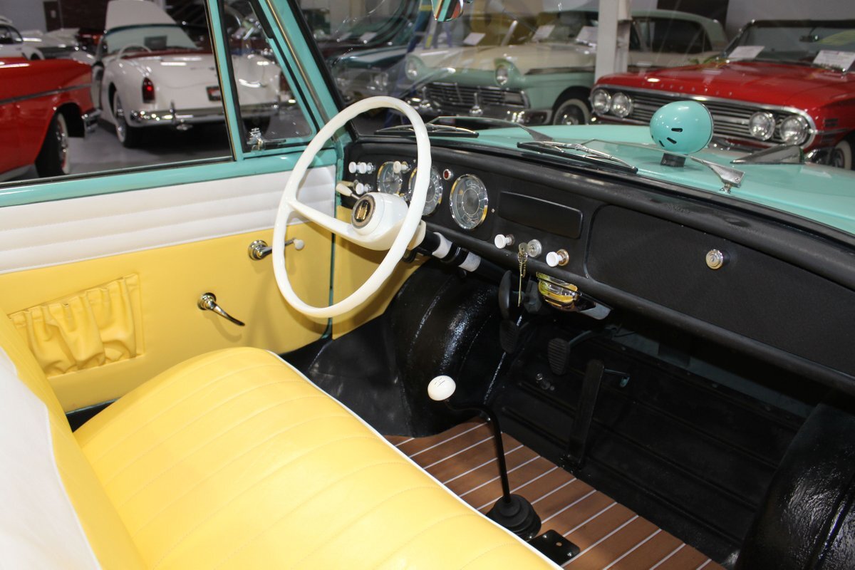 This 1965 Amphicar 770 is a beautifully restored example of the iconic amphibious vehicle that the public could drive to, and into the lake on a gorgeous summer day. Is it a boat or is it a car? It's both, it's an Amphicar! Back in the late 50s, the idea of amphibious vehicles was not particularly novel, especially in the worlds of military and scientific applications. However, the idea of an amphibious motor vehicle for personal use was practically unheard of until a group of West German scientists and engineers reportedly spent 15 years and approximately $25 Million researching and developing the idea. Making its US debut on April 1, 1961 at the Fifth Annual International Auto Show in New York City, the Amphicar was a truly unique automobile. The production version of the Amphicar was based off a concept vehicle designed by Hans Trippel that he had actually displayed at the 1959 Geneva Auto Show. Unlike the concept car that sported a British Austin motor, the production Amphicar was sold with a British Triumph engine. The special land and sea capable transmissions were sourced from the Hermes firm in Germany, who at the time were known for providing the transmissions for another famous German auto maker, Porsche. Perhaps most significantly, the fact that the Amphicar was built on its own platform (as opposed to being built on an existing car or boat) makes this amphibious vehicle particularly extraordinary. Dubbed "the sports car that swims," the Amphicar was touted for its ability to simply drive into water and instantly become a boat, thus being able to be transported without the need of a trailer. Additionally, the 770 model name was said to have come from the Amphicar's ability to travel 7 MPH in the water and 70 MPH on land. Despite the Amphicar's novel design and initial public excitement, they were only produced for a mere 7 years. A combination of weak demand and changes in the tightening EPA and DOT regulations lead to the firm's ultimate downfall. In the 7 year run, a total of approximately 800 Amphicars were produced and of that, only about 600 were sold in the US, which makes these exceptional pieces of automotive history especially desirable and collectible today. The British-sourced 1,147 cc Overhead Valve Inline 4 Cylinder engine is paired with a single barrel Solex carburetor is mounted in the rear of this vehicle and was said to have produced 43 horsepower when new. The 1,147 CC engine is backed by a German-sourced Hermes 4 speed manual transmission that was capable of switching between land and sea driving with the flip of a switch. This Amphicar is equipped with a 12 Volt electrical system which provides an improved startup and overall electrical performance. On land, this 1965 Amphicar 770 rides on a set of radial tires on painted steel rim with wheelcovers and in the sea it is propelled via a pair of propellors underneath the vehicle towards the rear. The white vinyl convertible top is manually operated and it's in fantastic condition. The exterior on this Amphicar has been refinished in a beautiful Fjord Green that just has a great look for such an eccentric vehicle. Superb chrome and brightwork around the exterior of this Amphicar 770 completes its exterior appearance. The interior on this Amphicar is absolutely fantastic! The front and rear bench seats, and door panels have all been beautifully reupholstered in a two-tone color scheme consisting of Yellow and White Vinyl. The dash, woodgrain floor, and steering wheel are all in wonderful condition as well and all appear to be in their stock configuration. The dash is outfitted with a 90 MPH speedometer, temperature gauge, and fuel gauge, along with a clock. An Equus temperature gauge is also mounted neatly under the dash as well. Whether you're adding to your existing collection or you're buying your first classic car, this 1965 Amphicar 770 would make an excellent choice. Give us a call today!