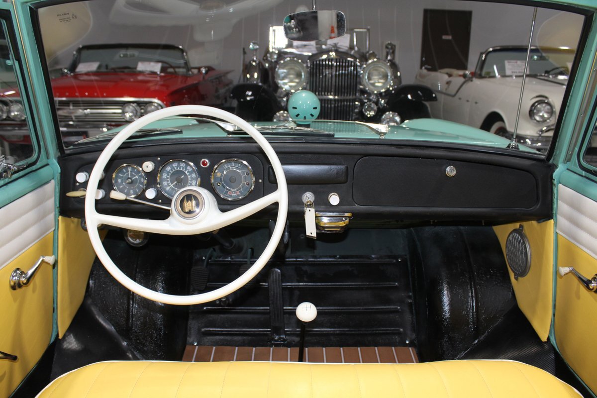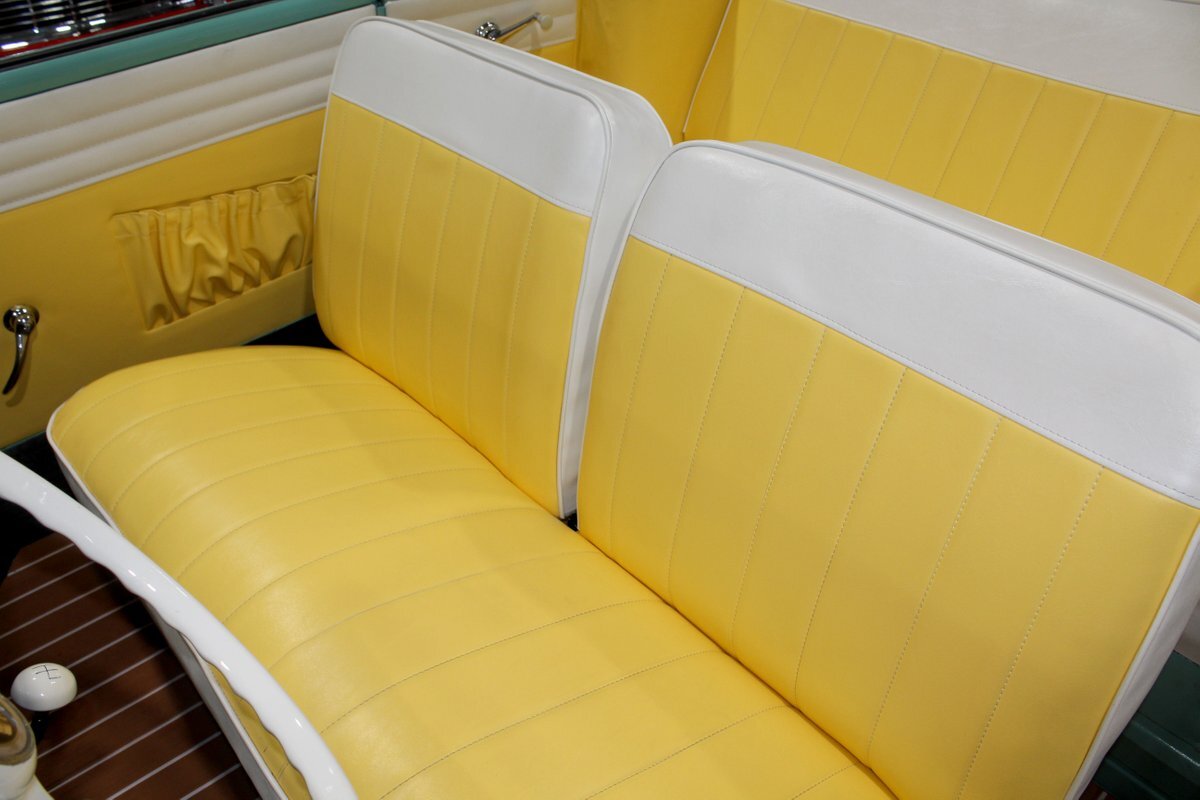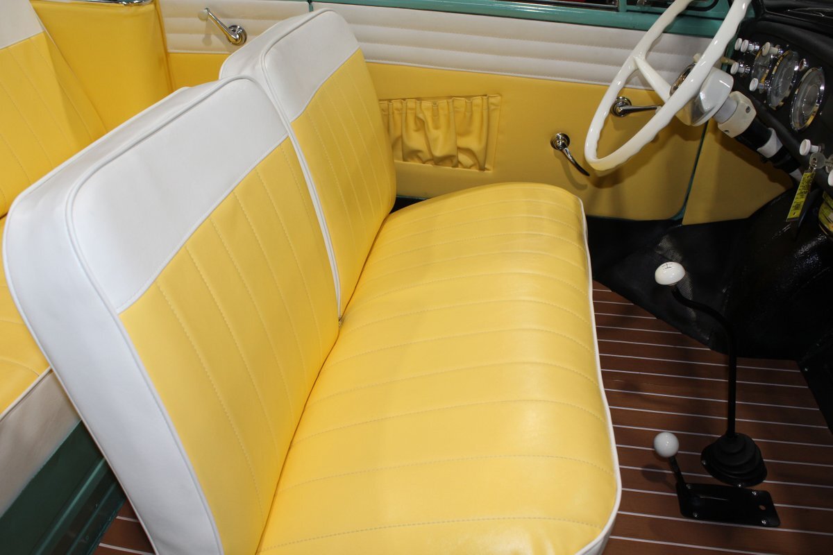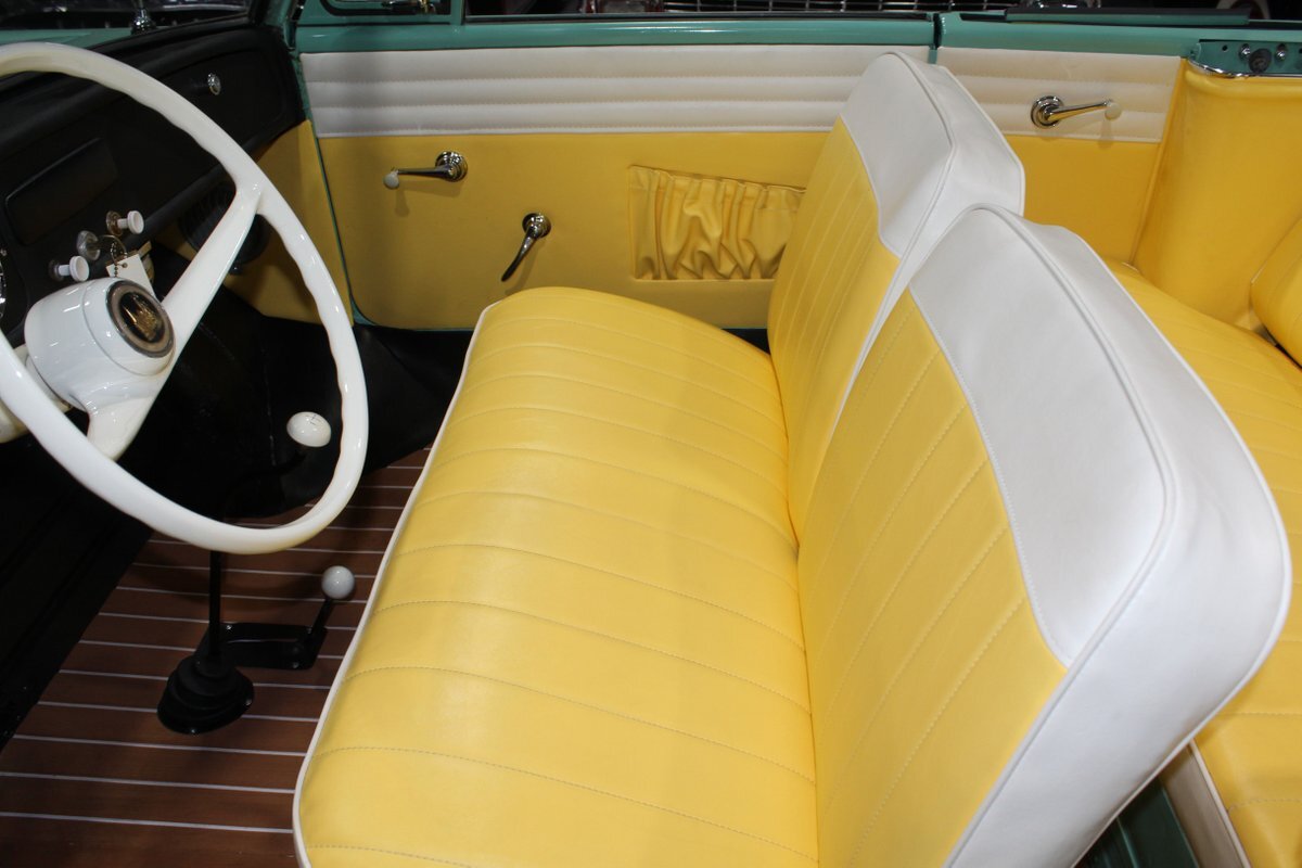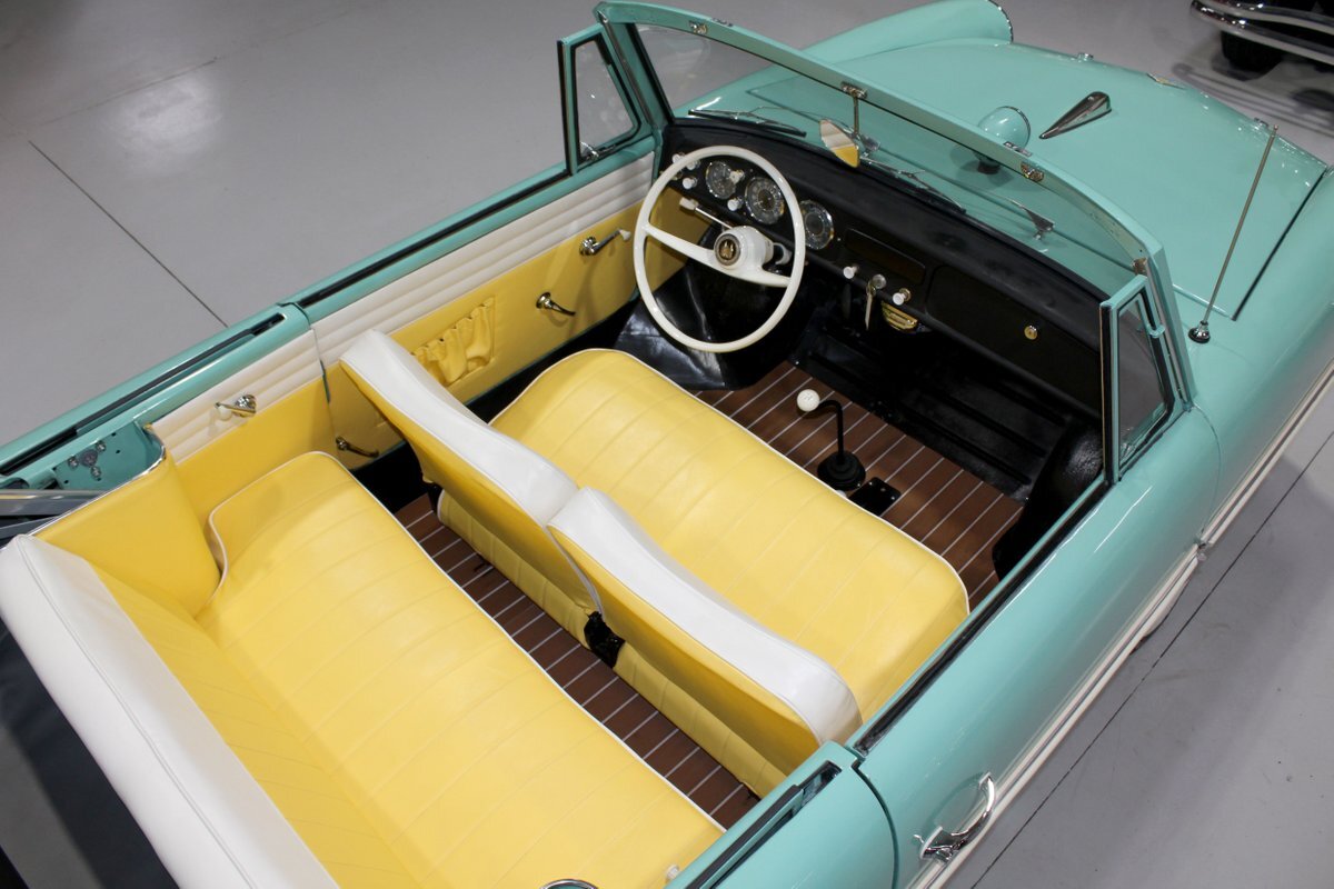 This 1965 Amphicar 770 is a beautifully restored example of the iconic amphibious vehicle that the public could drive to, and into the lake on a gorgeous summer day. Is it a boat or is it a car? It's both, it's an Amphicar! Back in the late 50s, the idea of amphibious vehicles was not particularly novel, especially in the worlds of military and scientific applications. However, the idea of an amphibious motor vehicle for personal use was practically unheard of until a group of West German scientists and engineers reportedly spent 15 years and approximately $25 Million researching and developing the idea. Making its US debut on April 1, 1961 at the Fifth Annual International Auto Show in New York City, the Amphicar was a truly unique automobile. The production version of the Amphicar was based off a concept vehicle designed by Hans Trippel that he had actually displayed at the 1959 Geneva Auto Show. Unlike the concept car that sported a British Austin motor, the production Amphicar was sold with a British Triumph engine. The special land and sea capable transmissions were sourced from the Hermes firm in Germany, who at the time were known for providing the transmissions for another famous German auto maker, Porsche. Perhaps most significantly, the fact that the Amphicar was built on its own platform (as opposed to being built on an existing car or boat) makes this amphibious vehicle particularly extraordinary. Dubbed "the sports car that swims," the Amphicar was touted for its ability to simply drive into water and instantly become a boat, thus being able to be transported without the need of a trailer. Additionally, the 770 model name was said to have come from the Amphicar's ability to travel 7 MPH in the water and 70 MPH on land. Despite the Amphicar's novel design and initial public excitement, they were only produced for a mere 7 years. A combination of weak demand and changes in the tightening EPA and DOT regulations lead to the firm's ultimate downfall. In the 7 year run, a total of approximately 800 Amphicars were produced and of that, only about 600 were sold in the US, which makes these exceptional pieces of automotive history especially desirable and collectible today. The British-sourced 1,147 cc Overhead Valve Inline 4 Cylinder engine is paired with a single barrel Solex carburetor is mounted in the rear of this vehicle and was said to have produced 43 horsepower when new. The 1,147 CC engine is backed by a German-sourced Hermes 4 speed manual transmission that was capable of switching between land and sea driving with the flip of a switch. This Amphicar is equipped with a 12 Volt electrical system which provides an improved startup and overall electrical performance. On land, this 1965 Amphicar 770 rides on a set of radial tires on painted steel rim with wheelcovers and in the sea it is propelled via a pair of propellors underneath the vehicle towards the rear. The white vinyl convertible top is manually operated and it's in fantastic condition. The exterior on this Amphicar has been refinished in a beautiful Fjord Green that just has a great look for such an eccentric vehicle. Superb chrome and brightwork around the exterior of this Amphicar 770 completes its exterior appearance. The interior on this Amphicar is absolutely fantastic! The front and rear bench seats, and door panels have all been beautifully reupholstered in a two-tone color scheme consisting of Yellow and White Vinyl. The dash, woodgrain floor, and steering wheel are all in wonderful condition as well and all appear to be in their stock configuration. The dash is outfitted with a 90 MPH speedometer, temperature gauge, and fuel gauge, along with a clock. An Equus temperature gauge is also mounted neatly under the dash as well. Whether you're adding to your existing collection or you're buying your first classic car, this 1965 Amphicar 770 would make an excellent choice. Give us a call today!