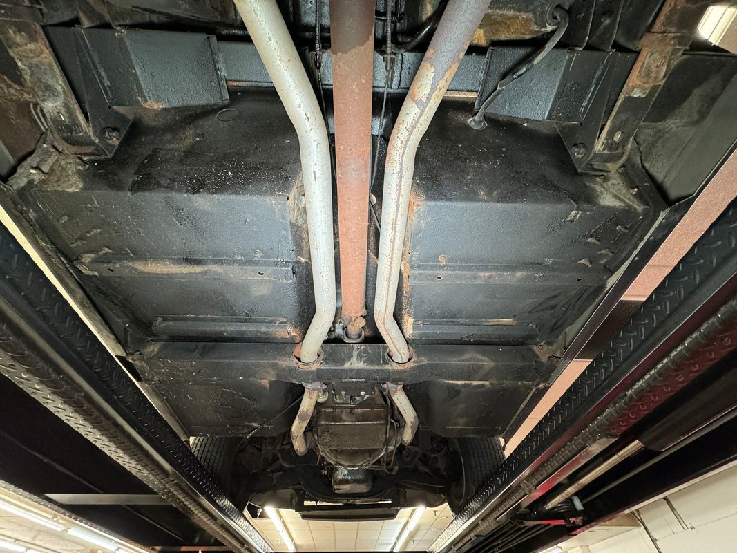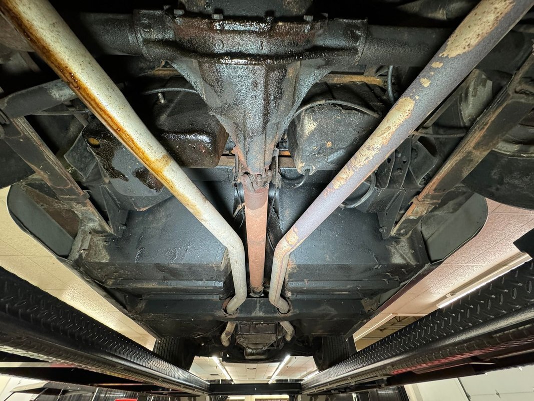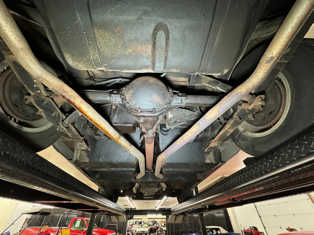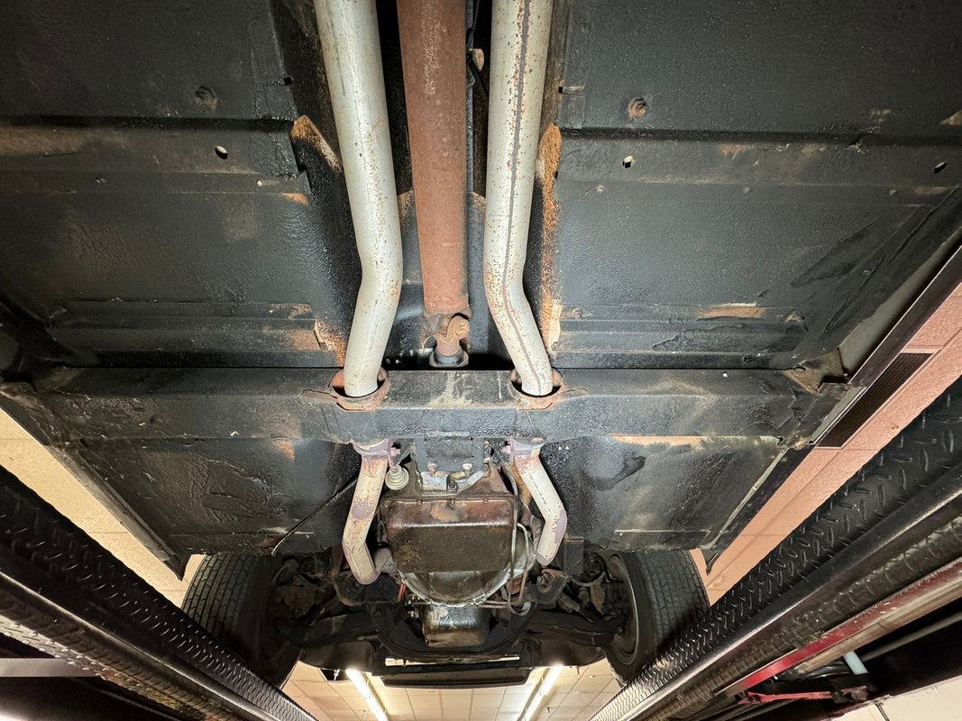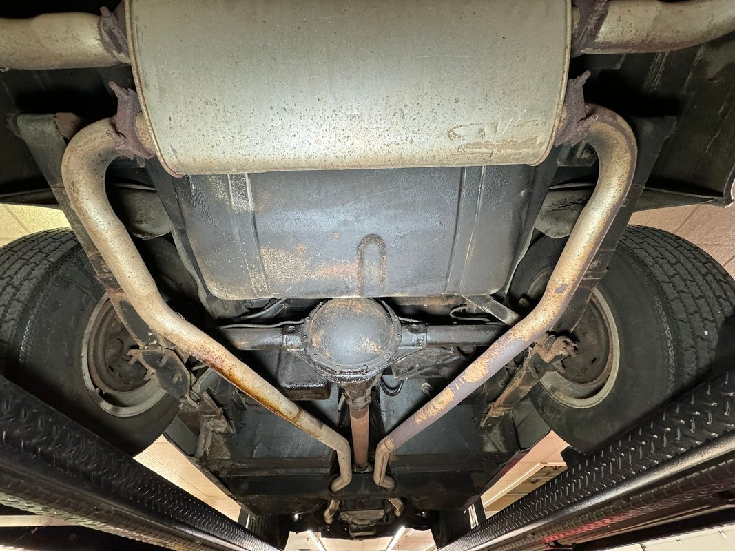 Some surface rust and plenty of patina is noted on the unibody undercarriage. All suspension, (independent coil springs up front and leaf springs on the rear), is in good condition. Power disc brakes for the front and power drums for the rear are noted. The exhaust pipes are very slightly rusted but still very solid.
