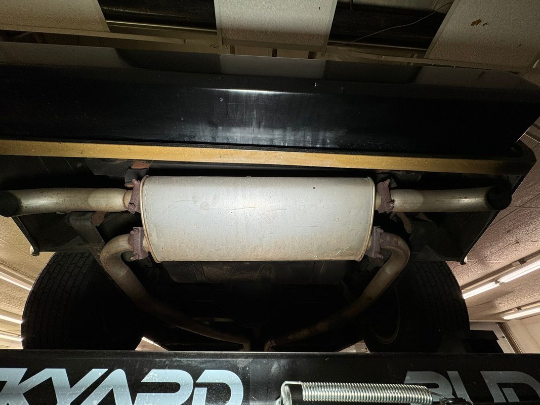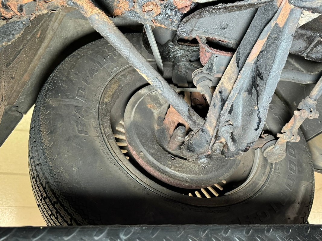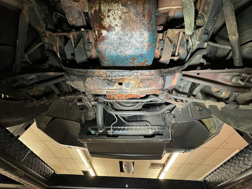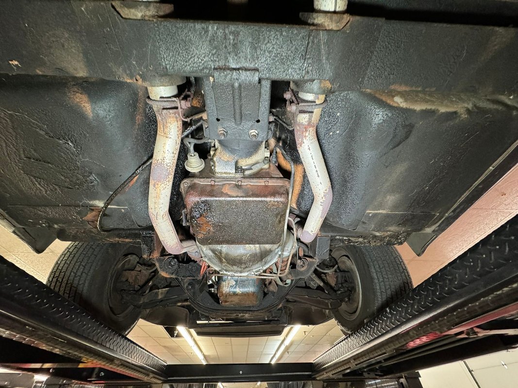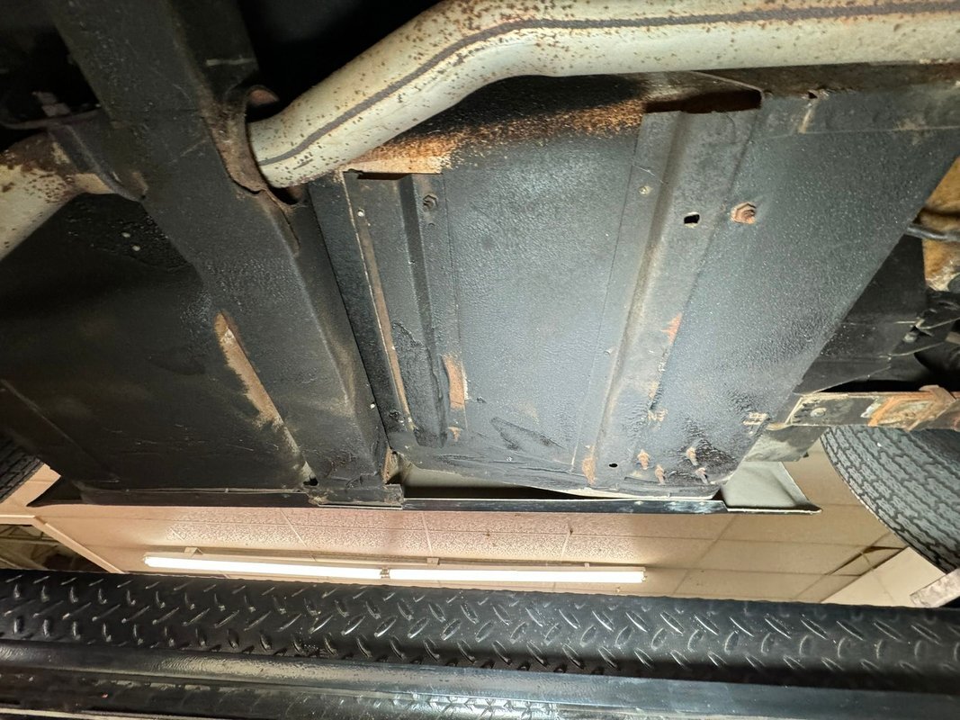 Some surface rust and plenty of patina is noted on the unibody undercarriage. All suspension, (independent coil springs up front and leaf springs on the rear), is in good condition. Power disc brakes for the front and power drums for the rear are noted. The exhaust pipes are very slightly rusted but still very solid.