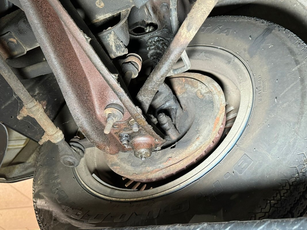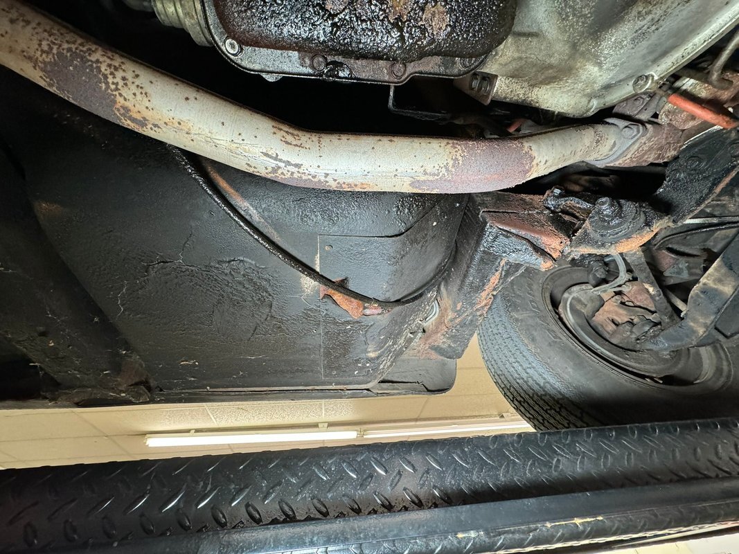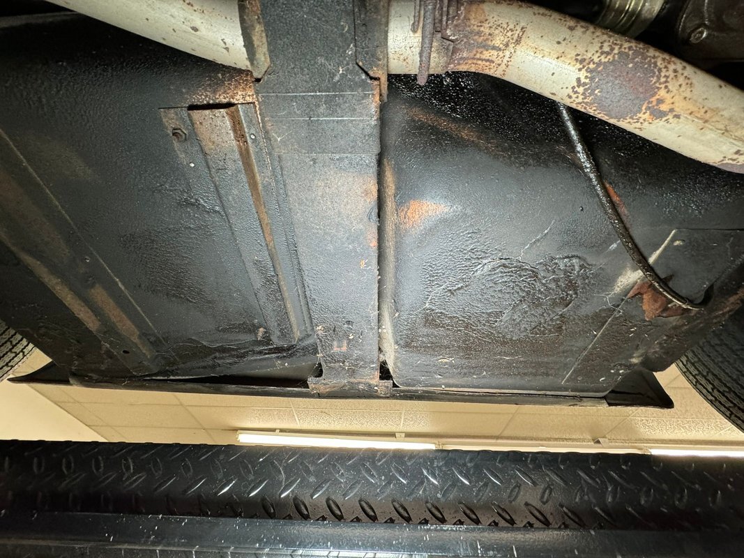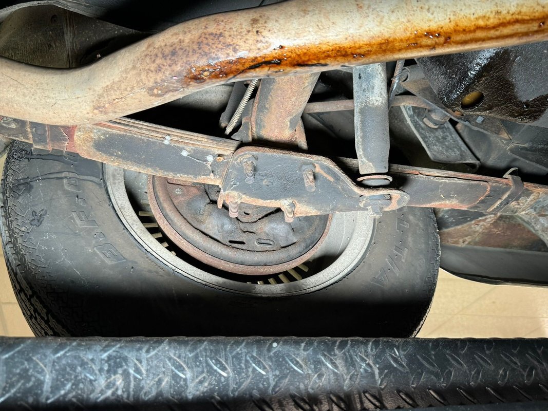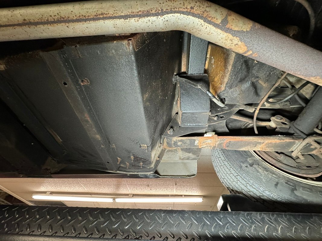 Some surface rust and plenty of patina is noted on the unibody undercarriage. All suspension, (independent coil springs up front and leaf springs on the rear), is in good condition. Power disc brakes for the front and power drums for the rear are noted. The exhaust pipes are very slightly rusted but still very solid.
