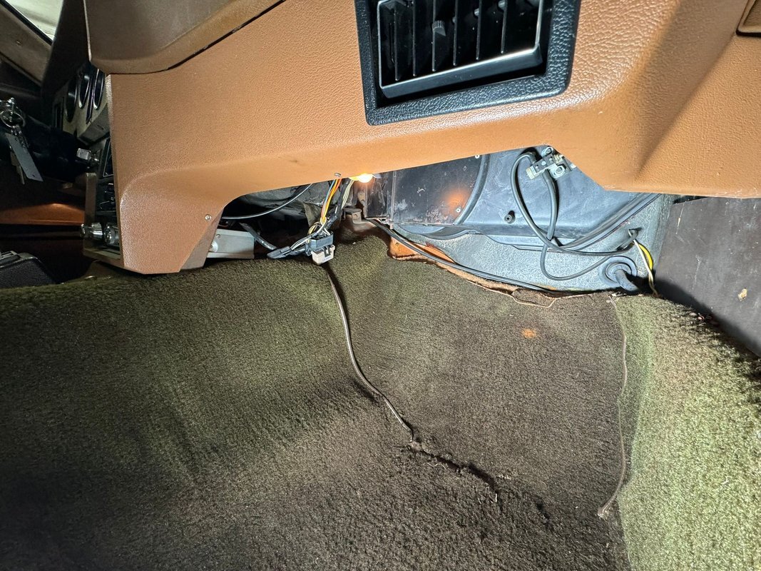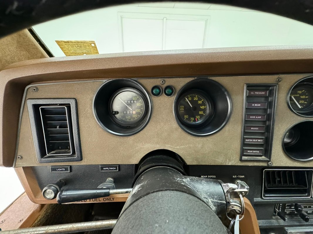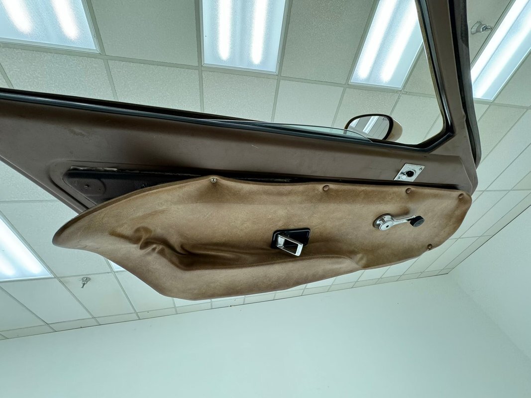 A lift of the doors, actually they open on their own with the press of a button, and we see Phoenix Brown, (the only color available), vinyl bolsters with square paneled buttoned suede-like inserts all on high back buckets. A vinyl wrapped center console houses the handbrake, door opening switches and door lock toggles. In front of this, towards the dash is another molded panel which has a place for the shifter. A faux leather tan textured dash front has the instruments and plenty of warning lights, along with air flow controls and a radio. Mustard vinyl is molded around this insert and created the upper dash, and the overall frame for the complete dash. On the lower portion of the dash is a butterscotch colored insert that runs to the passenger side. Faded brown carpeting carpet covers the floors and rear hatchback area and smooth vinyl covers the headliner and pillar trim, as well as door panels. A rally steering wheel is fronting the dash and appears to be original to this car. Noted door panels are coming off at their aft edges.