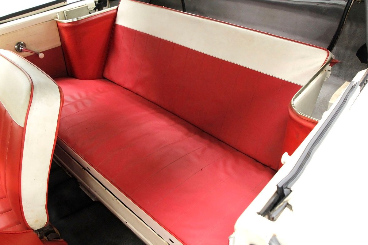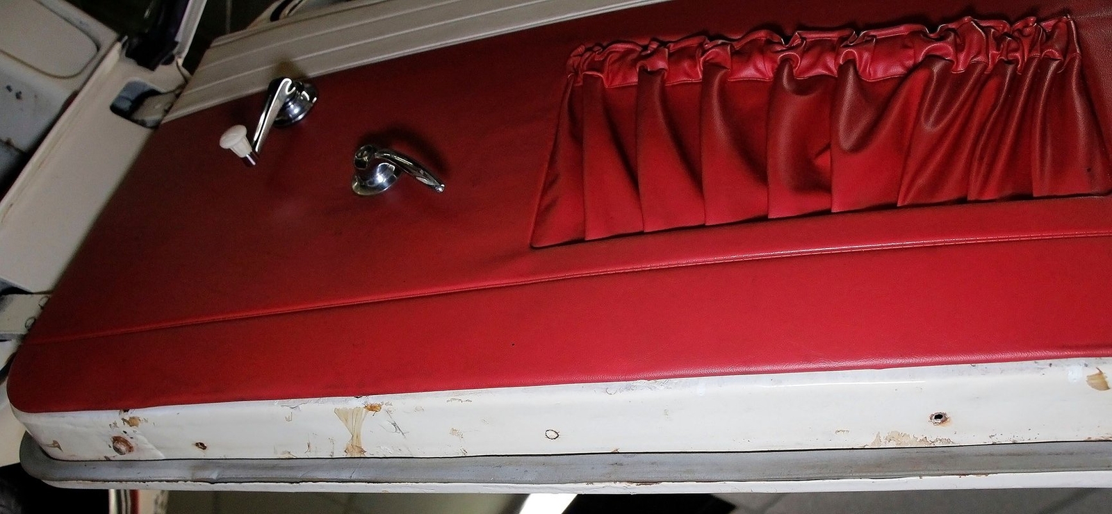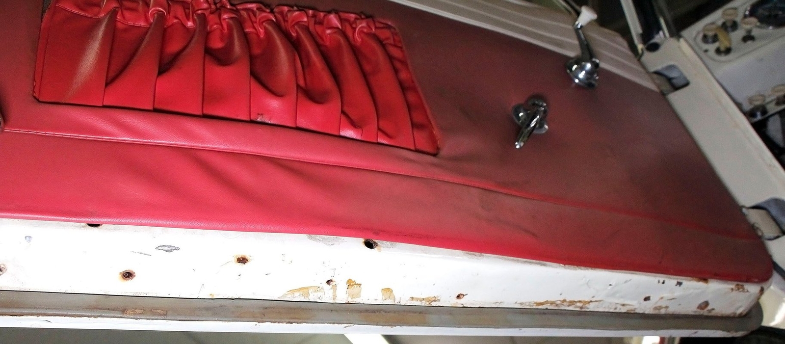 2+2 seating in red vinyl tuck and roll inserts, and white bolsters are wrapped with red piping. Seating shows slight wear in areas on the seat. Door panels are red vinyl and have white vinyl above which is slightly soiled. A white dash, and original steering wheel are in good condition with pitting and early signs of rust on the bezels. Clean ribbed rubber flooring "floods" the floors and offers easy water cleanup. All ashore that's going ashore!