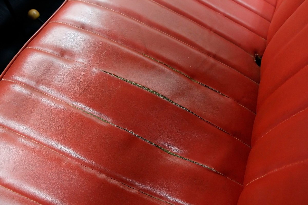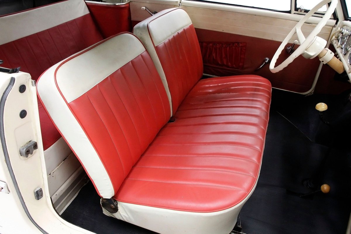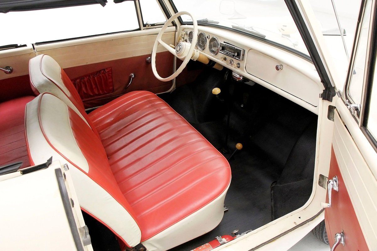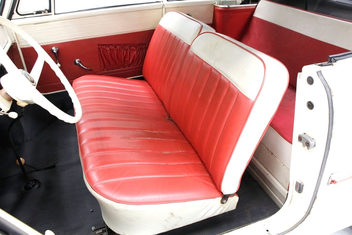 2+2 seating in red vinyl tuck and roll inserts, and white bolsters are wrapped with red piping. Seating shows slight wear in areas on the seat. Door panels are red vinyl and have white vinyl above which is slightly soiled. A white dash, and original steering wheel are in good condition with pitting and early signs of rust on the bezels. Clean ribbed rubber flooring "floods" the floors and offers easy water cleanup. All ashore that's going ashore!