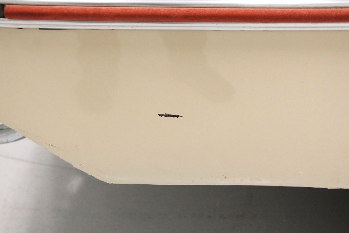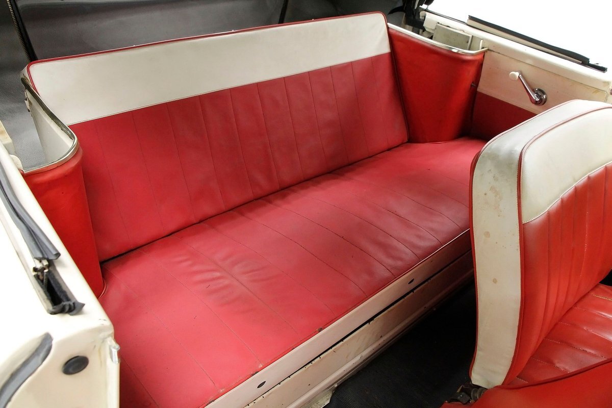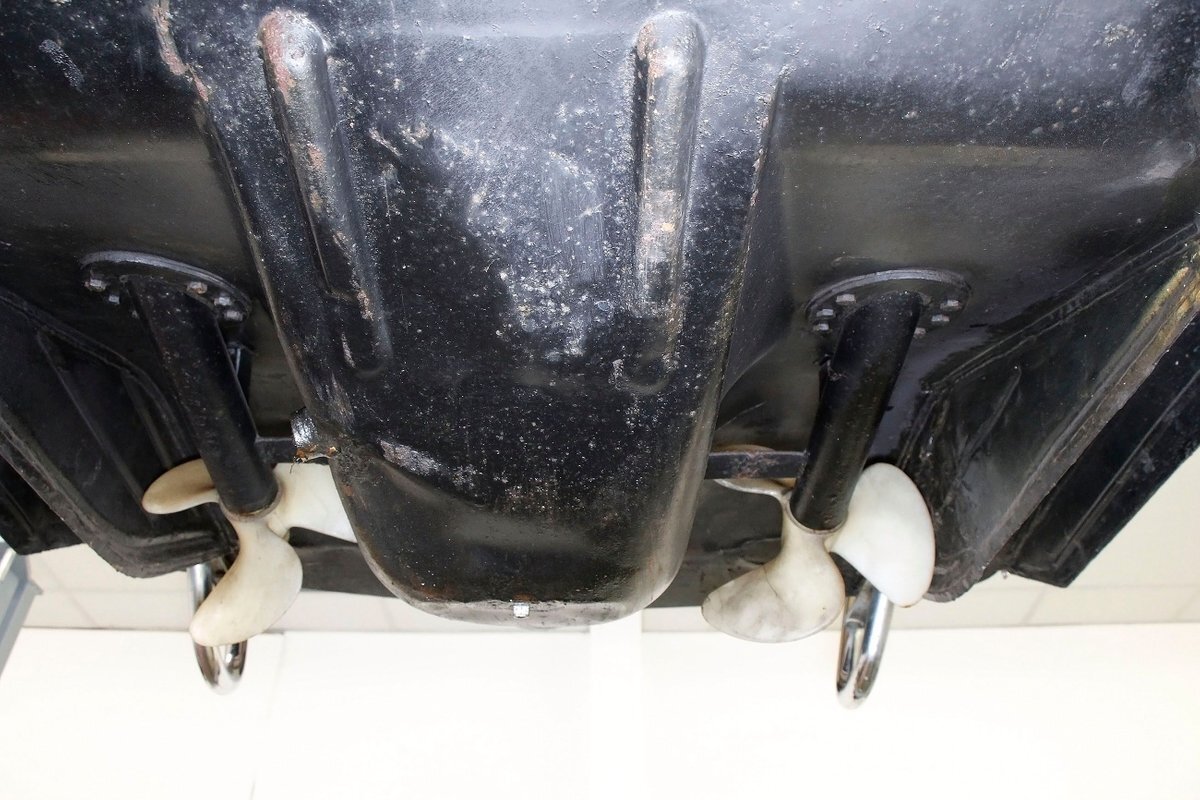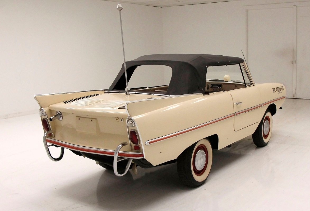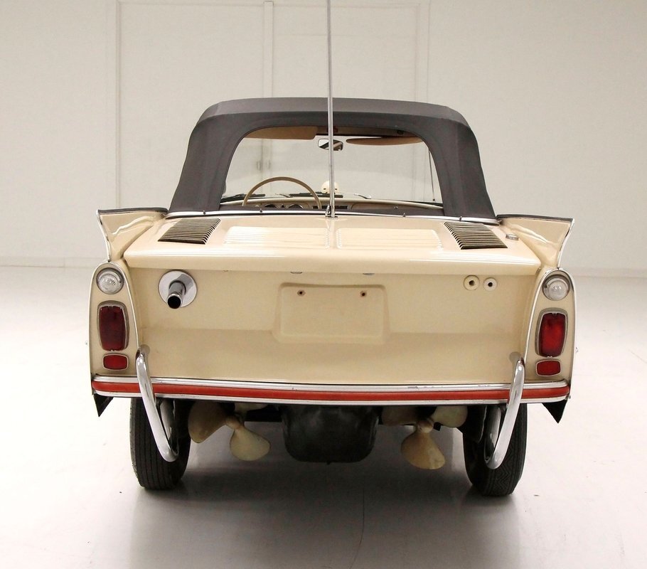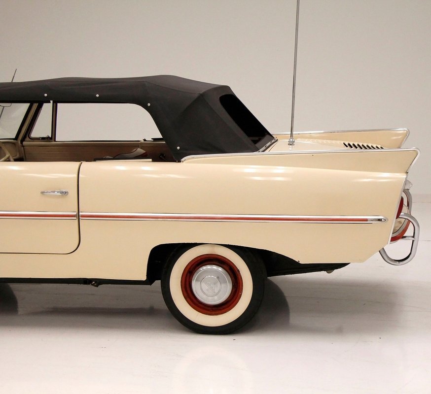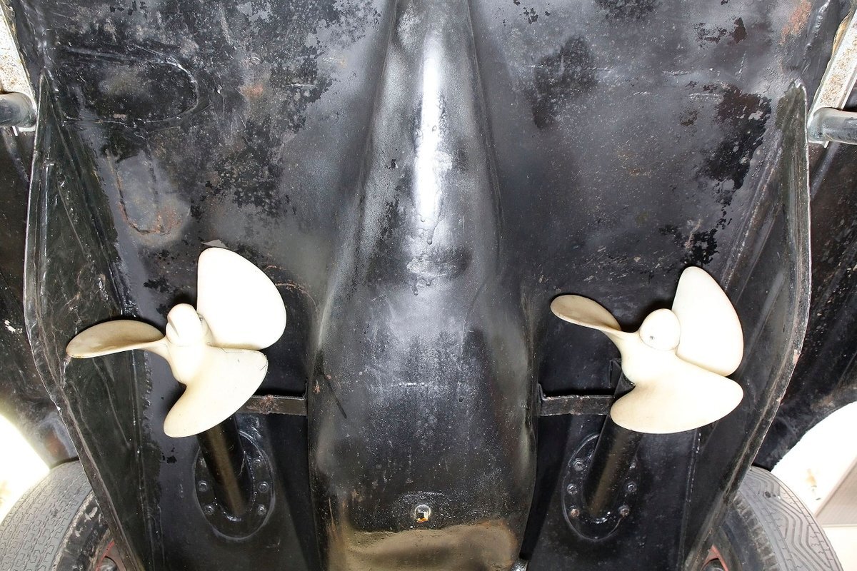 "Bathed" in Beach Sand White, all steel panels on the hull are showing some bubbling rust at the rockers, chips and scratches in the paint and slight panel misalignment. Chrome is good, and a black convertible canvas top has a slight seam rip on the passenger rear of the top. The plastic rear window is mostly clear. With its boat like bow front in a point, to the Coast Guard approved and necessary port/starboard light, and navigation lamps. A removable all-around white light is on a long stem on the stern. Small "fins" are seen on the rear of the car, although they have nothing to do with the maneuvering of the car when it is in the water. A nifty chrome ring with a chromed exhaust tailpipe, sticks out the rear panel above the waterline. A trim spear in red is on the sides and is showing some dry rotting. Red painted steel wheels wrapped in wide whites and shiny dog dish wheel covers are on all 4 corners. Peeking below twin screws are seen to propel you through the water, when the transmission is disengaged from the rear wheels. Full speed ahead captain, full speed ahead.