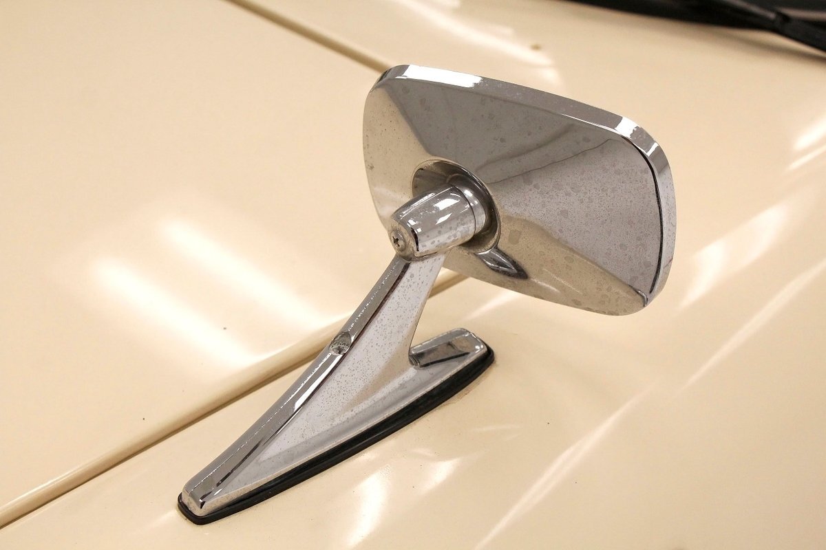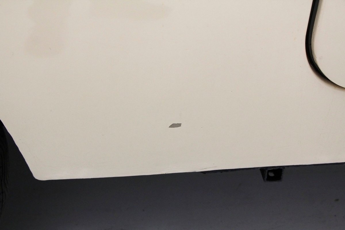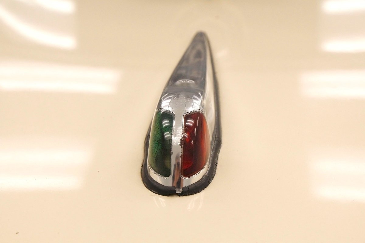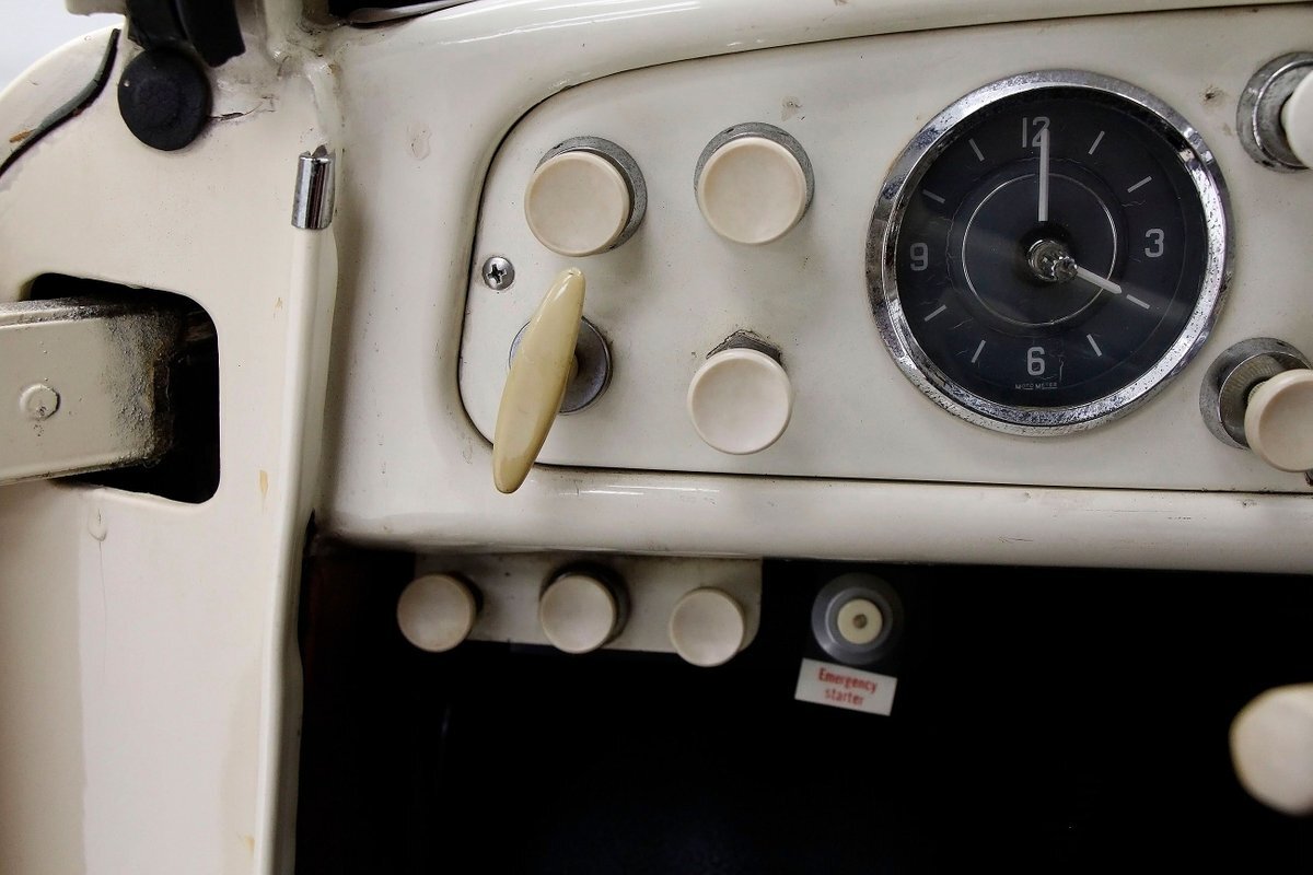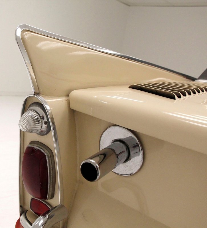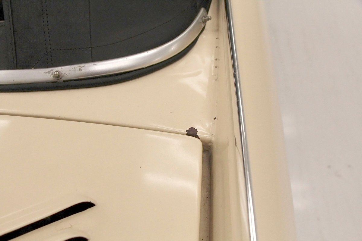 "Bathed" in Beach Sand White, all steel panels on the hull are showing some bubbling rust at the rockers, chips and scratches in the paint and slight panel misalignment. Chrome is good, and a black convertible canvas top has a slight seam rip on the passenger rear of the top. The plastic rear window is mostly clear. With its boat like bow front in a point, to the Coast Guard approved and necessary port/starboard light, and navigation lamps. A removable all-around white light is on a long stem on the stern. Small "fins" are seen on the rear of the car, although they have nothing to do with the maneuvering of the car when it is in the water. A nifty chrome ring with a chromed exhaust tailpipe, sticks out the rear panel above the waterline. A trim spear in red is on the sides and is showing some dry rotting. Red painted steel wheels wrapped in wide whites and shiny dog dish wheel covers are on all 4 corners. Peeking below twin screws are seen to propel you through the water, when the transmission is disengaged from the rear wheels. Full speed ahead captain, full speed ahead.