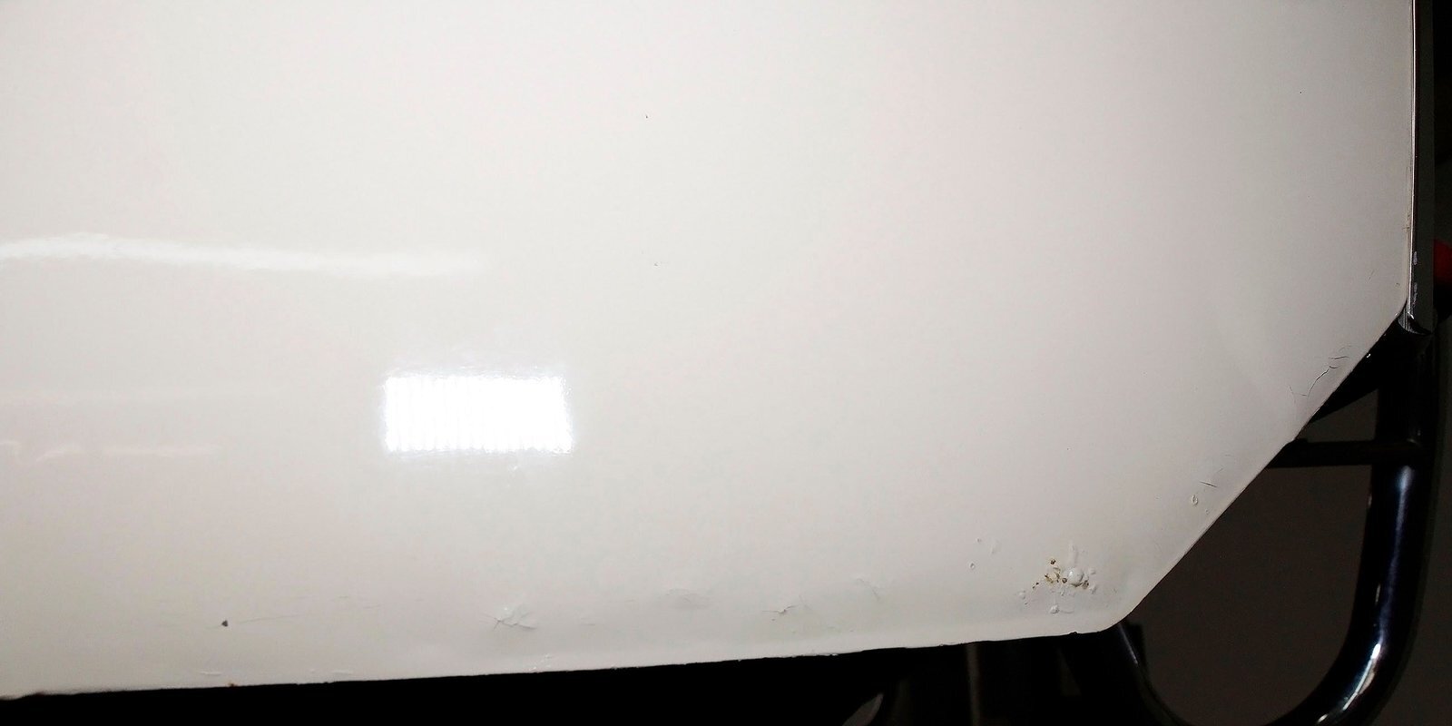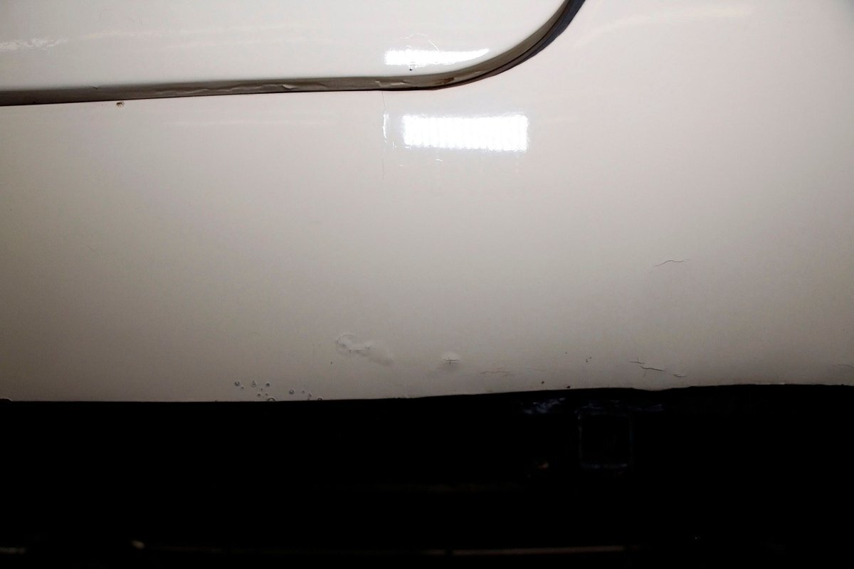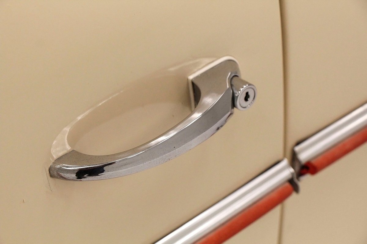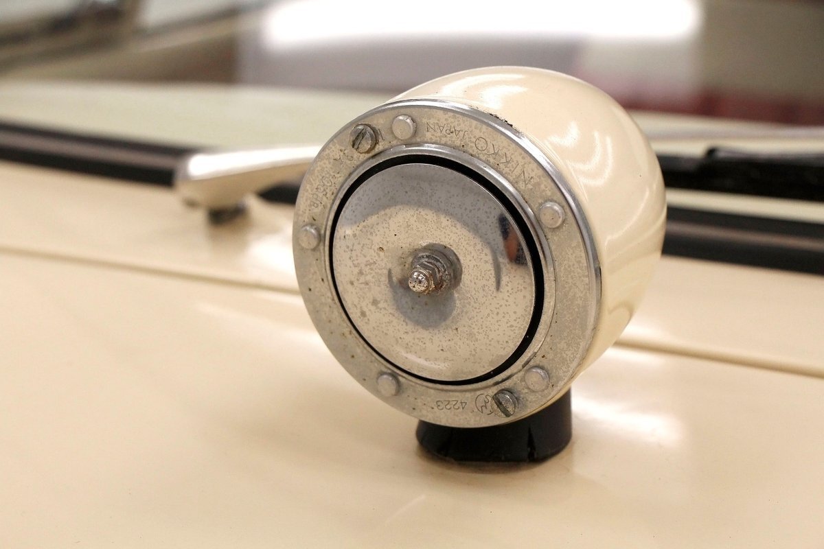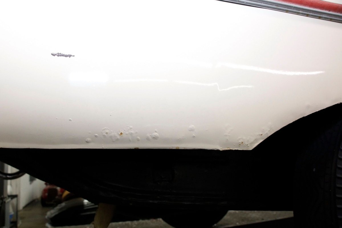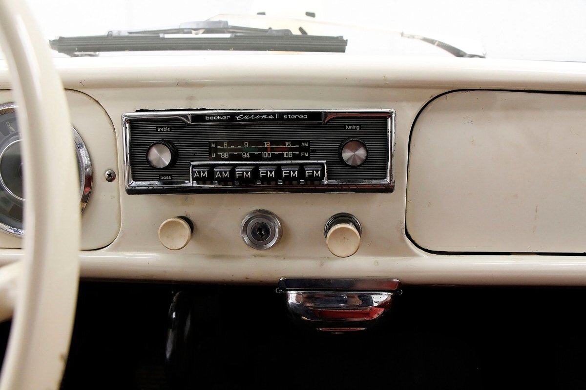 "Bathed" in Beach Sand White, all steel panels on the hull are showing some bubbling rust at the rockers, chips and scratches in the paint and slight panel misalignment. Chrome is good, and a black convertible canvas top has a slight seam rip on the passenger rear of the top. The plastic rear window is mostly clear. With its boat like bow front in a point, to the Coast Guard approved and necessary port/starboard light, and navigation lamps. A removable all-around white light is on a long stem on the stern. Small "fins" are seen on the rear of the car, although they have nothing to do with the maneuvering of the car when it is in the water. A nifty chrome ring with a chromed exhaust tailpipe, sticks out the rear panel above the waterline. A trim spear in red is on the sides and is showing some dry rotting. Red painted steel wheels wrapped in wide whites and shiny dog dish wheel covers are on all 4 corners. Peeking below twin screws are seen to propel you through the water, when the transmission is disengaged from the rear wheels. Full speed ahead captain, full speed ahead.