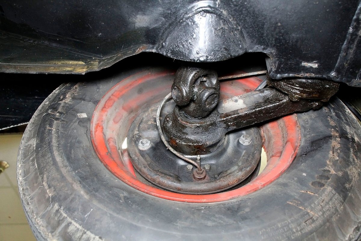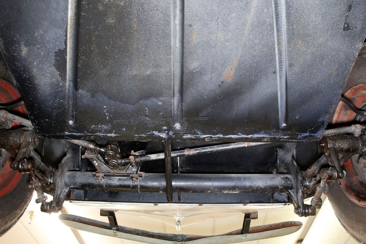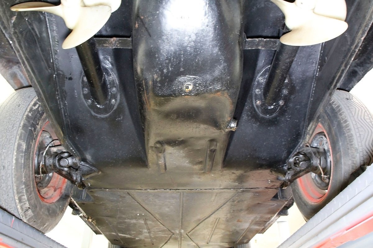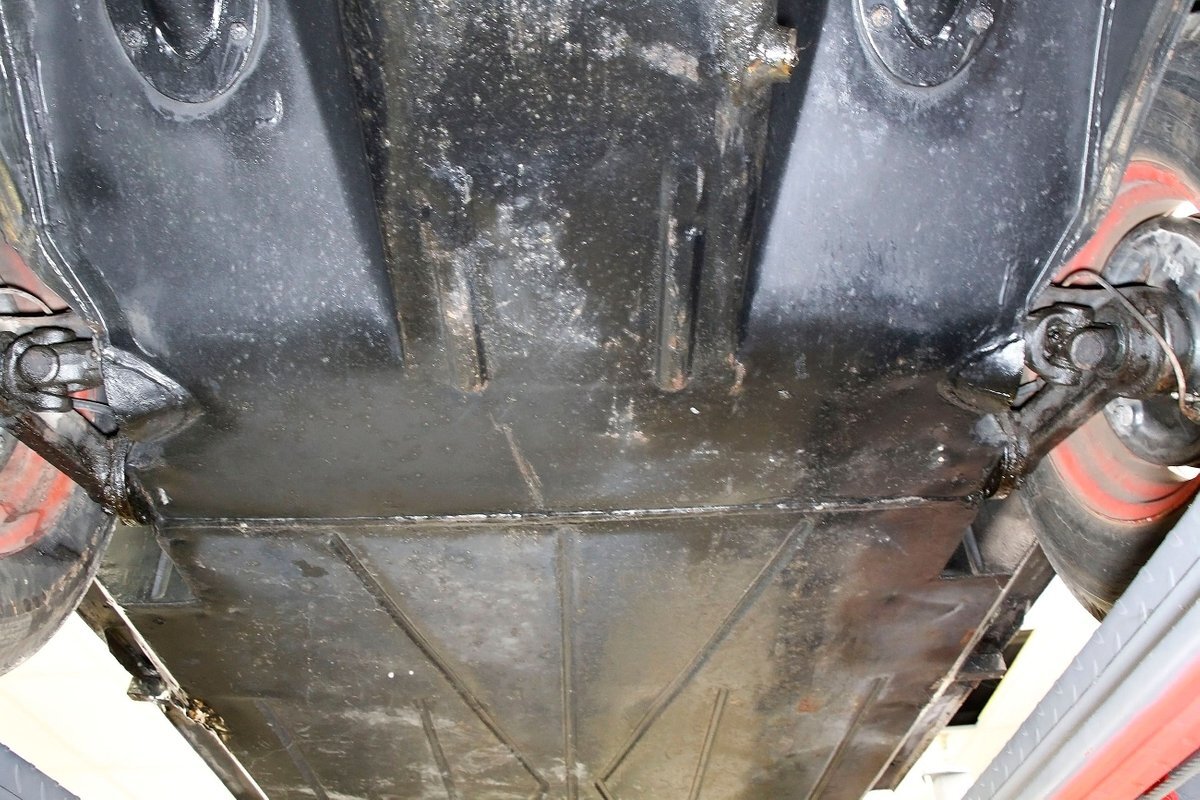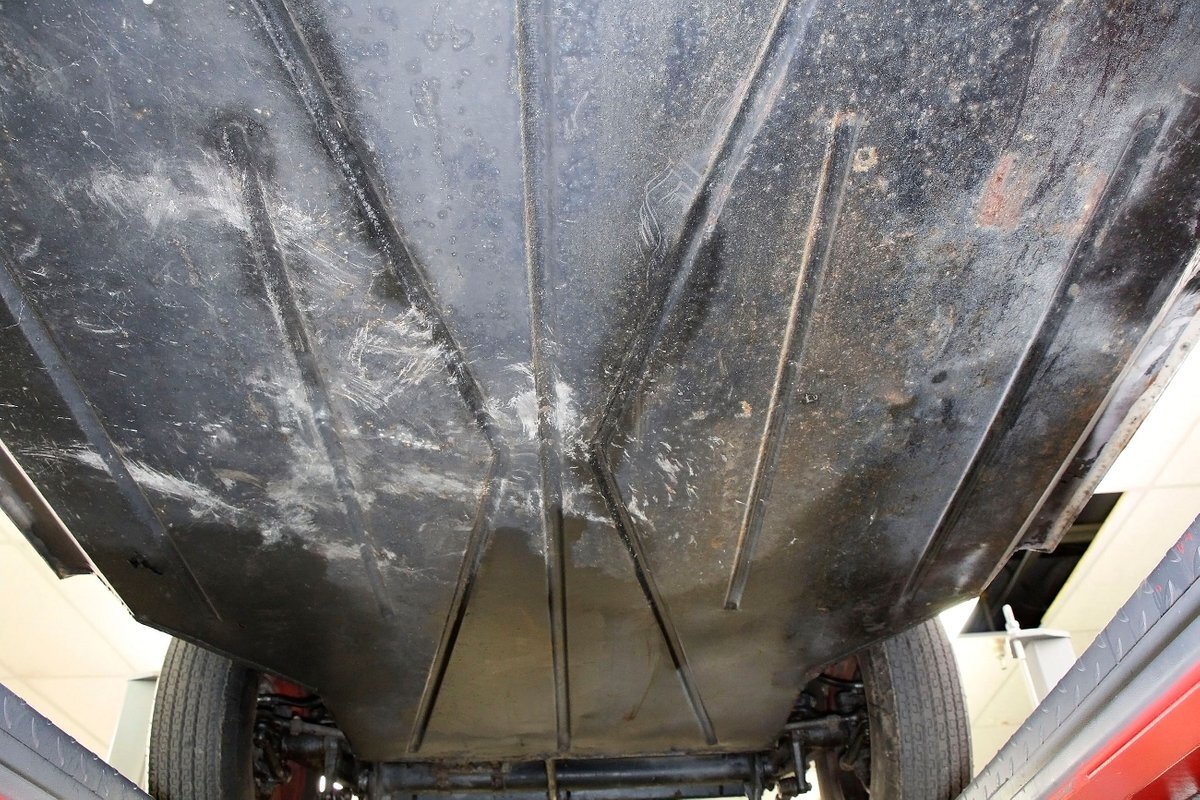 A look at the hull from underneath, and it is all sealed up with no rust. Suspension is mostly covered with metal, and 4-wheel drum brakes have rubber seals within to protect them when in the water. Under side of lower doors show some rust drippings but nothing remarkable. That's the scuttlebutt on the underpinnings.