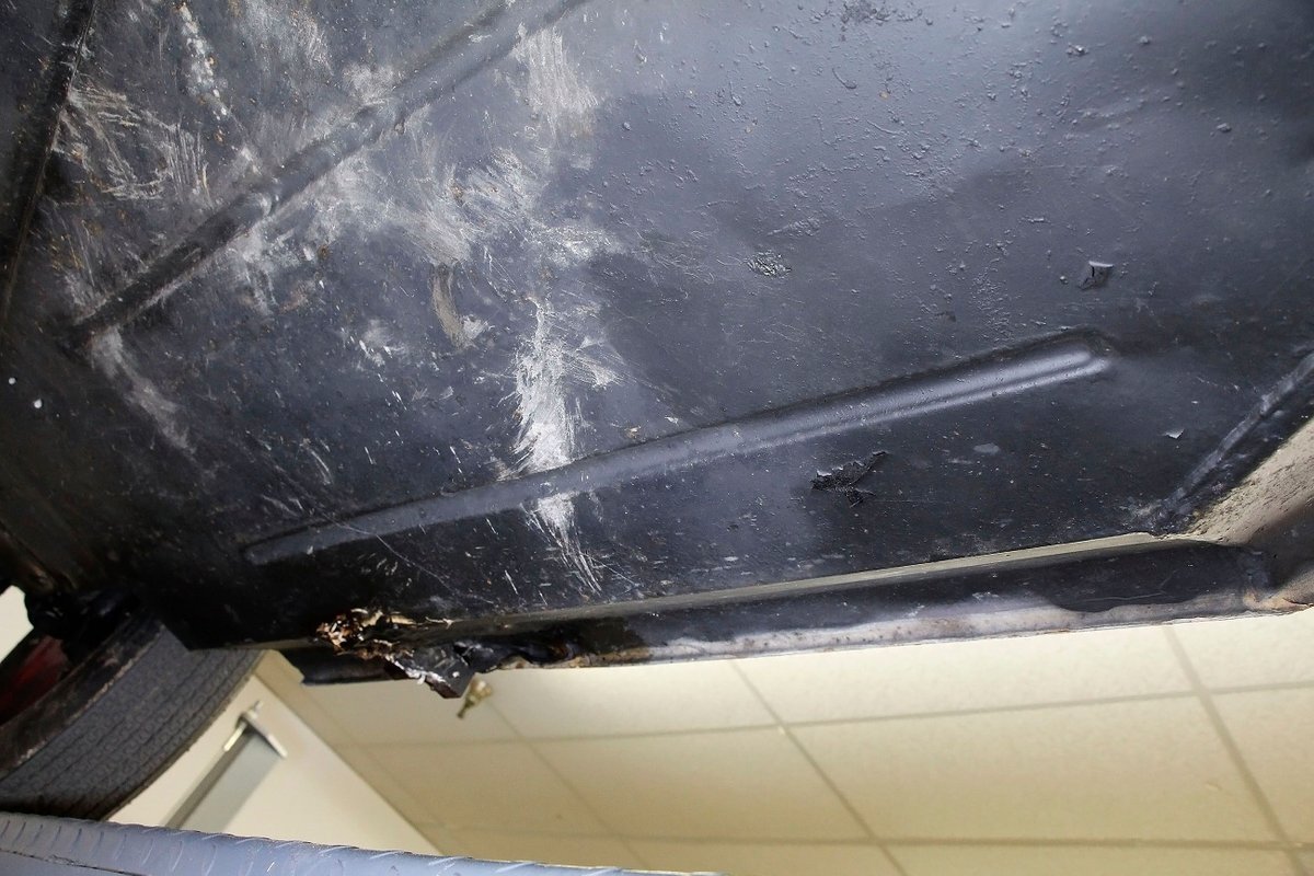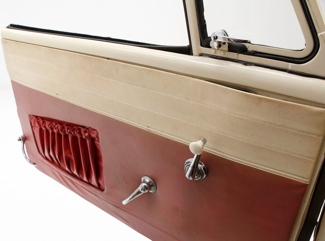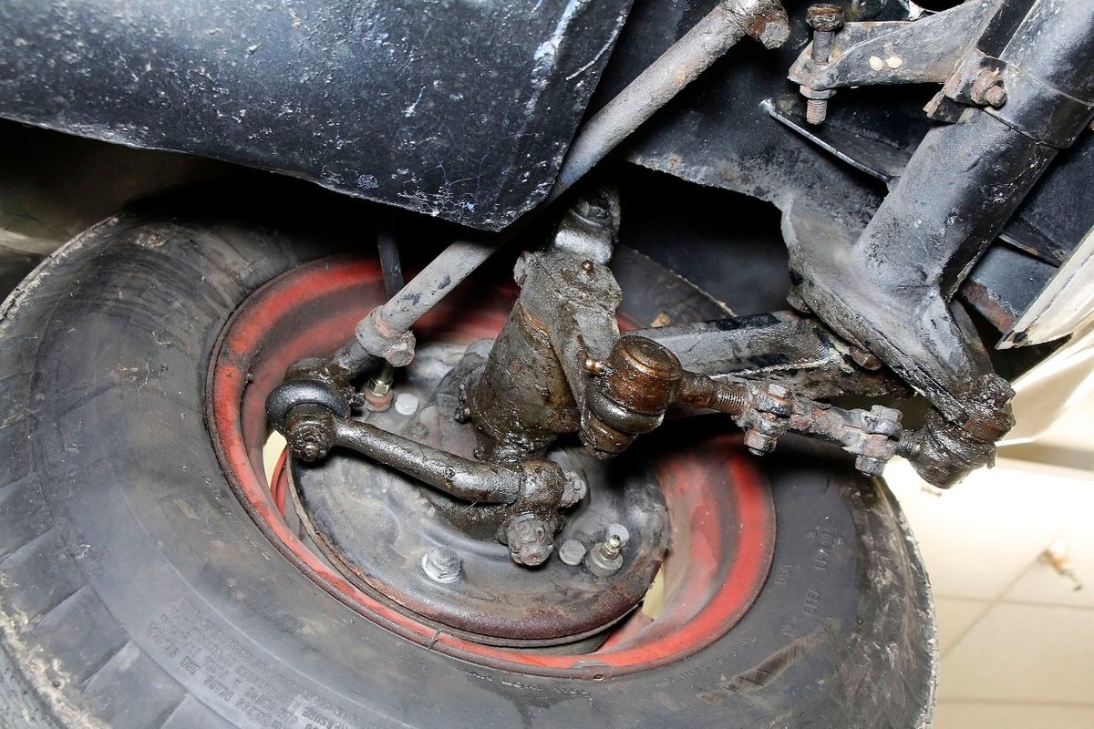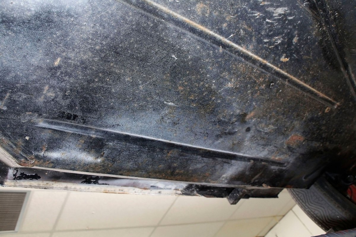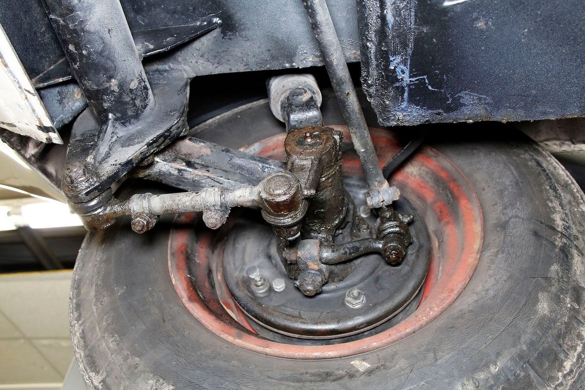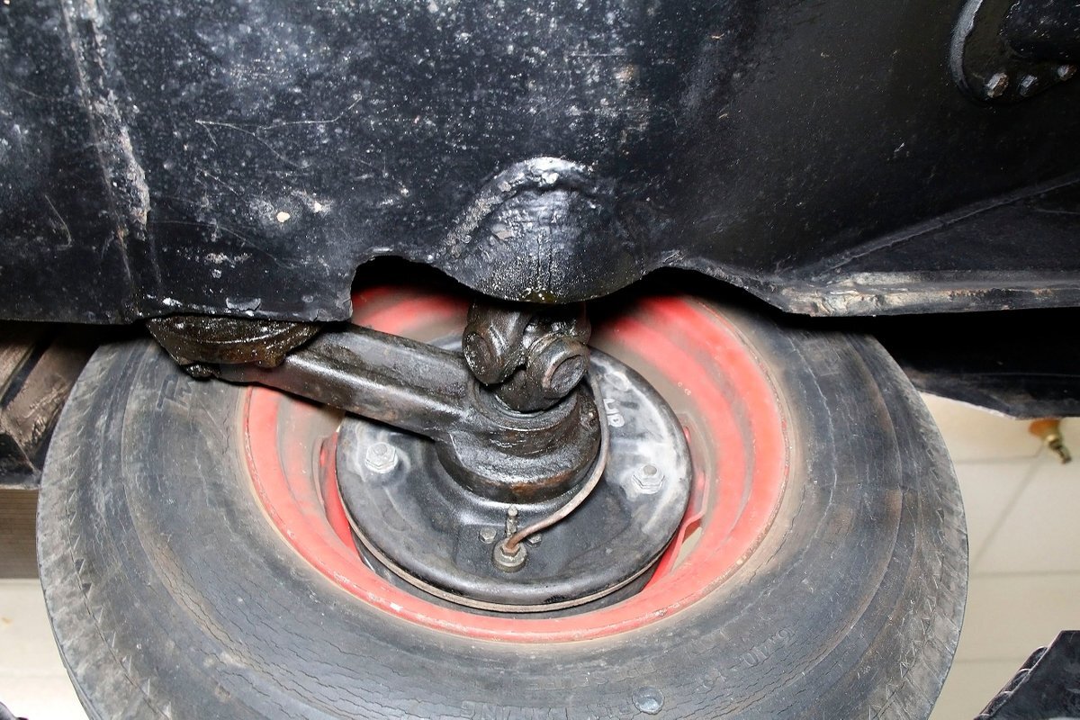 A look at the hull from underneath, and it is all sealed up with no rust. Suspension is mostly covered with metal, and 4-wheel drum brakes have rubber seals within to protect them when in the water. Under side of lower doors show some rust drippings but nothing remarkable. That's the scuttlebutt on the underpinnings.