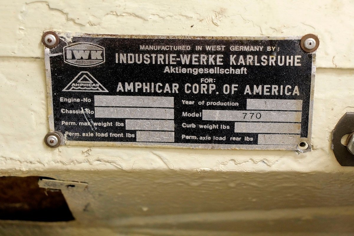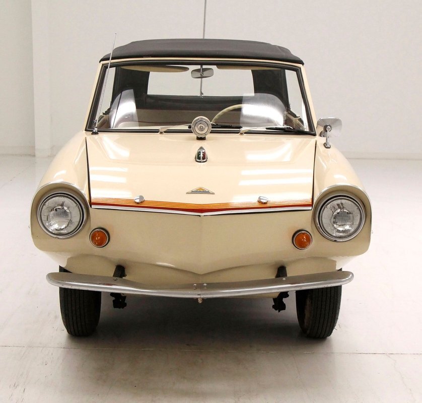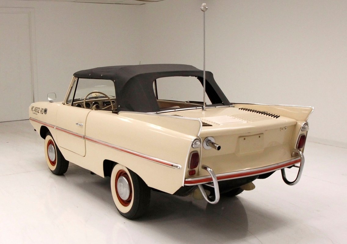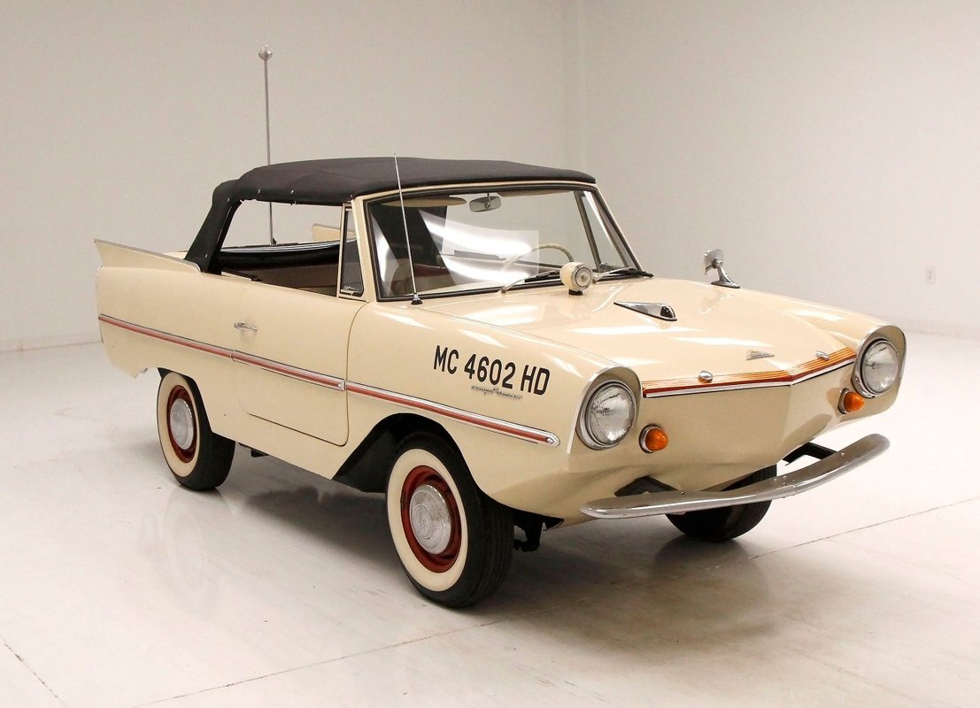 The Amphicar Model 770 was developed by German designer Hans Tippel who had been working on an amphibious vehicle since 1932 including the WW2 Volkswagen Schwimmerwagen. The Amphicar first surfaced at the 1959 German Auto Show, then came ashore on April 1st, 1961 at the New York Auto Show.