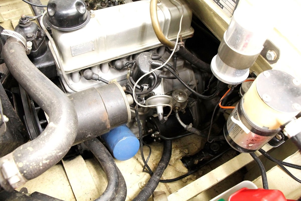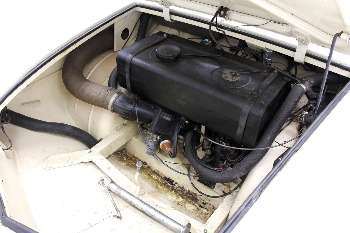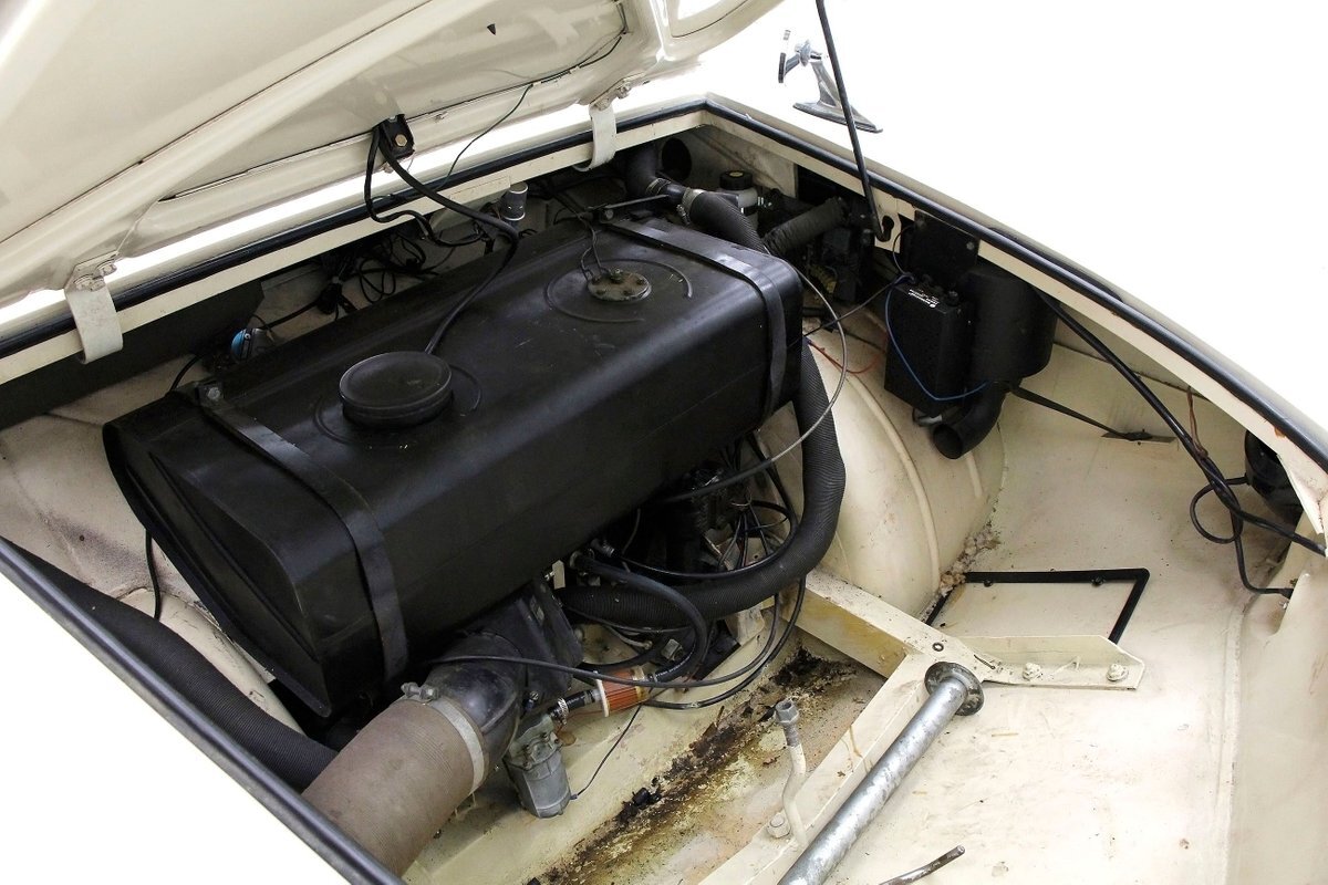 A flip of the side hinged rear vented deck reveals a fairly clean engine bay, and a 70ci Triumph Herald 4-cylinder engine swimming within. It is topped with a 1-barrel carburetor (no air cleaner) and has a 4-speed manual transmission attached. A dual purpose 4.72 geared rear runs both the propellers and the rear wheels (separately). If you said this car is fast on land and water, I'd say you are all wet.