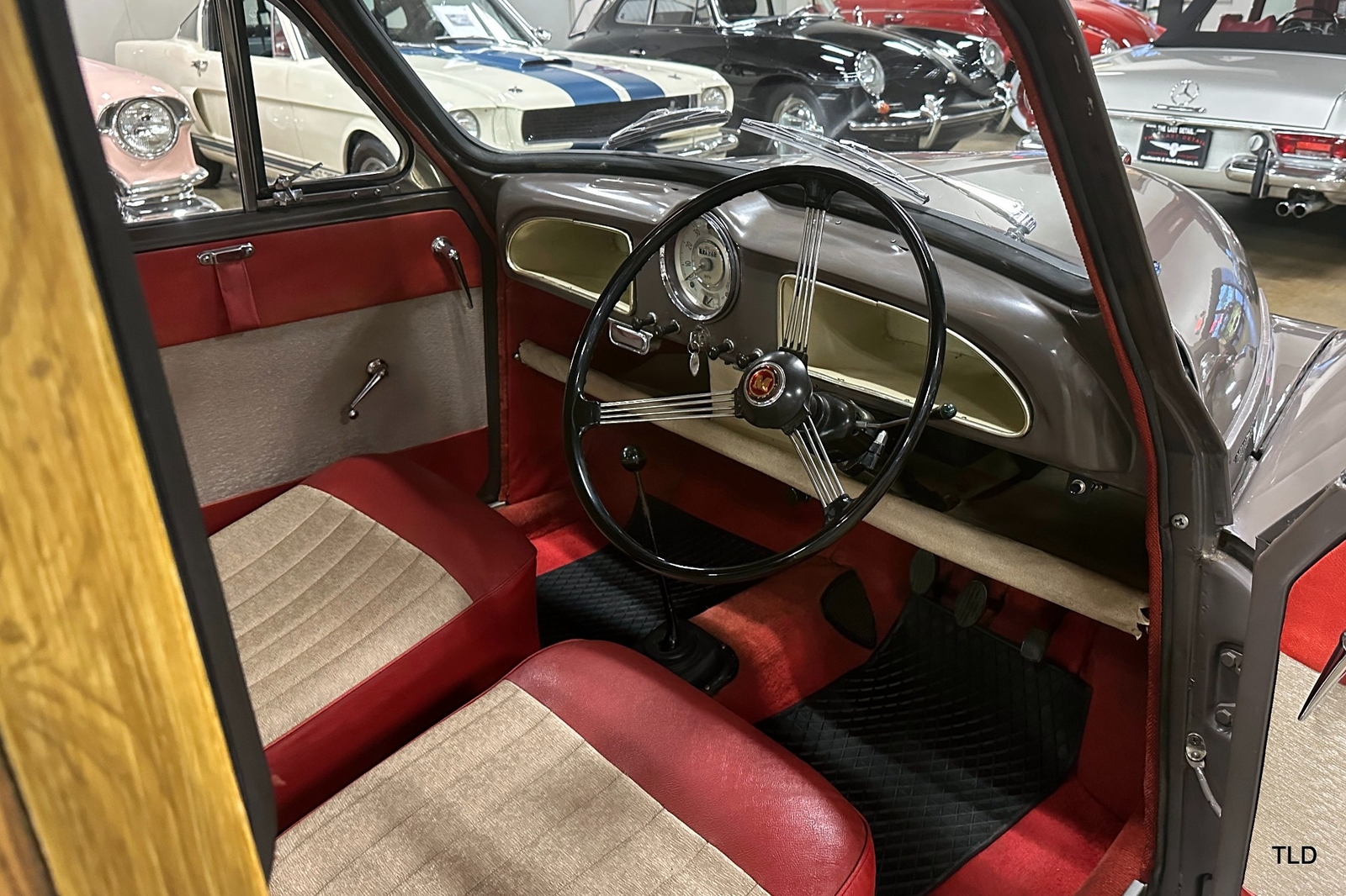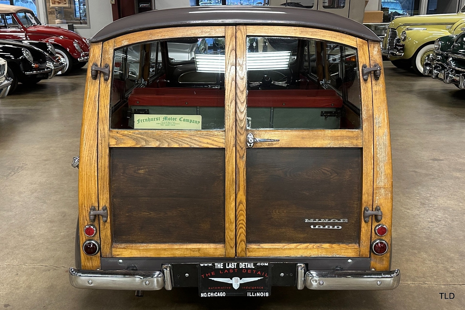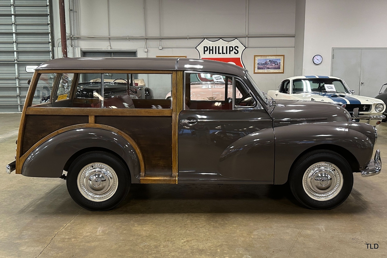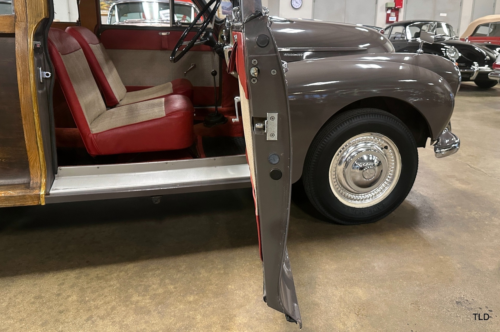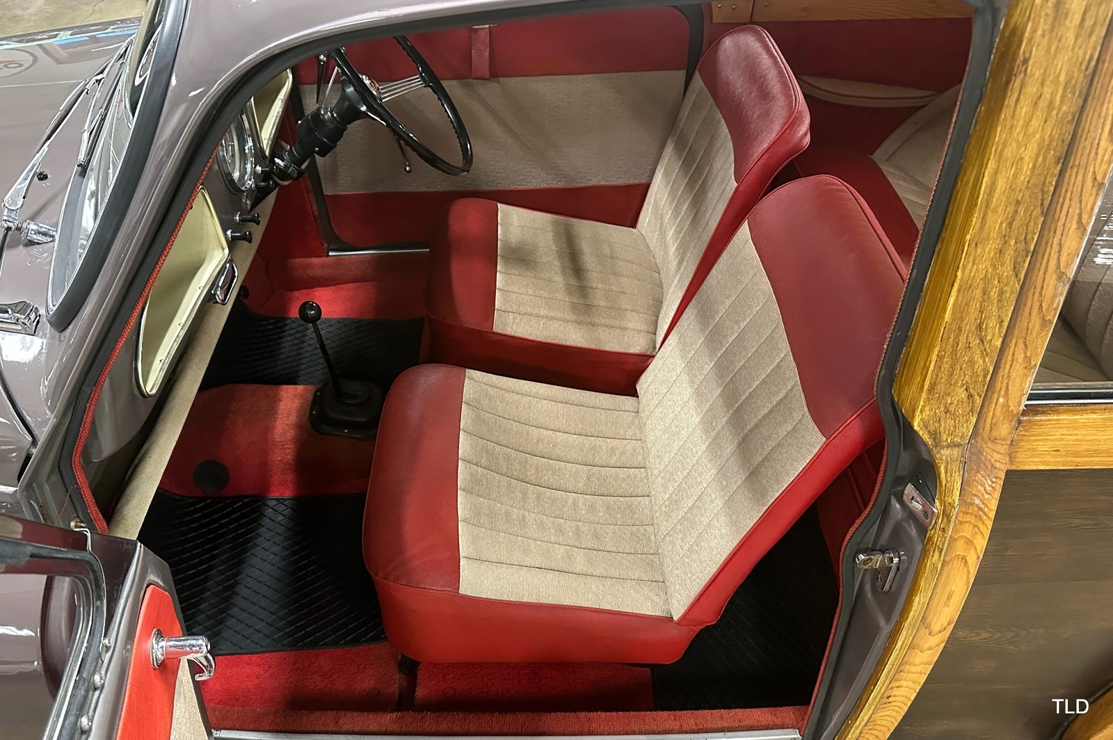 The Traveller's versatile Beige and Red 2-tone interior includes front bucket seats, an 80-mph speedometer, a rear bench seat, and roomy cargo compartment. Complete bright trim, full wheel covers, and period style Blackwall tires compete the exterior. An interesting additional feature is the British dealer sticker affixed to a rear window. Chic, cheeky, and exceptionally well preserved, this highly original 1965 Morris Minor 1000 Traveller Estate Wagon is a great example of the immensely successful Minor. Be sure to contact us today to see it for yourself, obtain full details, and get ready to add this wonderful British Woodie to your collection.