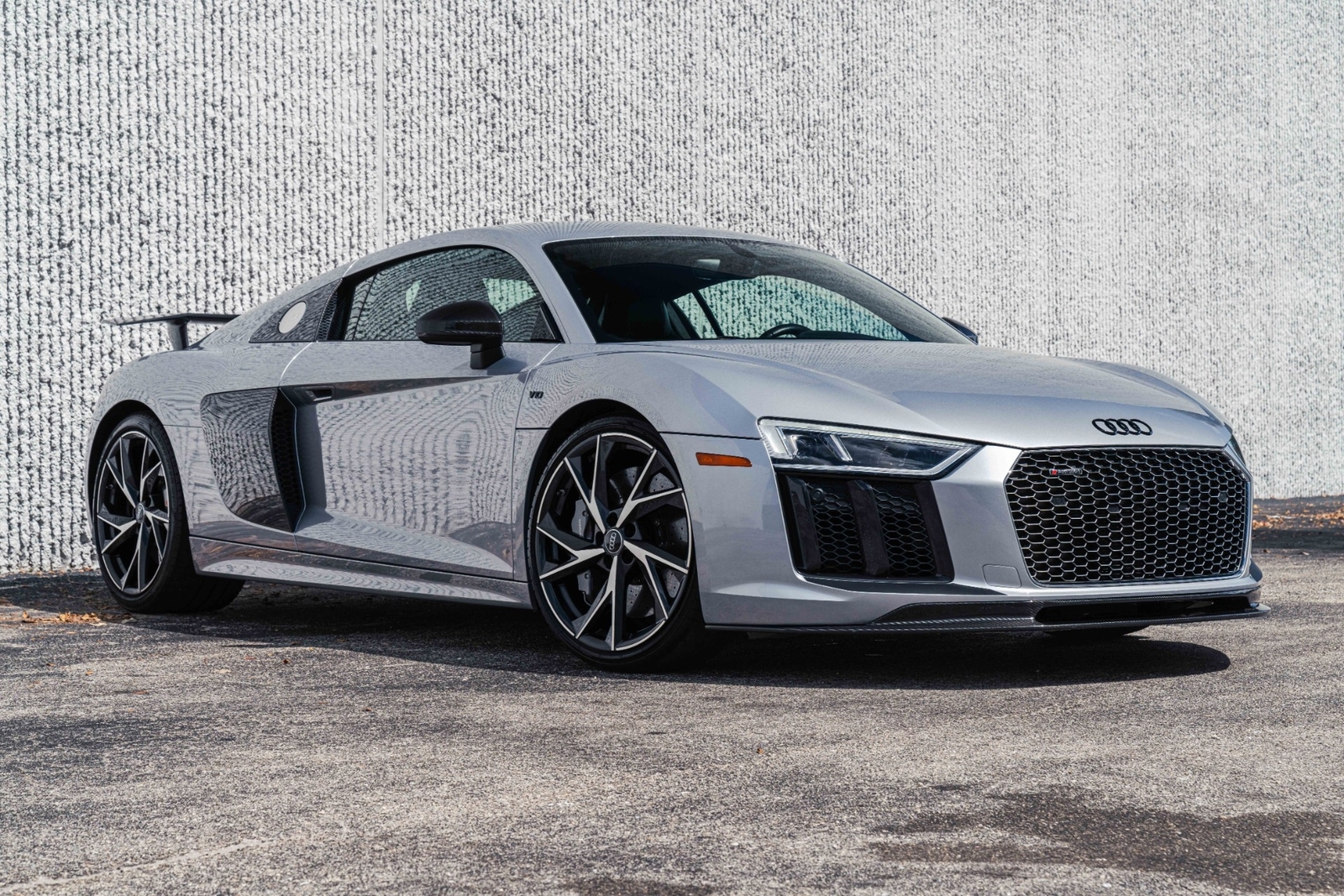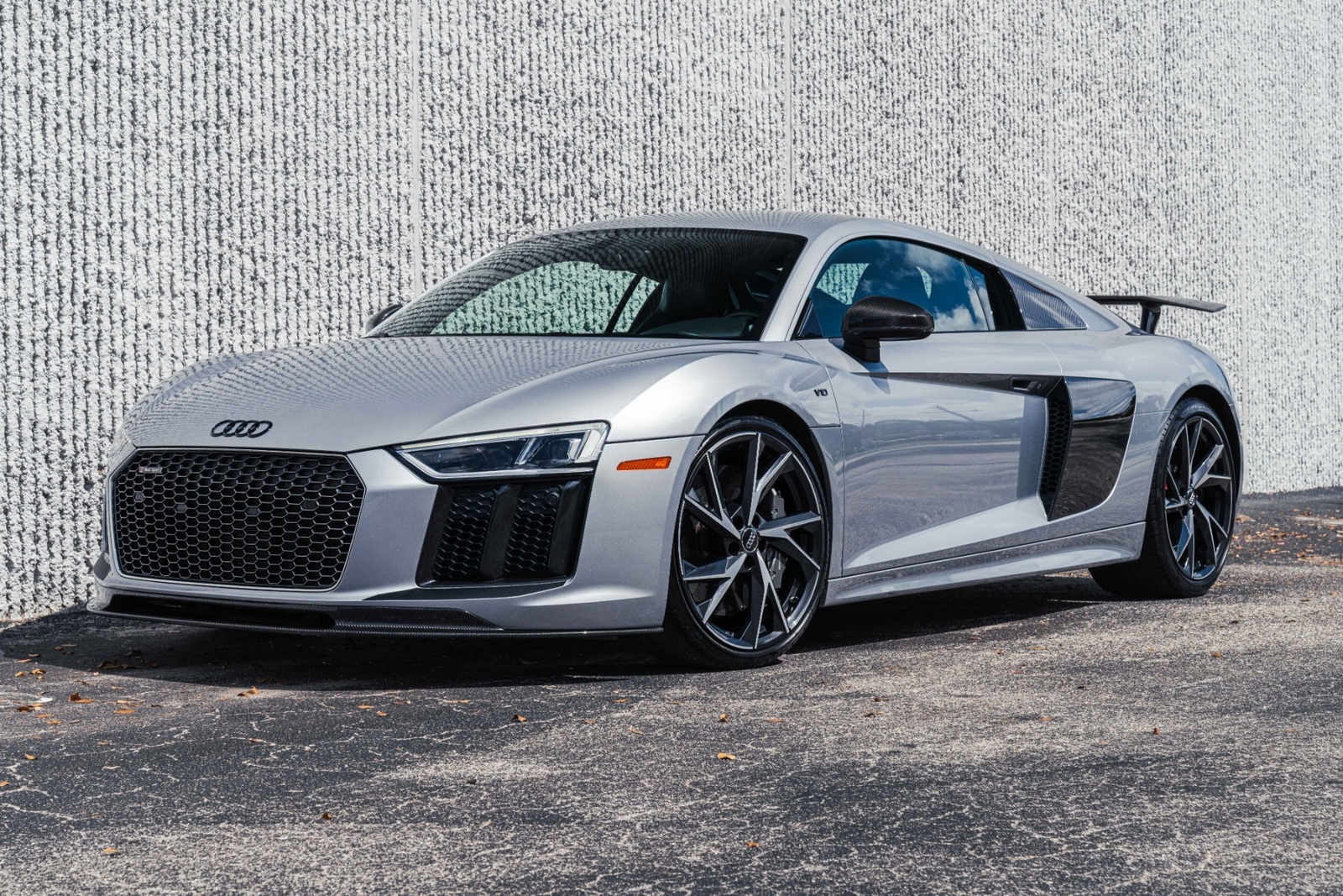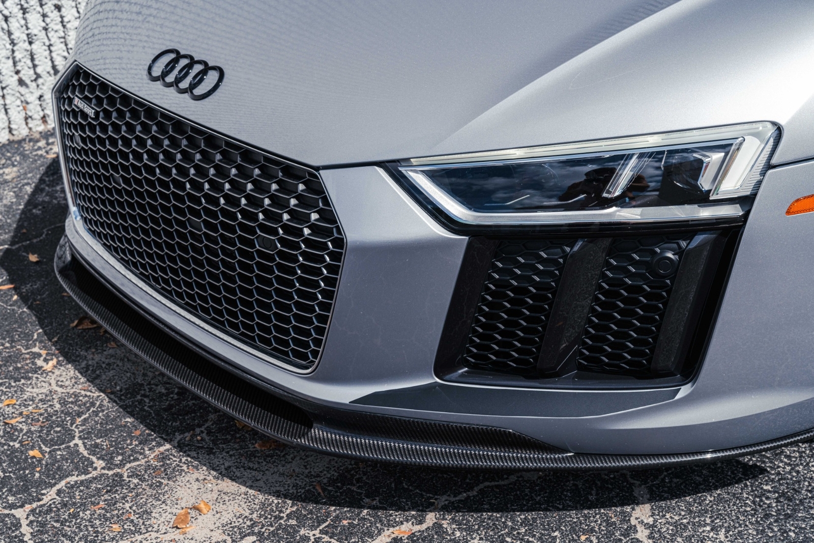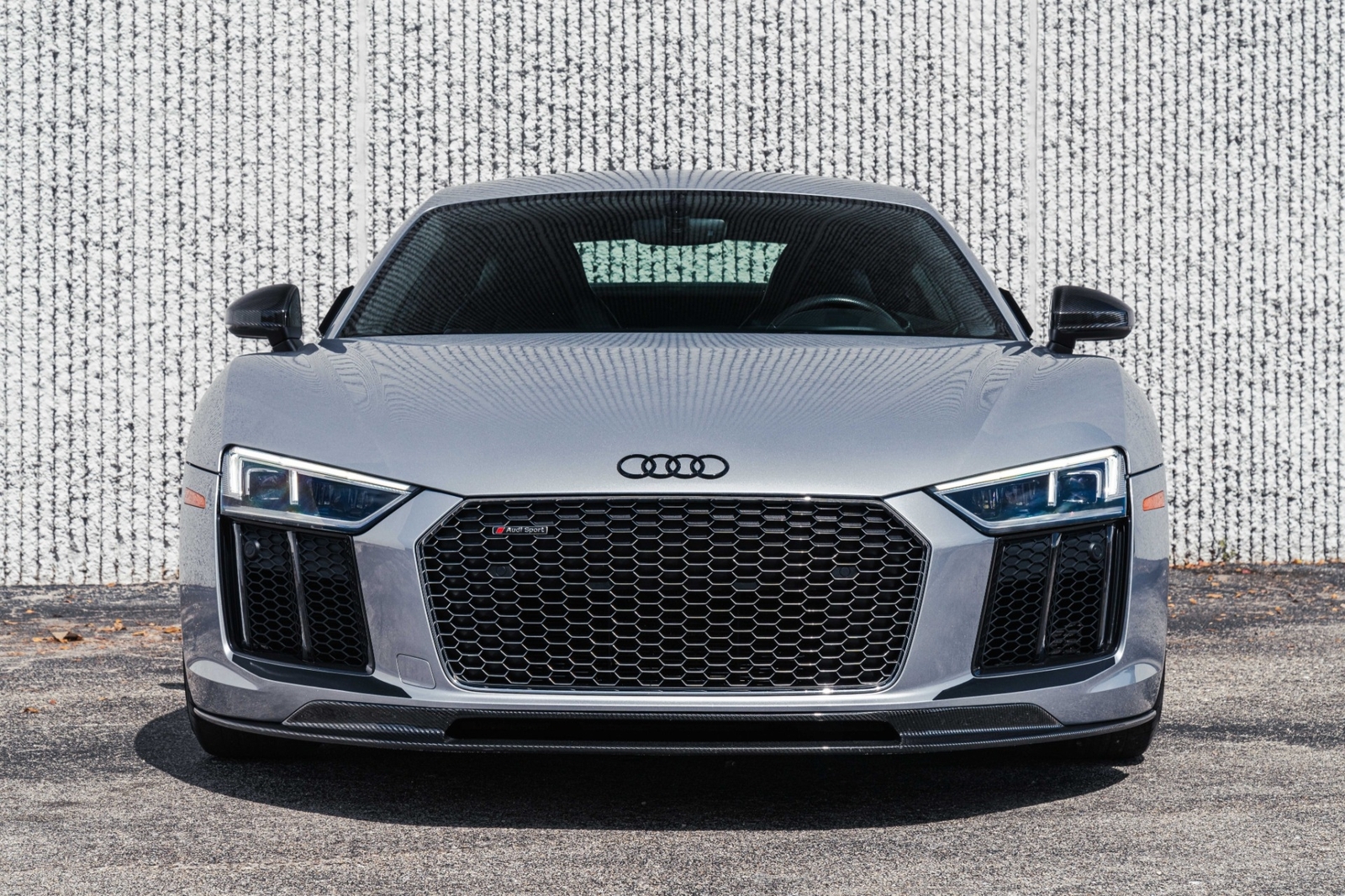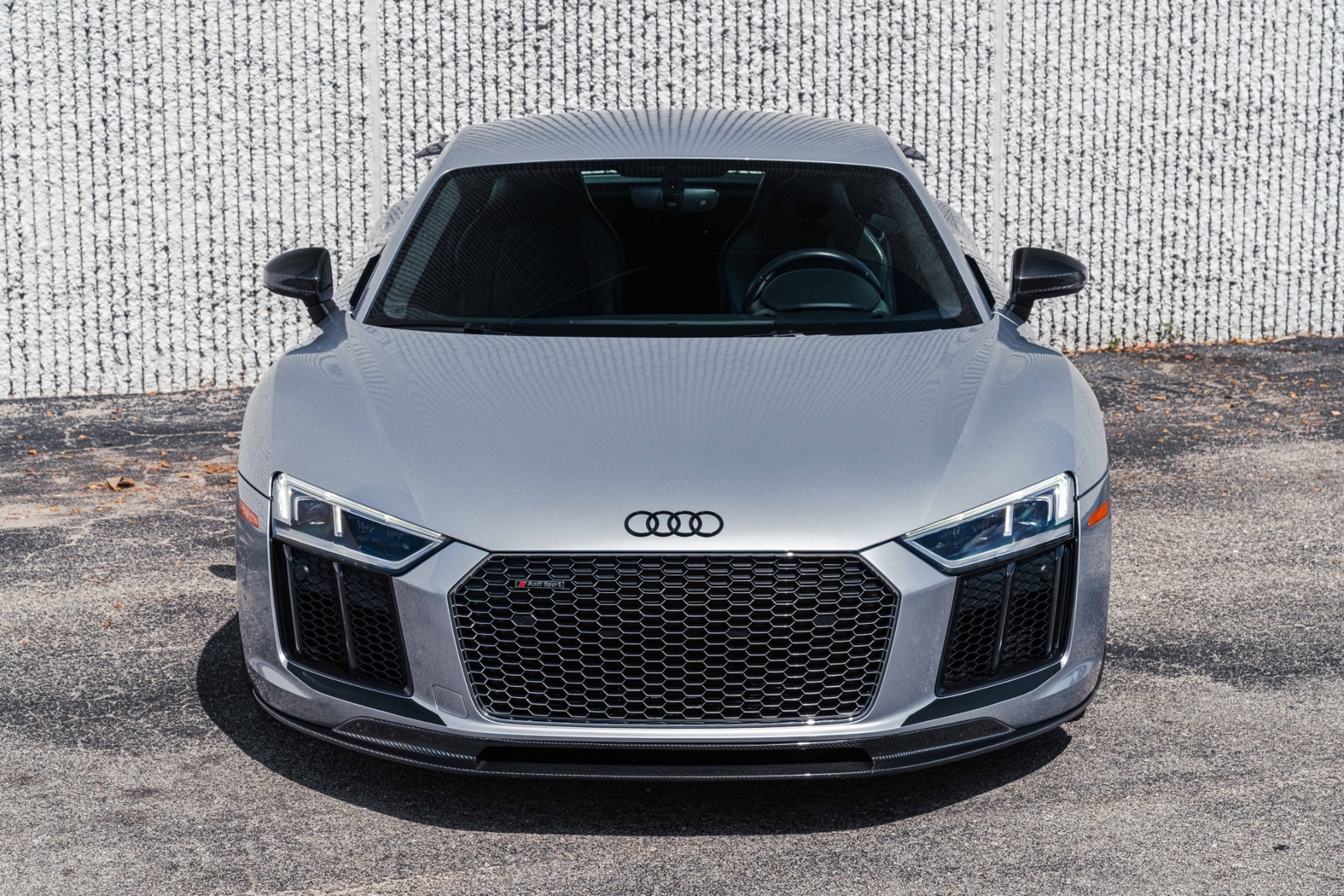 Exotics Hunter proudly presents this 2017 R8 V10 Plus with tasteful modifications. This Florett Silver R8 is fitted with a carbon fiber Vorsteiner rear wing, a carbon fiber Vorsteiner front splitter, and a Kline exhaust elevating every drive. Along with the modifications this spec features the diamond stitch leather pack, featuring diamond stitched seats, diamond stitched Alcantara headliner, extended leather throughout the interior, and more.