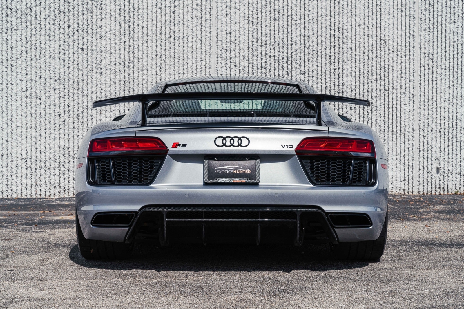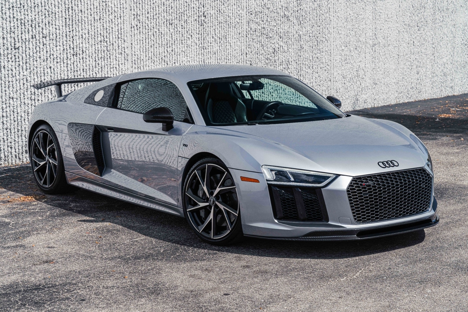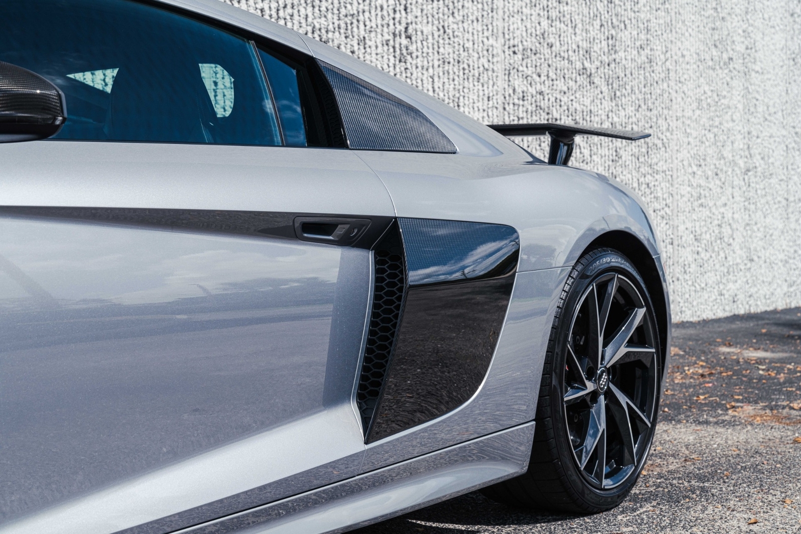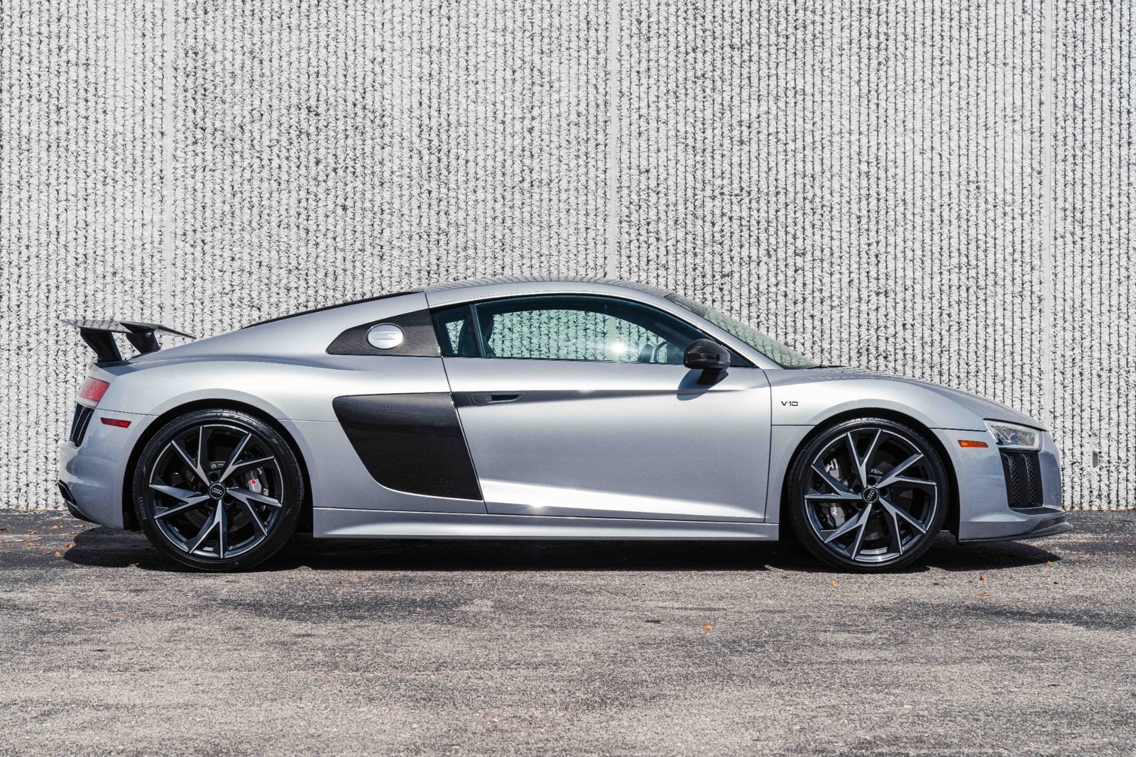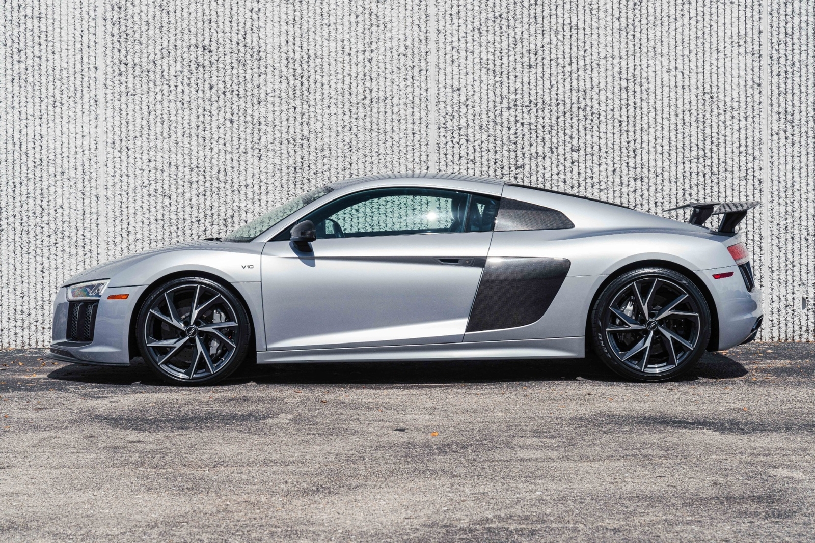 Exotics Hunter proudly presents this 2017 R8 V10 Plus with tasteful modifications. This Florett Silver R8 is fitted with a carbon fiber Vorsteiner rear wing, a carbon fiber Vorsteiner front splitter, and a Kline exhaust elevating every drive. Along with the modifications this spec features the diamond stitch leather pack, featuring diamond stitched seats, diamond stitched Alcantara headliner, extended leather throughout the interior, and more.
