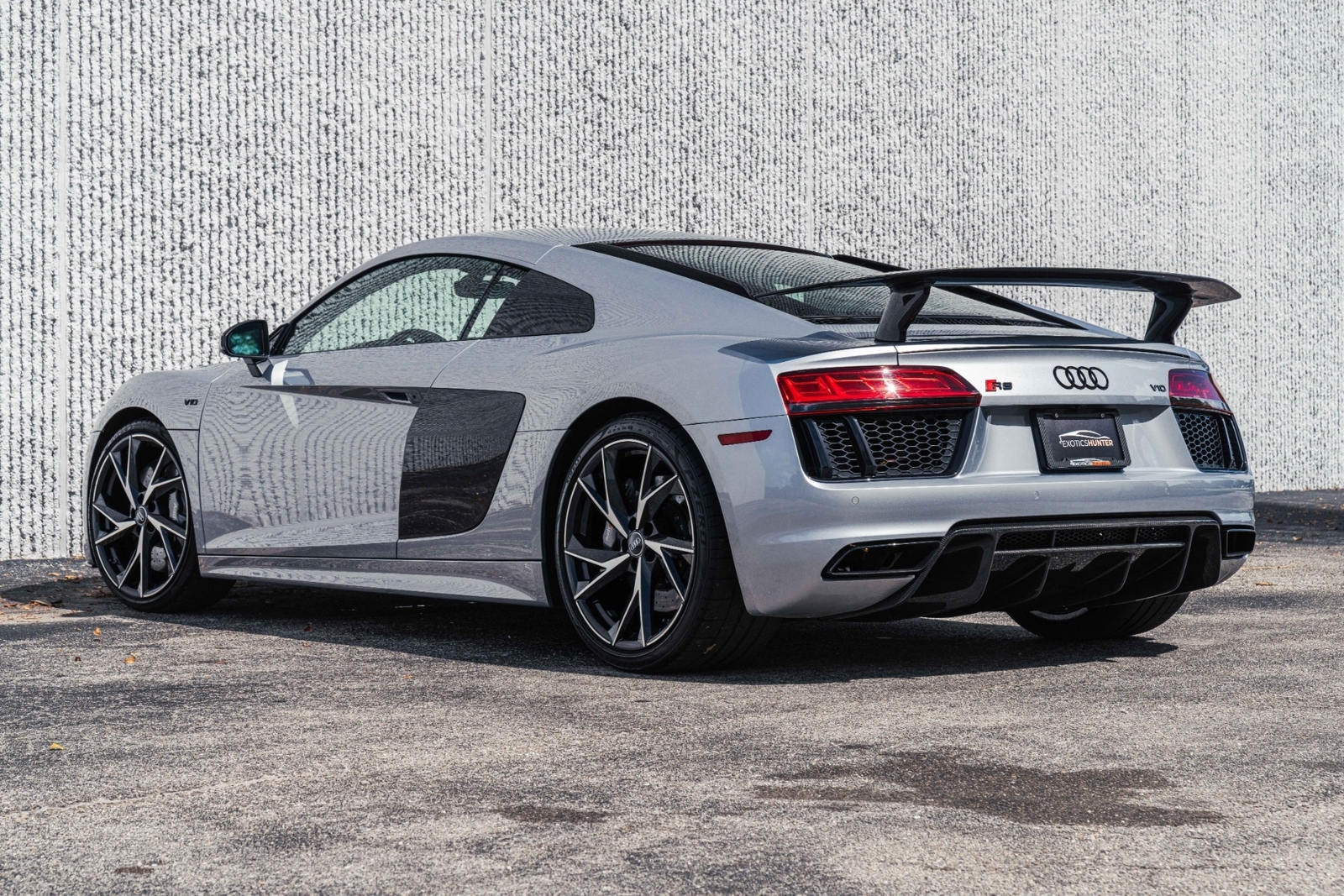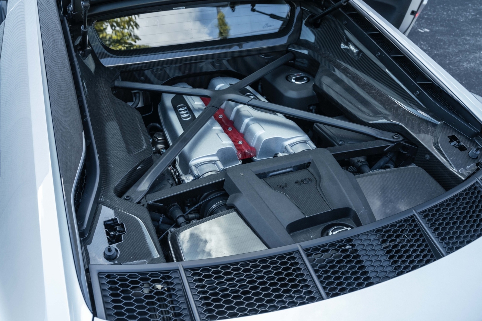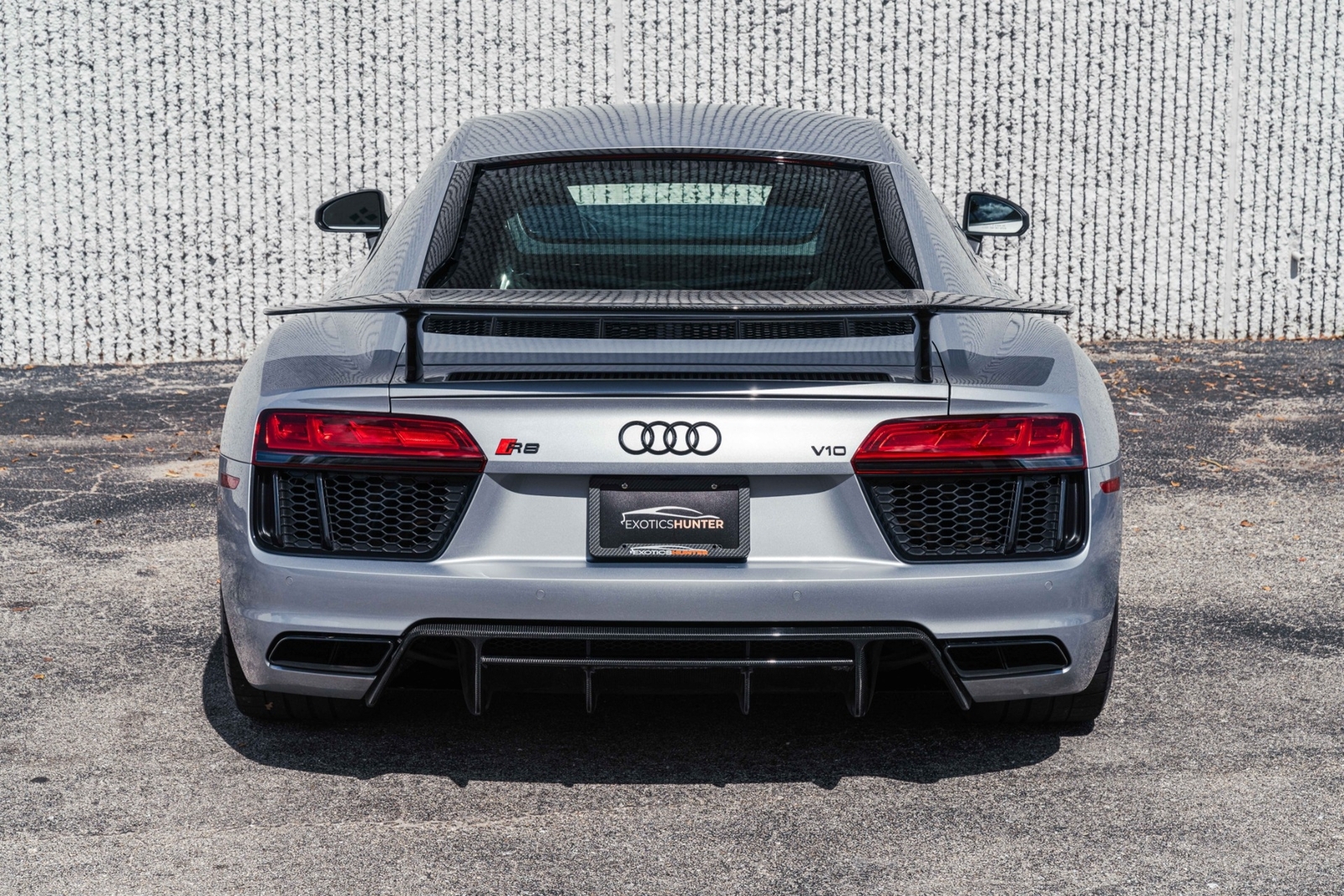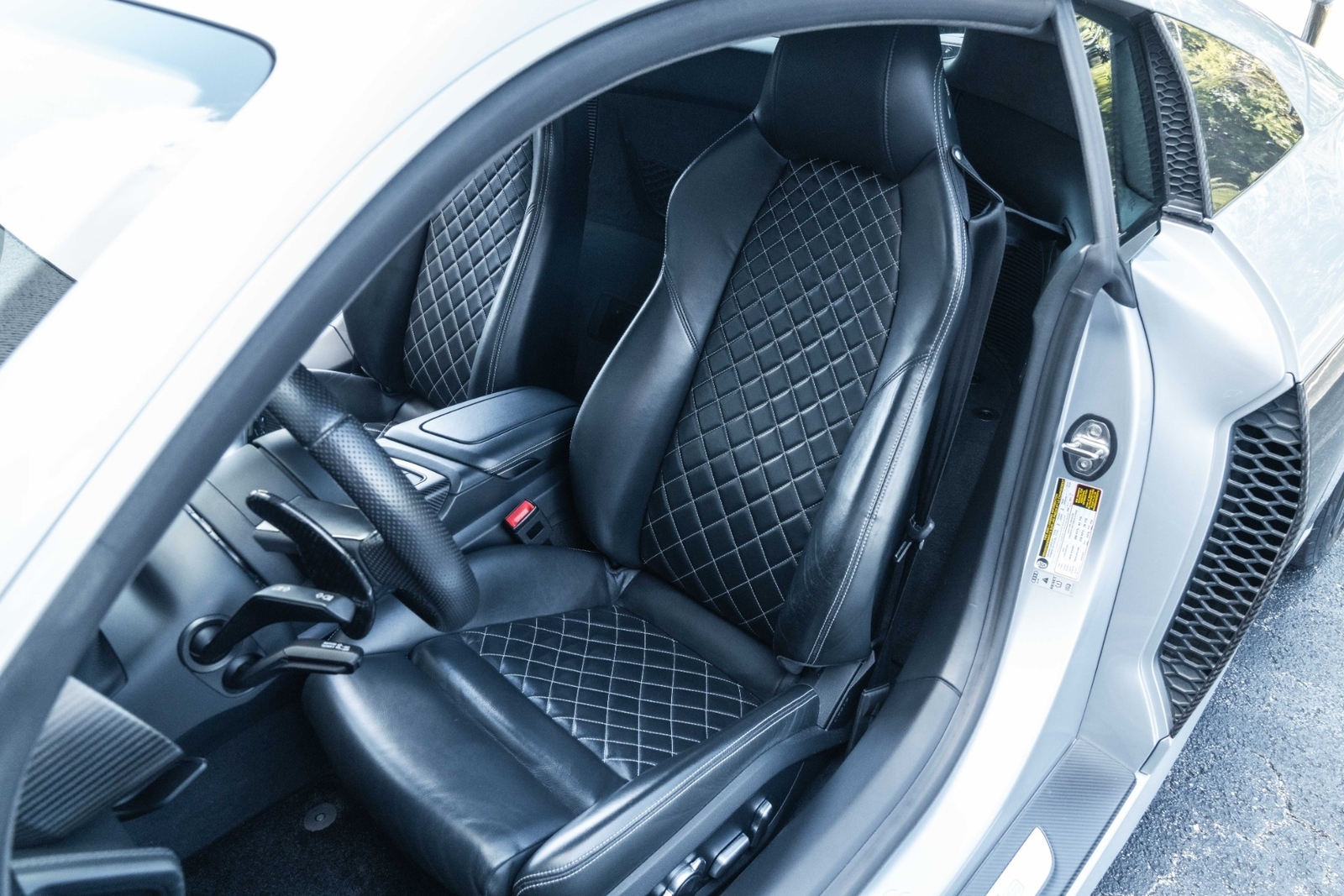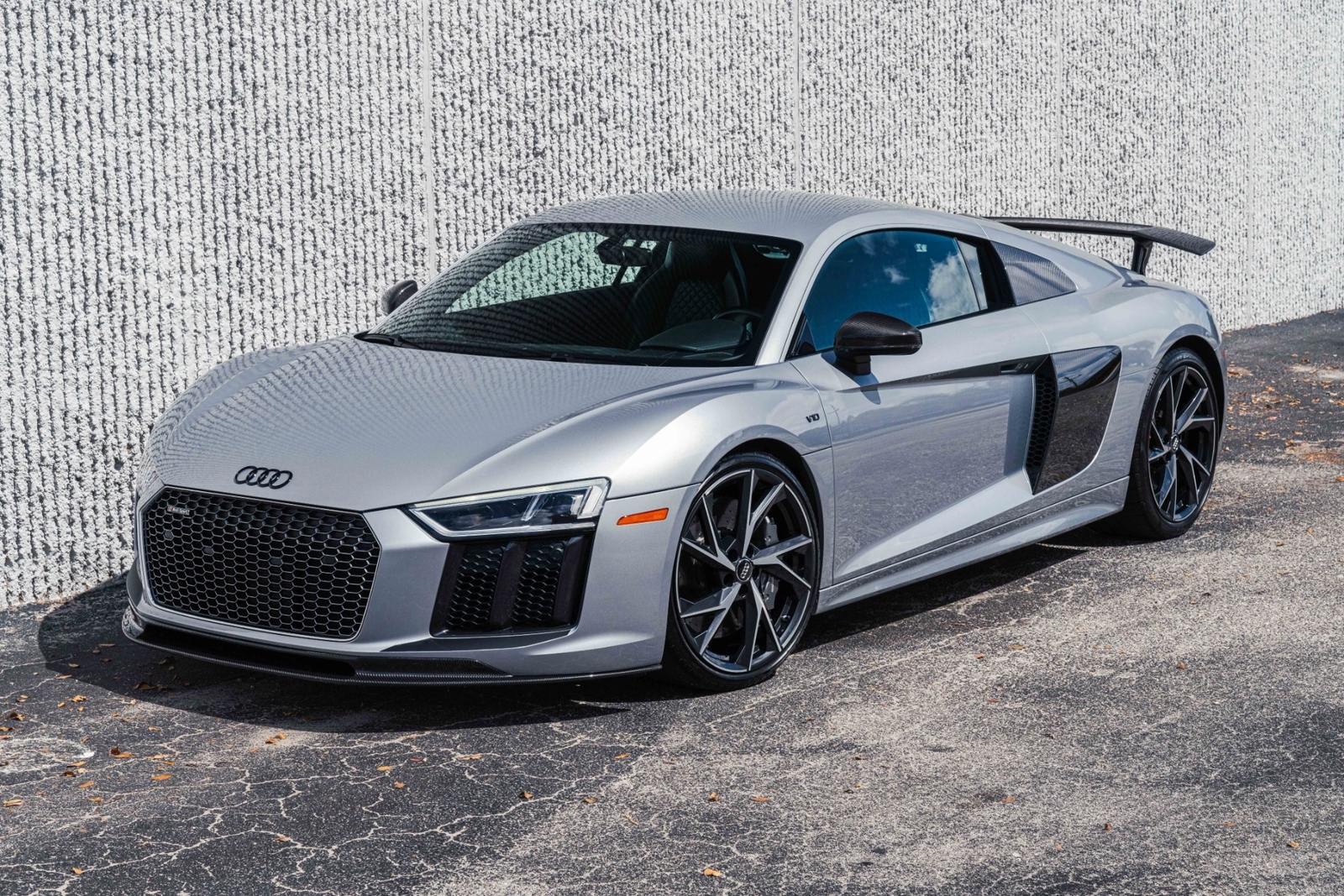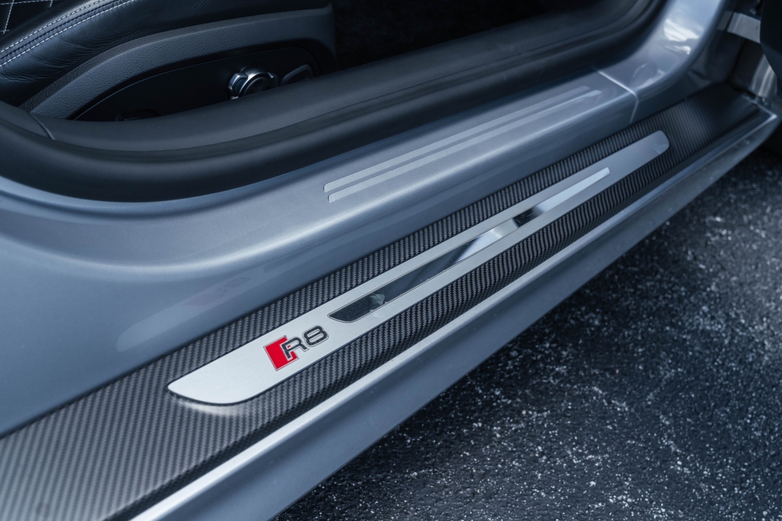 Exotics Hunter proudly presents this 2017 R8 V10 Plus with tasteful modifications. This Florett Silver R8 is fitted with a carbon fiber Vorsteiner rear wing, a carbon fiber Vorsteiner front splitter, and a Kline exhaust elevating every drive. Along with the modifications this spec features the diamond stitch leather pack, featuring diamond stitched seats, diamond stitched Alcantara headliner, extended leather throughout the interior, and more.