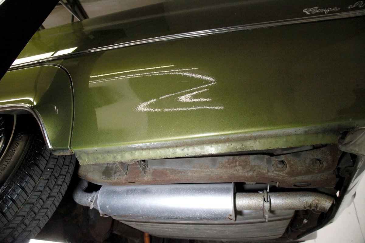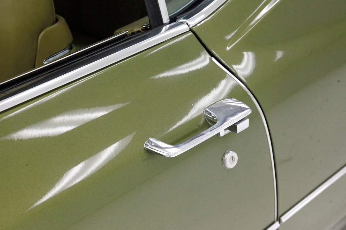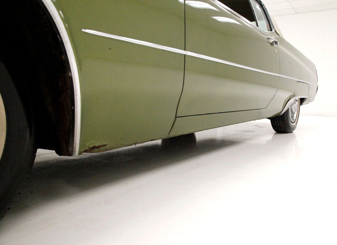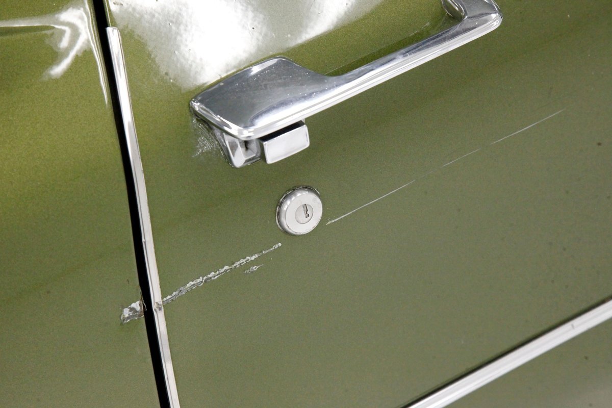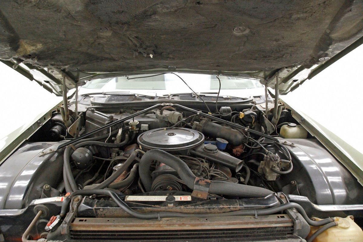 The obsession with chrome had ended in the mid 1960's. It was still used, but only in key points of the overall construction. This green respray named Bayberry Metallic and is much like avocado green, is not without that chrome jewelry in that the massive bumpers, horizontal dual headlights, and front V shaped grille. A solid steel roof wrapped in cream vinyl covers the passenger compartment. Steel panels are straight, however on either side of the front quarters just behind them wheel wells there is an area that has invasive rust right through the inner panels of the undercarriage. A small trim spear, which begins just above the wrap-around front ribbed signal and running lighting, runs the length of the car to the triangular pointed tail lights that stick out above on the rear quarters. Not a fin, but certainly prevalent and framing the NYC 3 bedroom apartment size trunk on either side. The long hood is impressive as well and not to be outdone by the trunk is even longer in its run from the grille to the front windscreen. Chromed wire spoked wheel coverings are wrapped by tasteful thin whitewall rubber on all 4 corners.