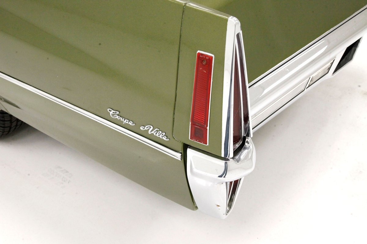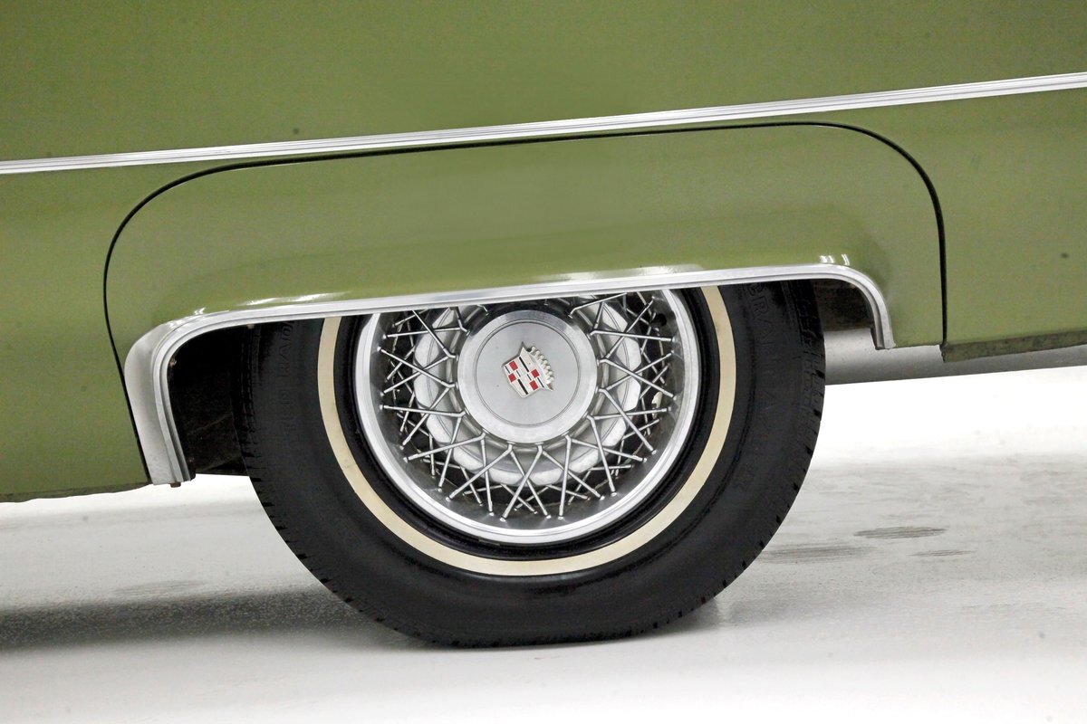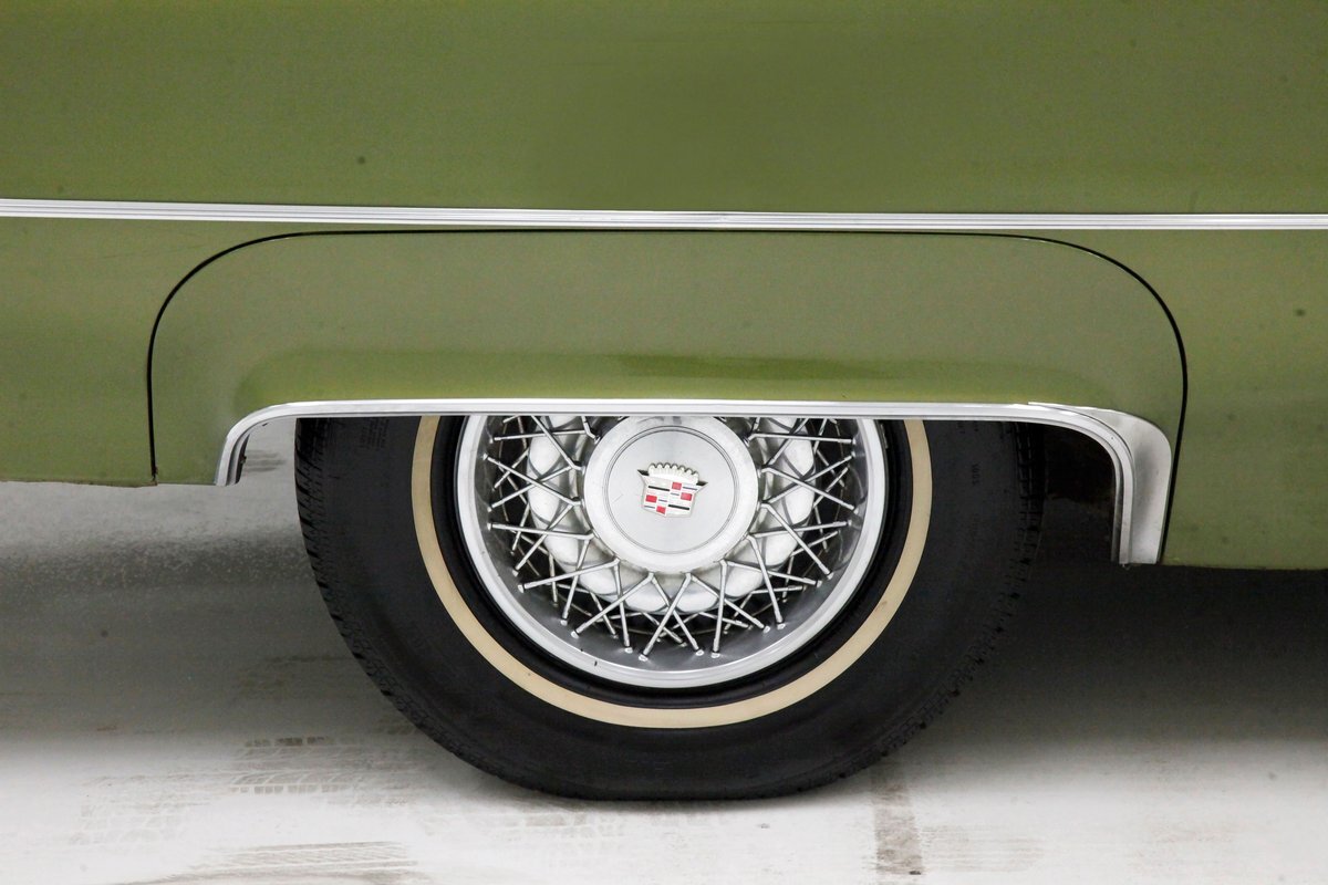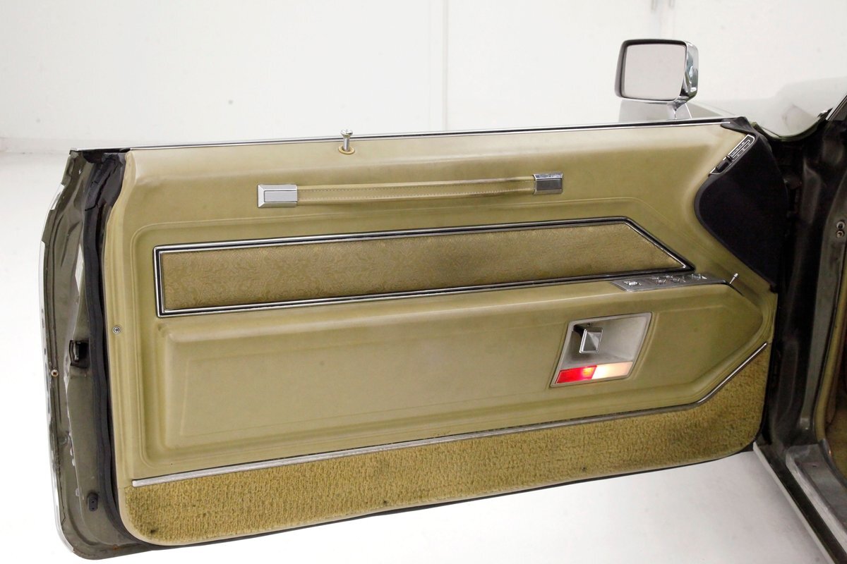 The obsession with chrome had ended in the mid 1960's. It was still used, but only in key points of the overall construction. This green respray named Bayberry Metallic and is much like avocado green, is not without that chrome jewelry in that the massive bumpers, horizontal dual headlights, and front V shaped grille. A solid steel roof wrapped in cream vinyl covers the passenger compartment. Steel panels are straight, however on either side of the front quarters just behind them wheel wells there is an area that has invasive rust right through the inner panels of the undercarriage. A small trim spear, which begins just above the wrap-around front ribbed signal and running lighting, runs the length of the car to the triangular pointed tail lights that stick out above on the rear quarters. Not a fin, but certainly prevalent and framing the NYC 3 bedroom apartment size trunk on either side. The long hood is impressive as well and not to be outdone by the trunk is even longer in its run from the grille to the front windscreen. Chromed wire spoked wheel coverings are wrapped by tasteful thin whitewall rubber on all 4 corners.