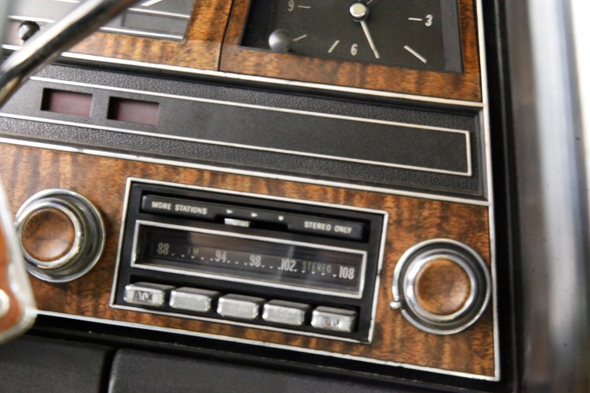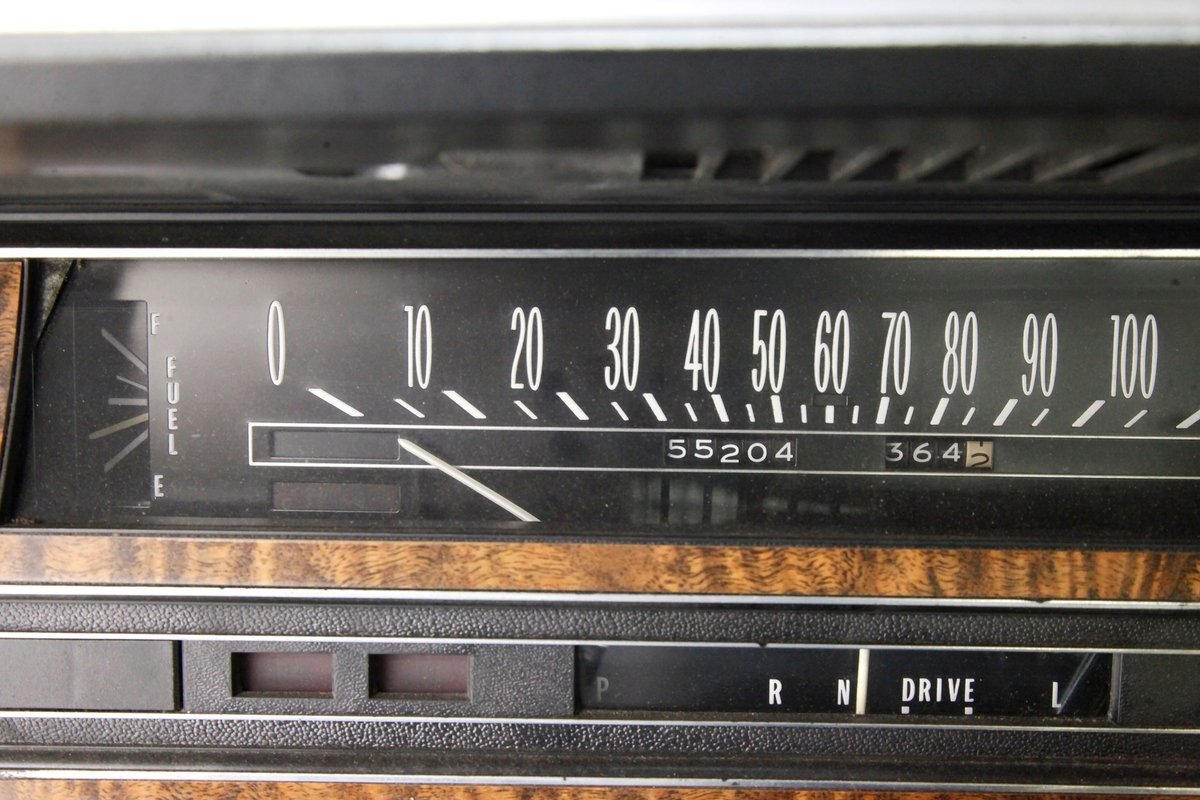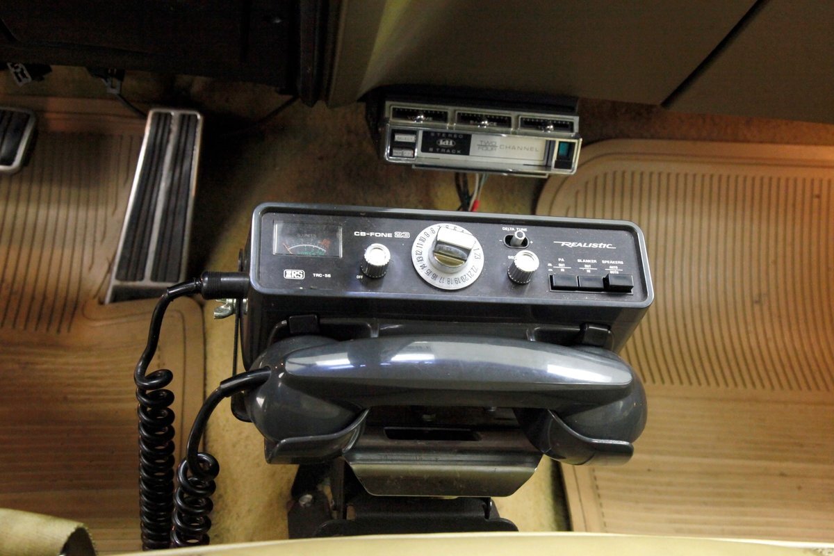 Inside makes use of gold molded vinyl door panels, with a horizontal area of gold suede. A brushed stainless panel in the armrest houses the power windows, locks and mirror joystick. With plenty of padding and wrapped in medium gold dynasty broadcloth we see a split bench in front, and a full bench in the rear, major center flip up and down armrest, one is tempted to ask "wheres the damn remote?" Bolsters are in gold leather and are smooth with some piping on the edging, and uppers have 3 buttons. Talk about convenience options, power steering, power brakes, power windows, power seats, and climate control, all at the touch of a button. Also the factory AM/FM stereo residing within the dash, and just below is a CB unit and an early car phone. Seen also is more of the nicely stained tiger maple added in as accenting for the gauge dash front panel covering. Beautiful thick pile antique gold carpeting is on all floors and is pretty clean and unfaded. The above headliner is also lighter gold, and is nice and tight.