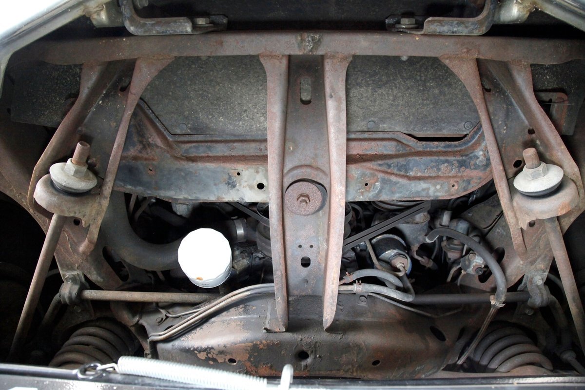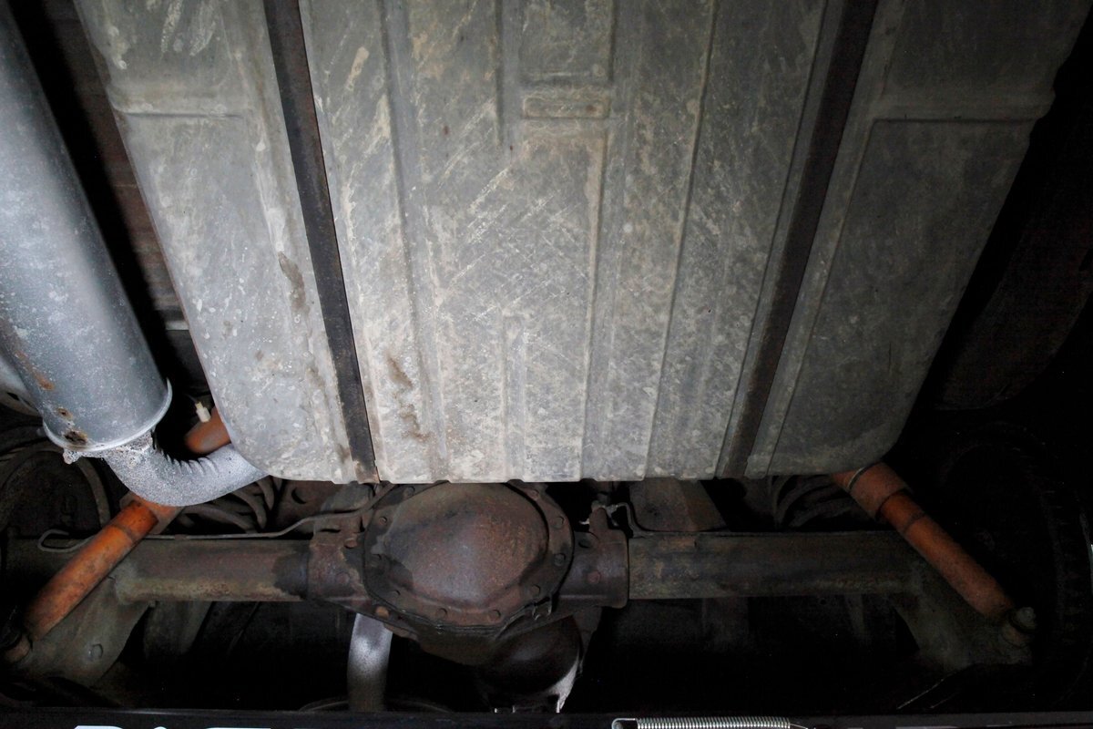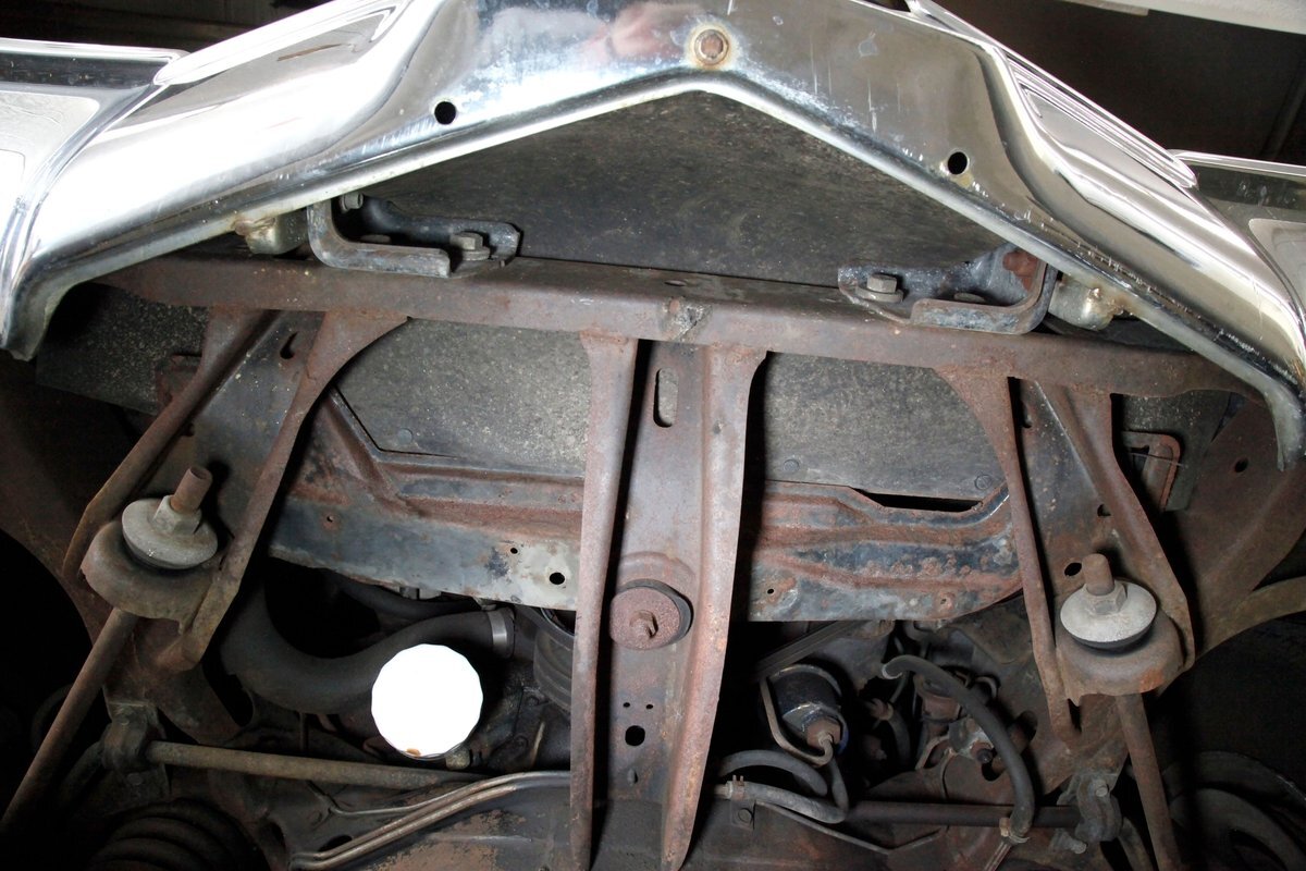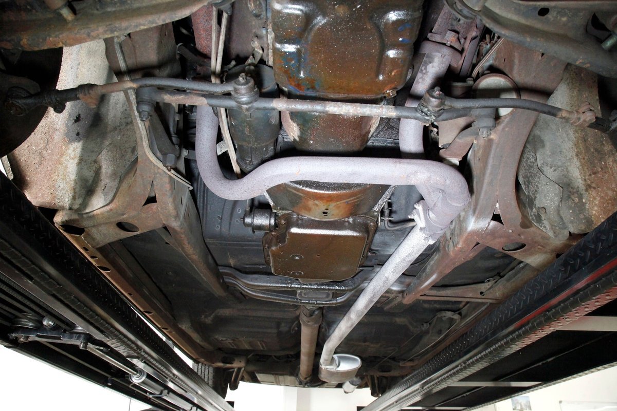 The smooth ride courtesy the independent coil spring front suspension, and 4 link with coil springs on the rear is nicely presented with road dirt patina and a smattering of surface and some invasive rust on the inner rockers is noted. Power disc braking is on front, and power drum brakes are on back. The exhaust is stock and has heavy surface rust on pipes, and some has been sprayed with a silver rattle can.