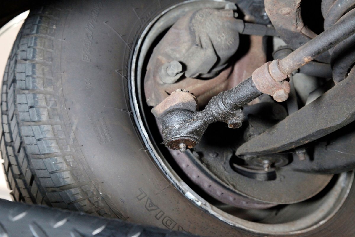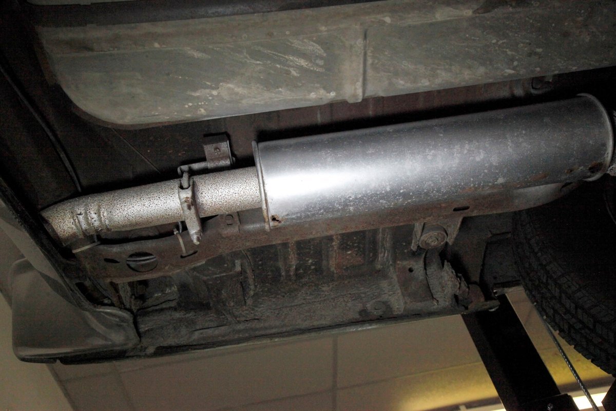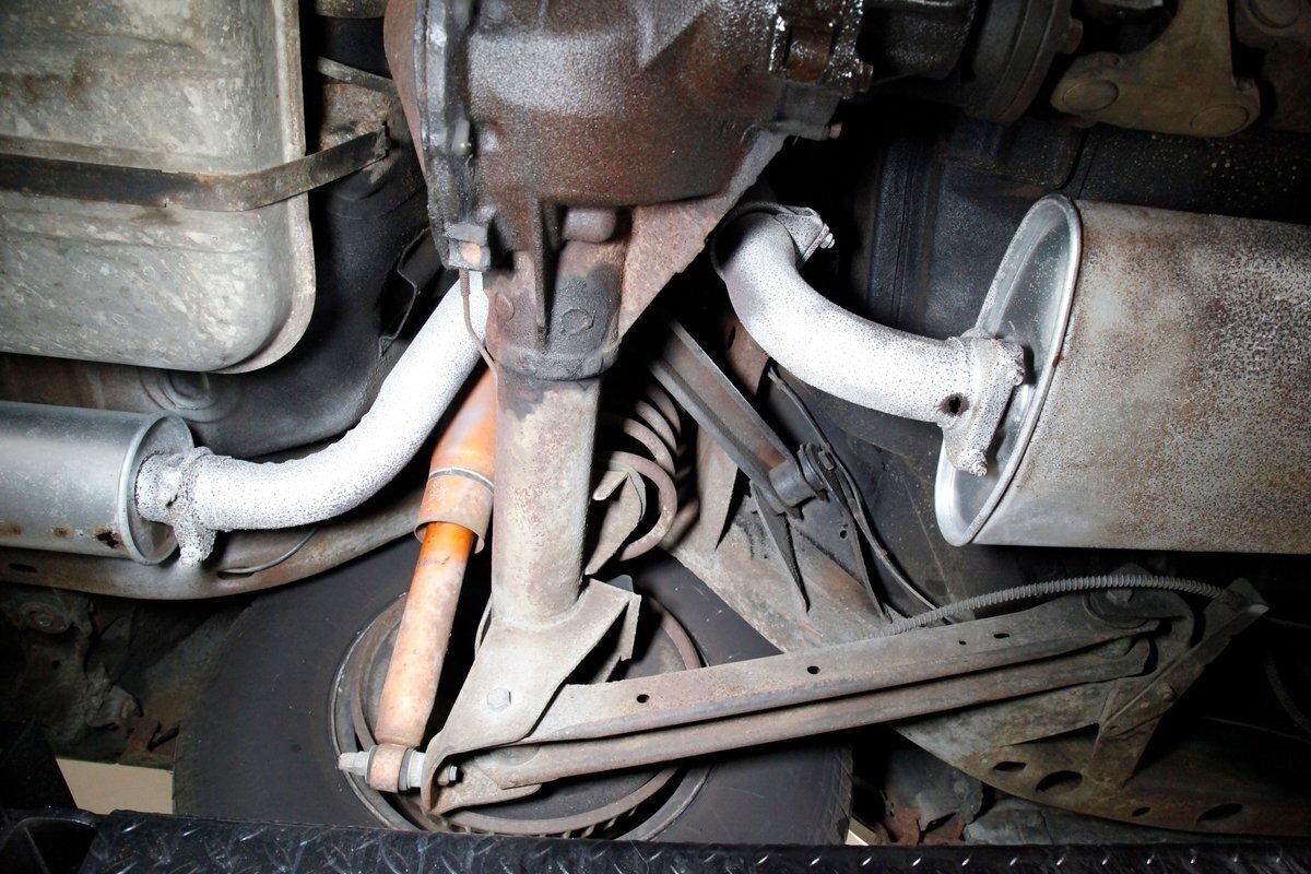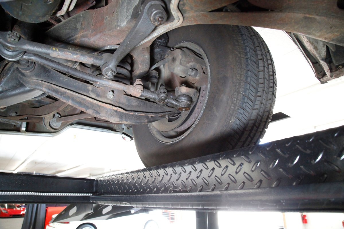 The smooth ride courtesy the independent coil spring front suspension, and 4 link with coil springs on the rear is nicely presented with road dirt patina and a smattering of surface and some invasive rust on the inner rockers is noted. Power disc braking is on front, and power drum brakes are on back. The exhaust is stock and has heavy surface rust on pipes, and some has been sprayed with a silver rattle can.