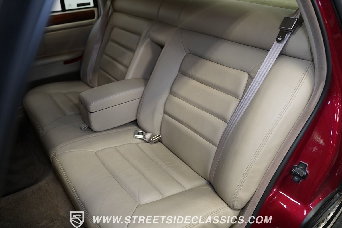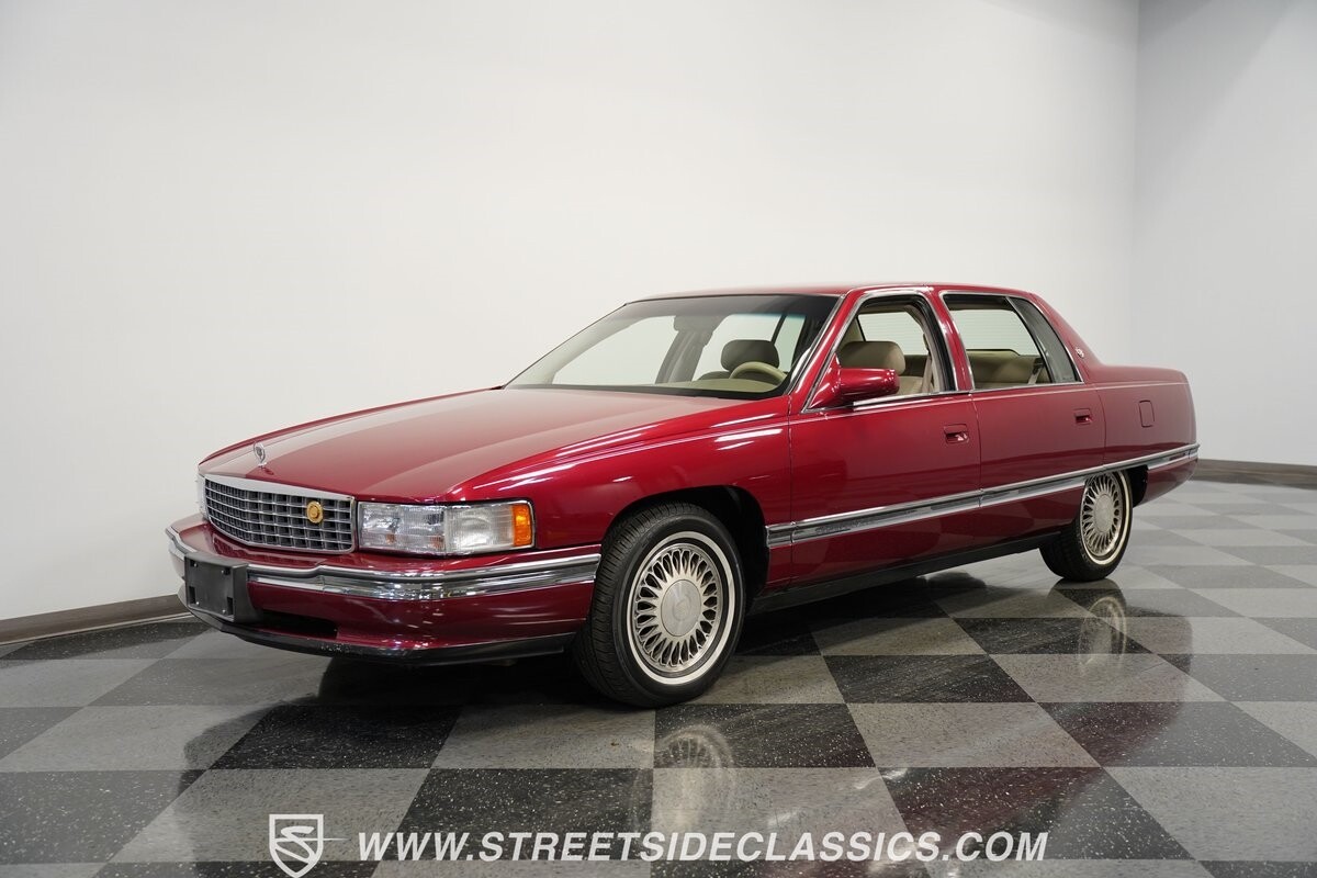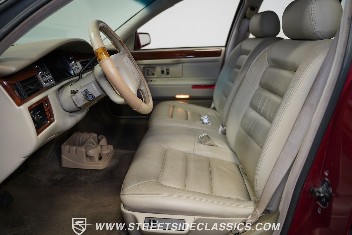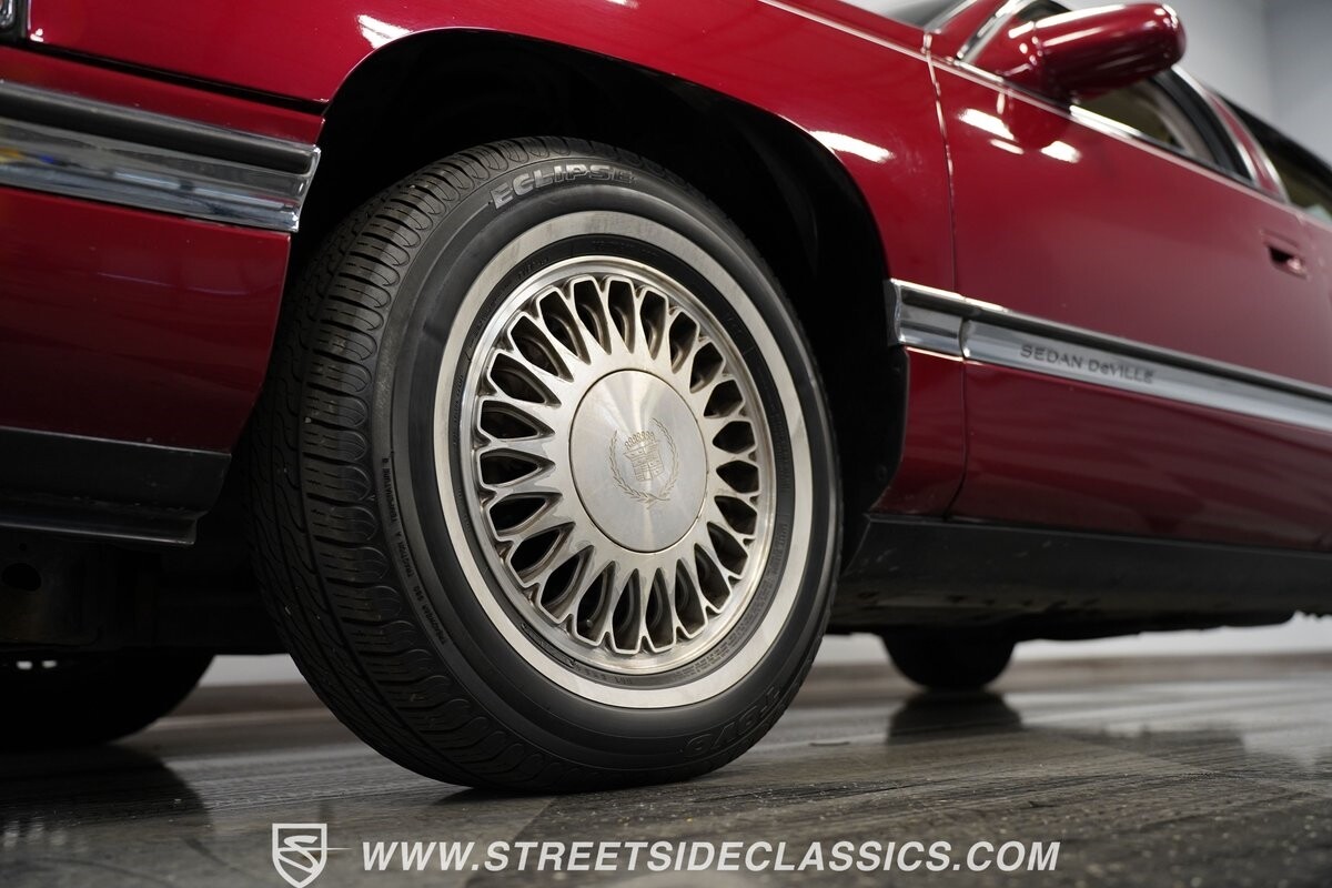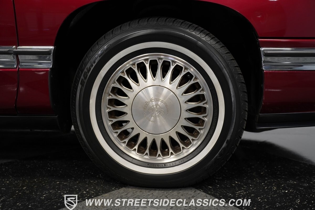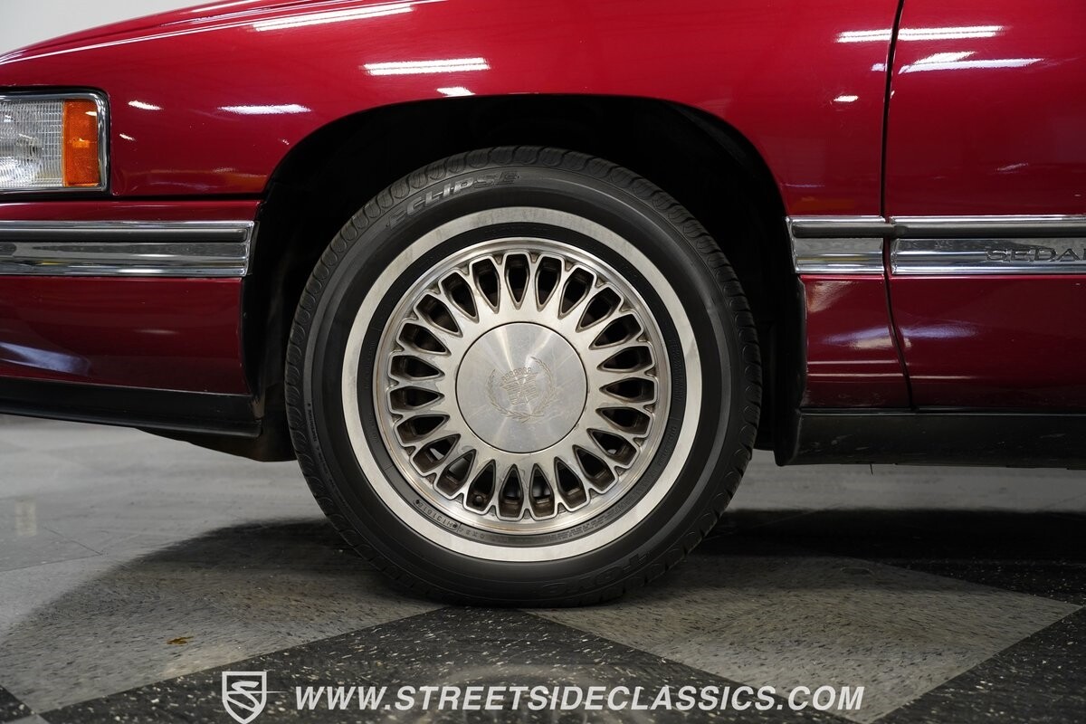 With its Carmine Red paint still gleaming, this 1995 Cadillac Sedan DeVille is a timeless classic that refuses to fade into the background. The subtle tailfins, a nod to Cadillac's iconic design heritage, add a touch of nostalgia to this modern luxury sedan. Rolling on 15" wheels wrapped in Toyo 215/75R15 whitewall radials up front and 215/70R15 in the rear, this DeVille maintains its smooth, composed stance.