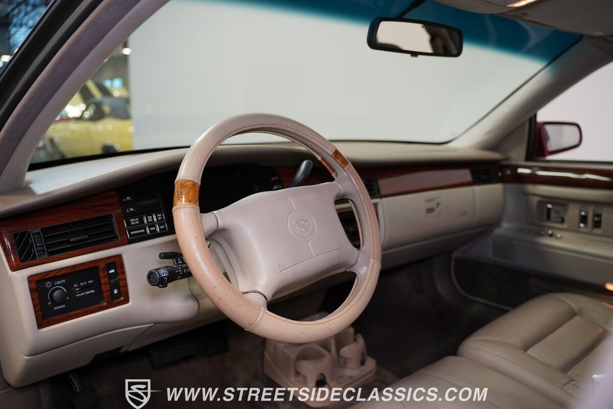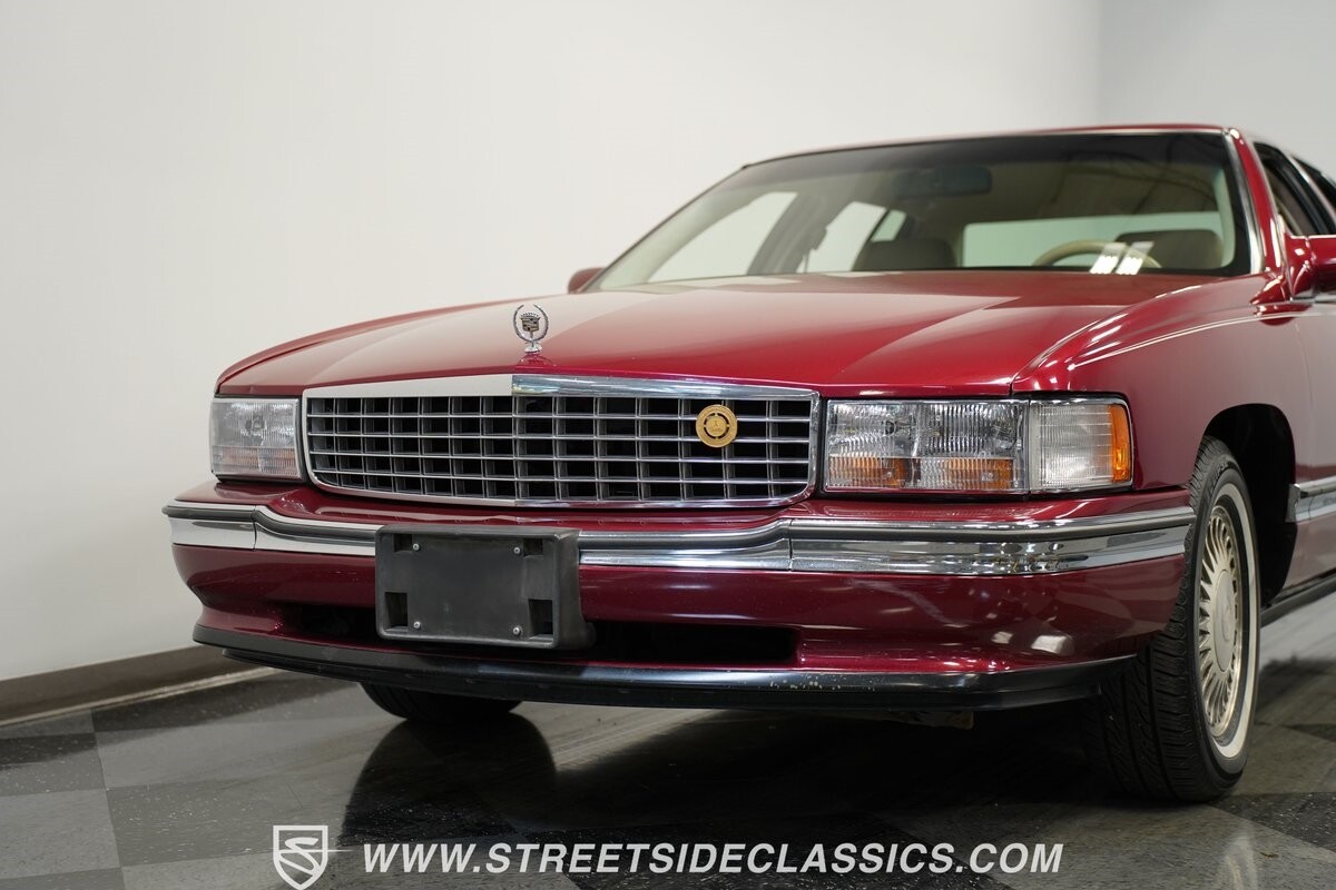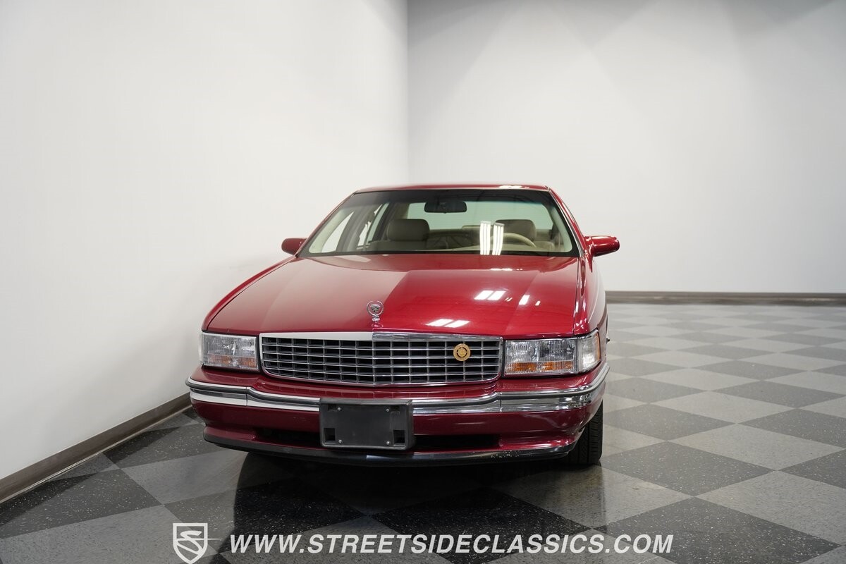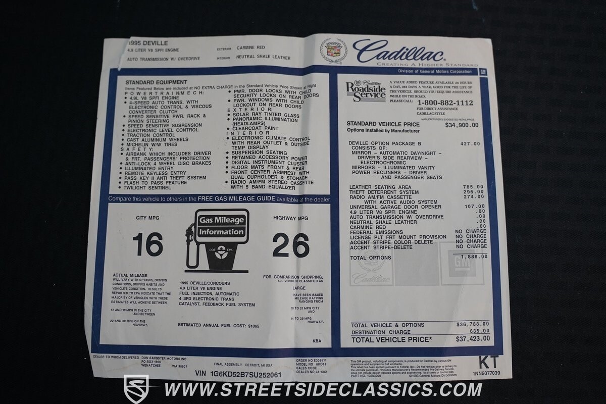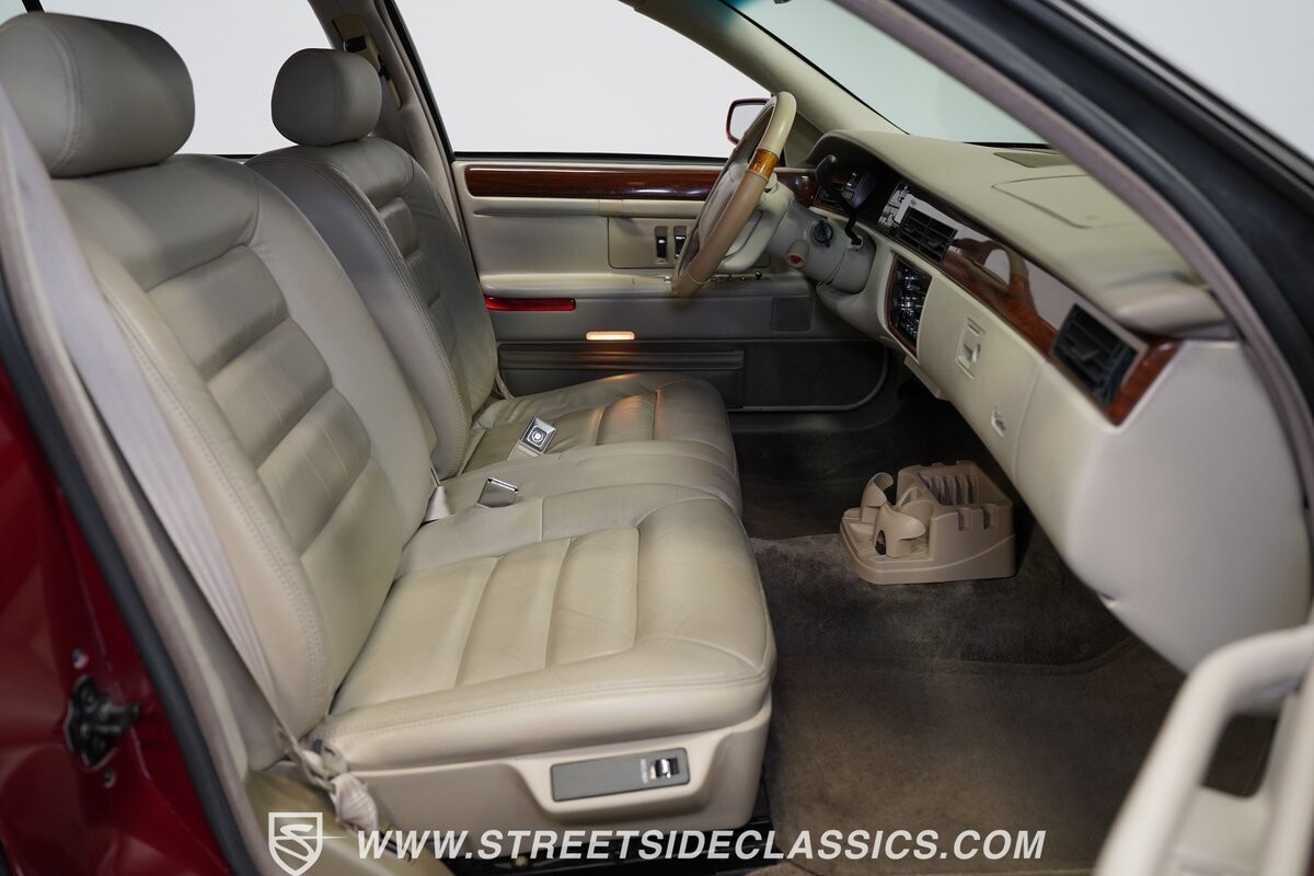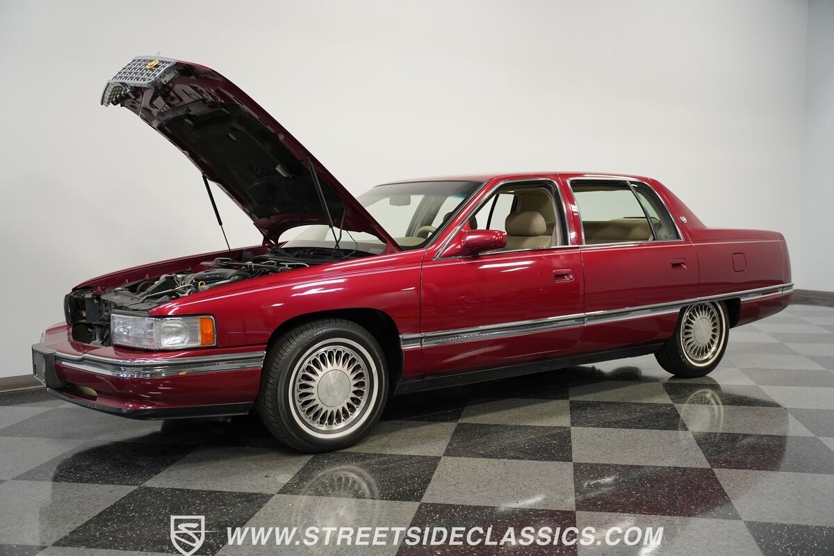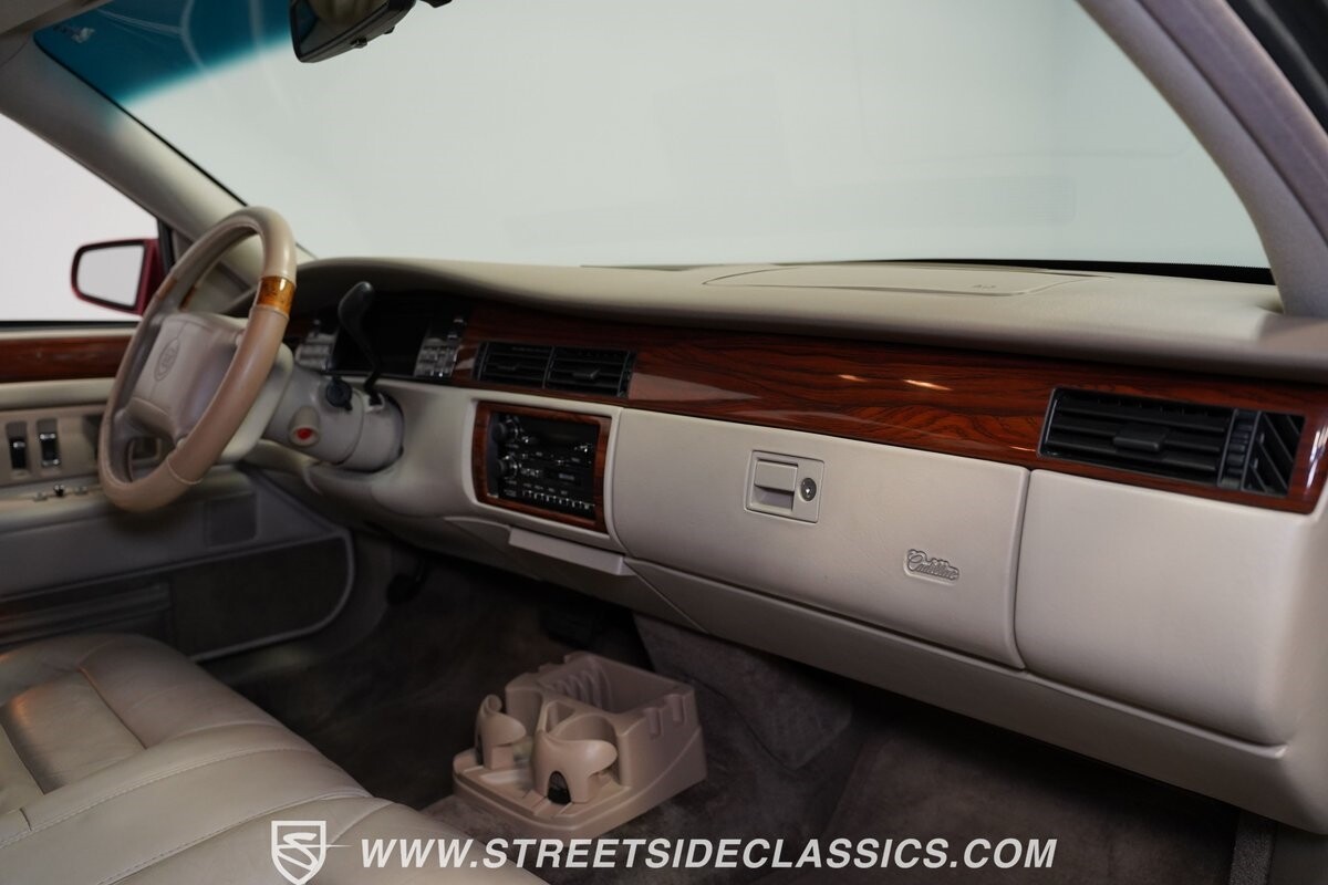 With its Carmine Red paint still gleaming, this 1995 Cadillac Sedan DeVille is a timeless classic that refuses to fade into the background. The subtle tailfins, a nod to Cadillac's iconic design heritage, add a touch of nostalgia to this modern luxury sedan. Rolling on 15" wheels wrapped in Toyo 215/75R15 whitewall radials up front and 215/70R15 in the rear, this DeVille maintains its smooth, composed stance.