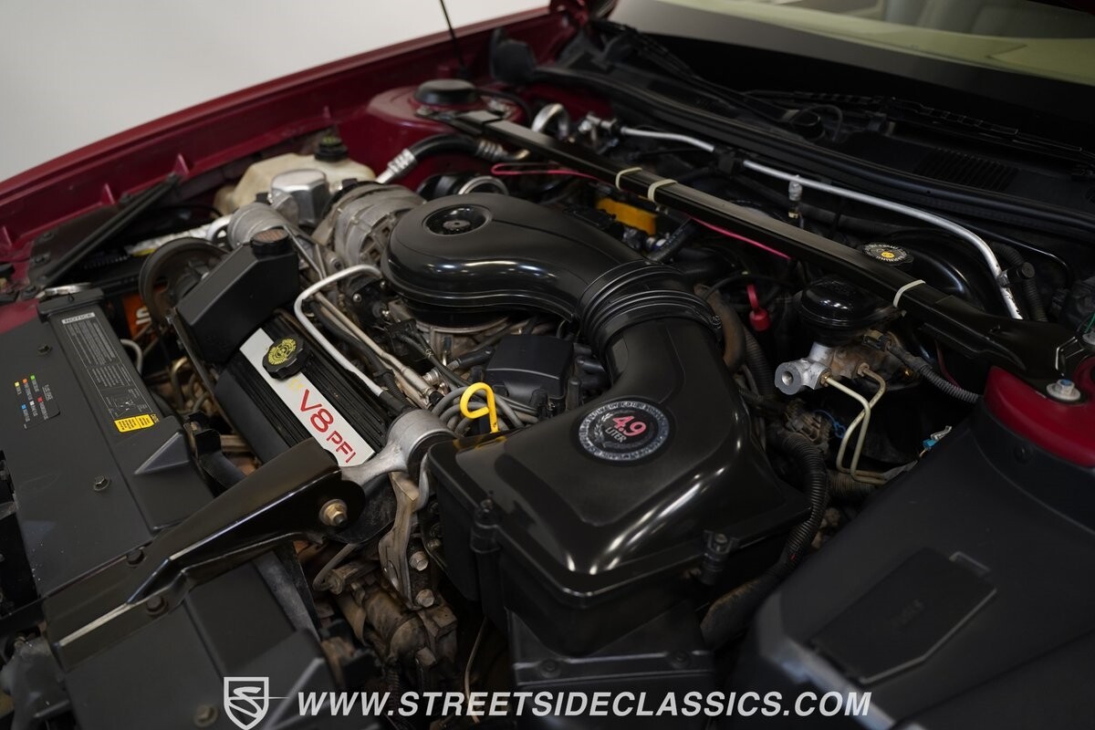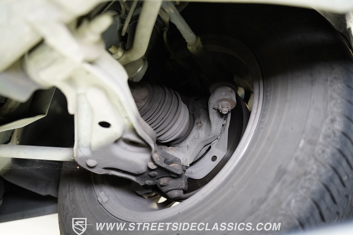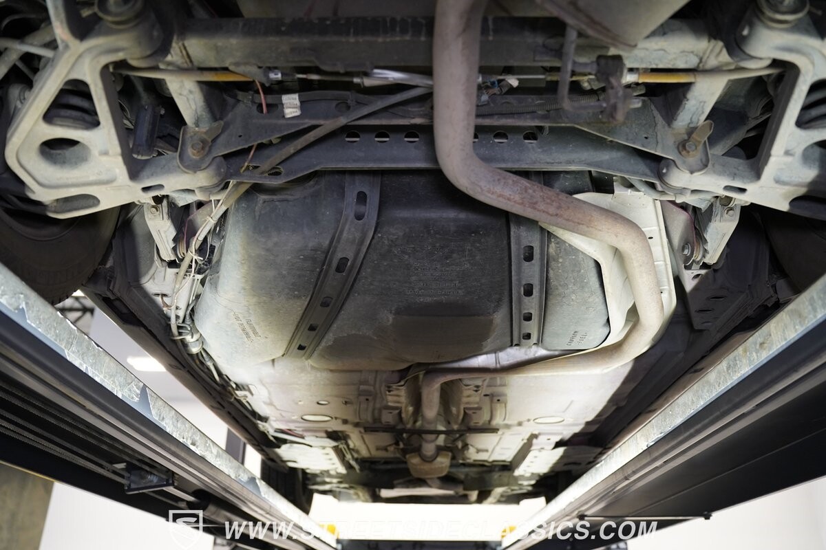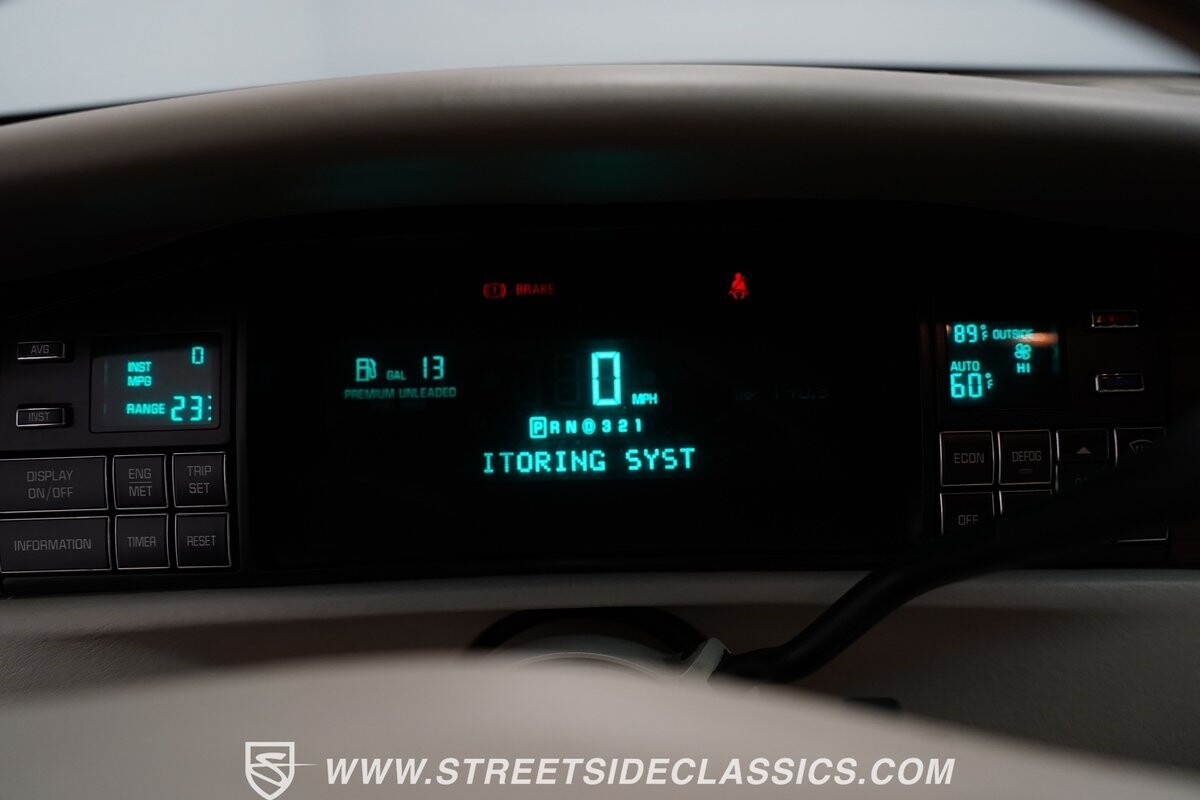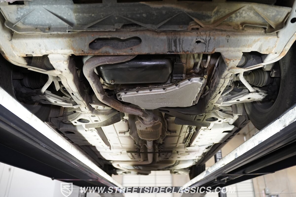 Inside, the Neutral Shale leather interior welcomes you with a 70/30 split bench seat, offering both comfort and space. The cockpit, adorned with a stock appearance, features a column shifter and an AM/FM cassette player ready to fill the cabin with your favorite tunes. While the interior shows minor wear on the center armrest and passenger seat, along with a slight warp on the steering wheel airbag, it remains in remarkable condition considering its age.
