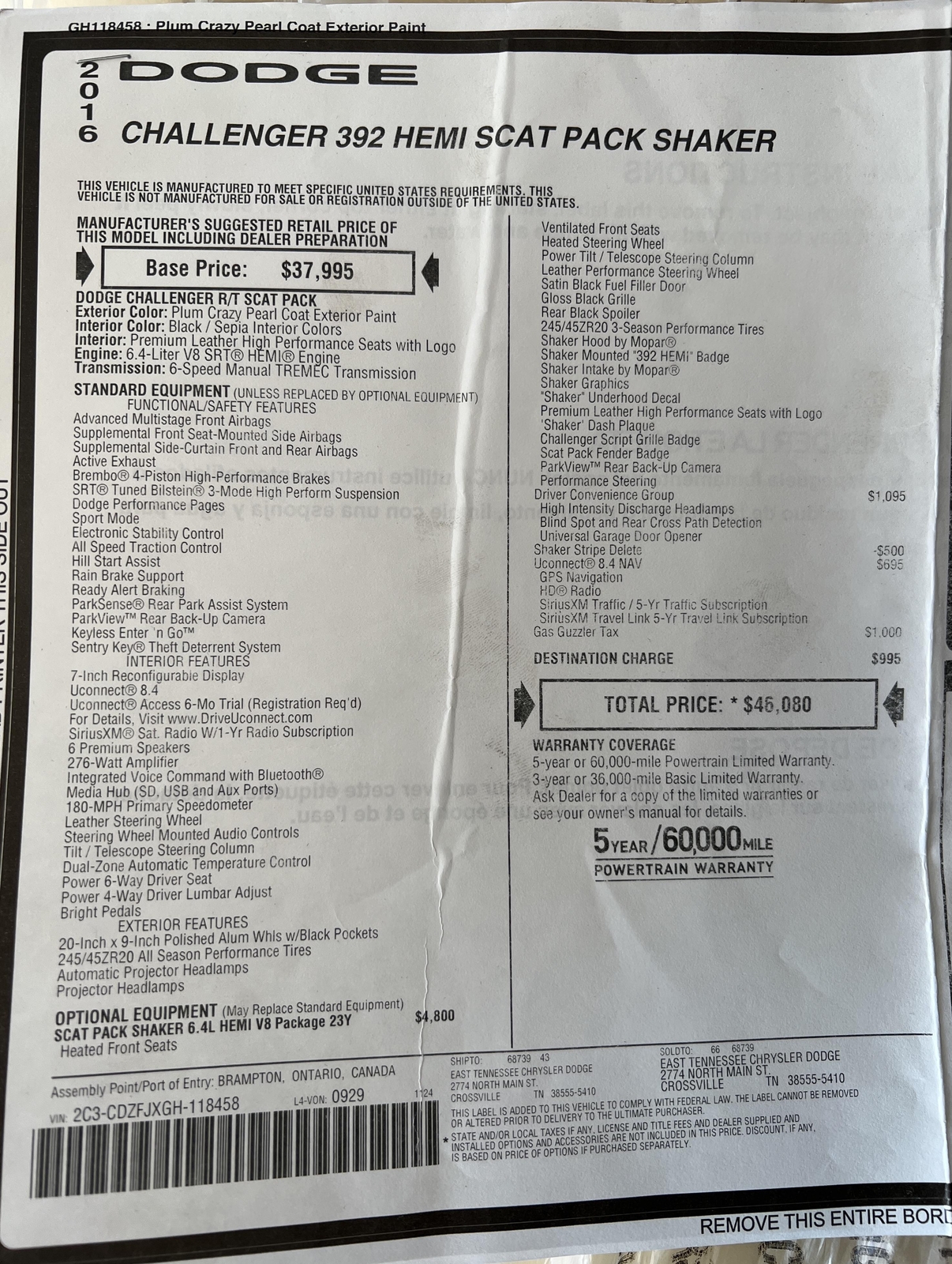 IMMACULATE LIKE BRAND NEW ONLY 1300 ORIGINAL MILES 2016 CHALLENGER SCAT PACK SHAKER 392 HEMI 6SPD LOADED VERY DESIRABLE PLUM CRAZY PEARL COAT ALL PAPERWORK, ORIGINAL WINDOW STICKER AND DETAILS FROM NEW AND BOTH KEY FOBS