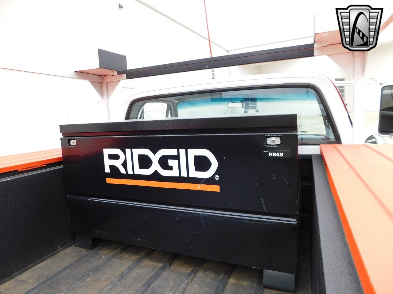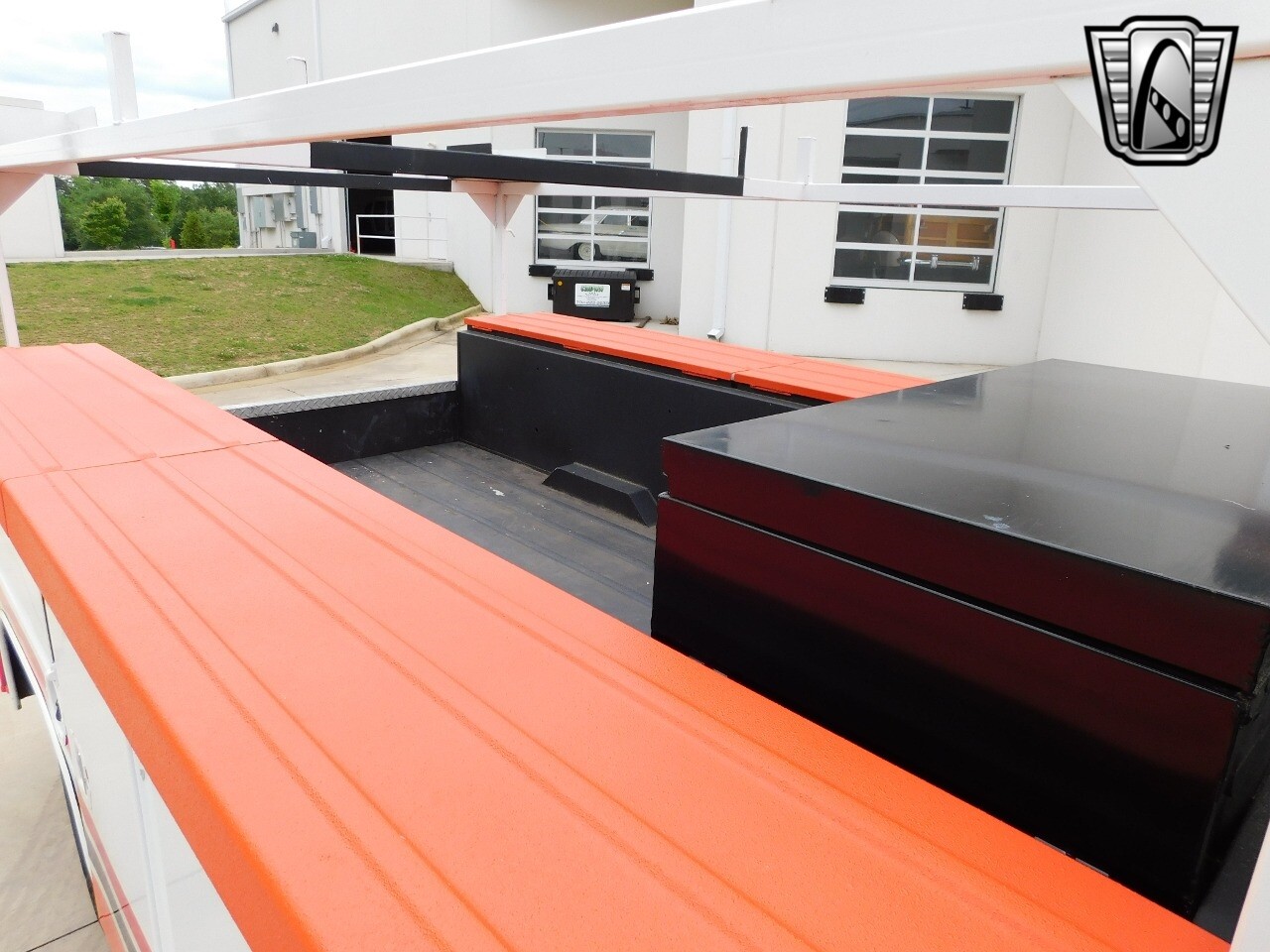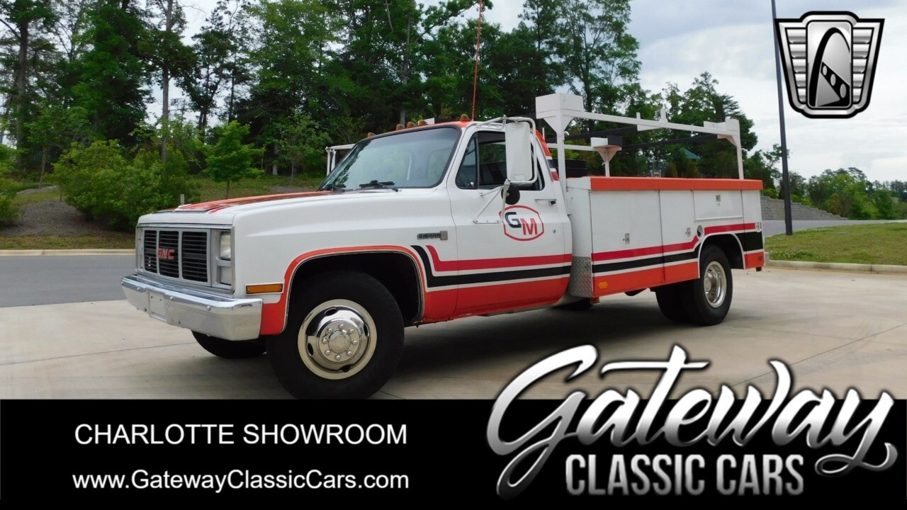 Step into the world of classic trucks with this 1985 GMC C3500. This truck is a standout with its striking white and orange exterior, a color combination that is sure to turn heads wherever you go. The interior is a cool blue, providing a nice contrast to the vibrant exterior.