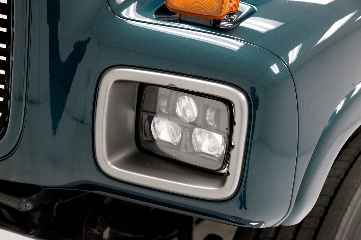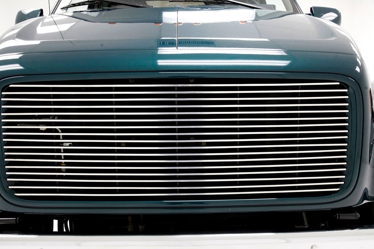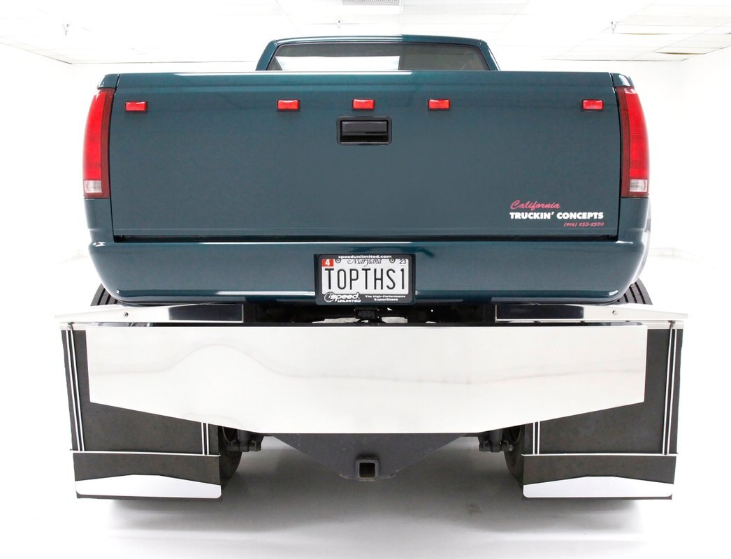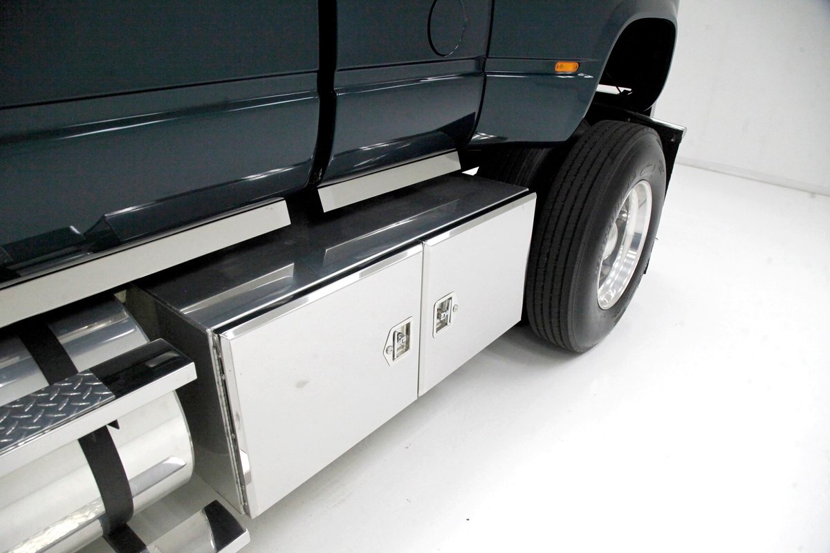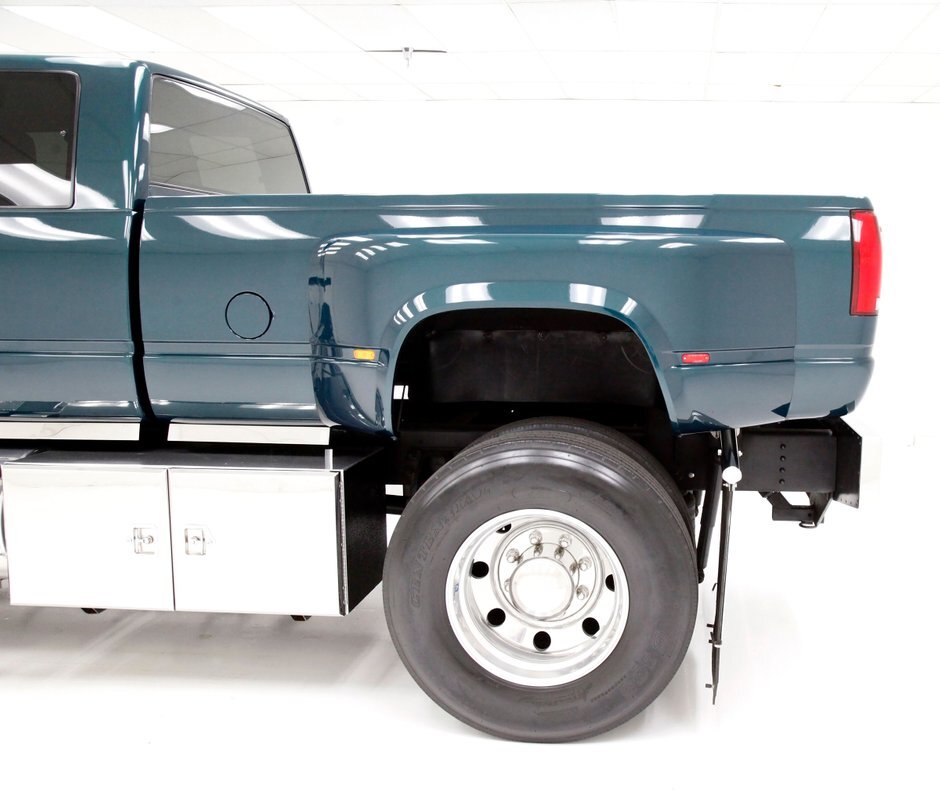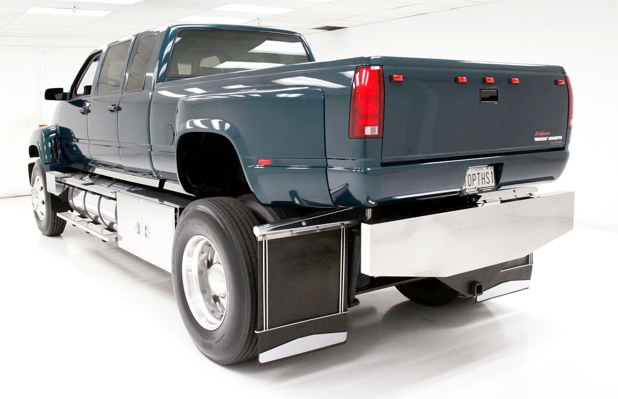 This one of a kind custom built promo truck is essentially made up of 3 trucks: A GMC 6500, a Crewcab dually, and a Suburban. The job is done so well, it's tough to tell exactly which parts are which, but it all comes together in a WOW presentation. Big steel is bathed in Dark Ivy Green Metallic basecoat/clearcoat, and it is all straight as arrows with well minded gaps, and with the amount of steel on this truck that's making a statement as it's a lot to manage! The front is pure GMC with a stainless steel horizontal ribbed grille and 2 massive bump out fenders housing the big square headlight. A colossal piece of chrome in the form of a front bumper is attached just below, and unlike the old locomotives of yore, this is not a cow catcher but a cow killer, or for that matter anything that decides wrongly to get in its way! The tinted window crew cab appears as the Suburban section of this build with its 4 doors and then some even an extra glass for the rear passengers to view the world as it skips by. On the rockers are stainless chromed barrel like fuel tanks, dual steps to climb in and even some rear tool boxes just below the beginnings of the bed. The bed is a full on 8 foot uninterrupted bed as the fenders hang off the sides to cover the dual wheels and tires. Dual large and in charge mud flaps hang off of either side and in the center is another stupendous piece of chrome in the form of a rear bumper. A large hitch is below and towing capacity of over 23,000 lbs. The bed you could not fill enough to reach the total capacity as to weight hauling on this truck. It is lined with textured body matching trunk paint. All this floats on 22.5 inch polished truck wheels and 11R22.5 rubber with 2 of these for each side on back.