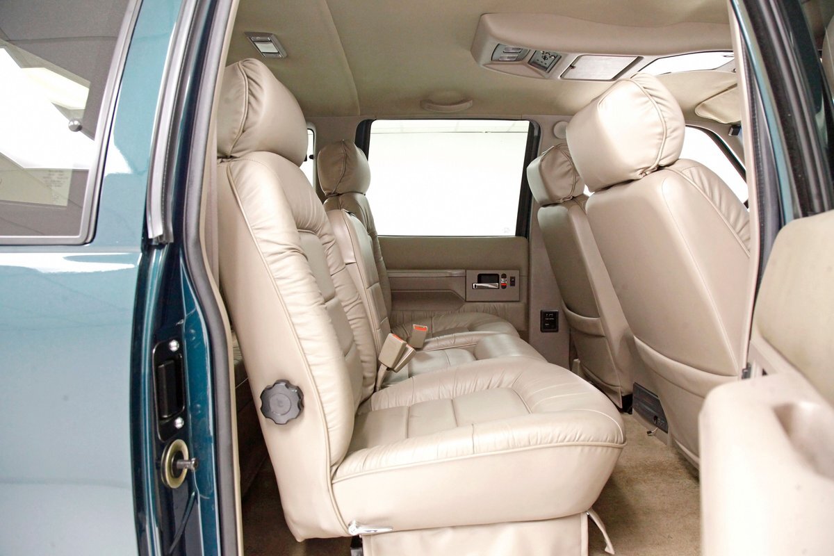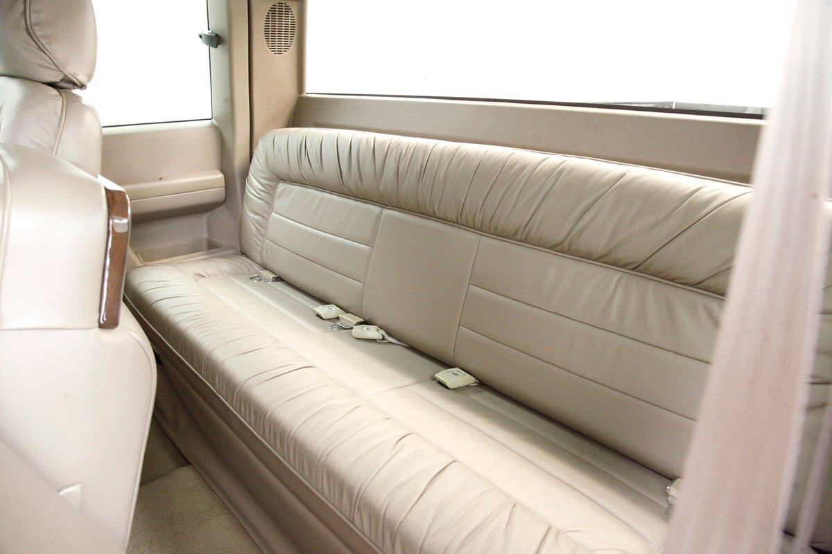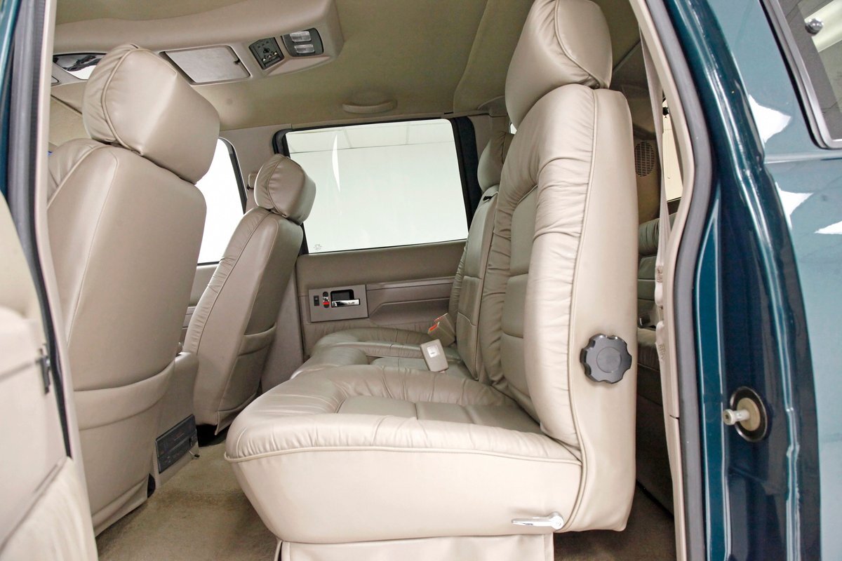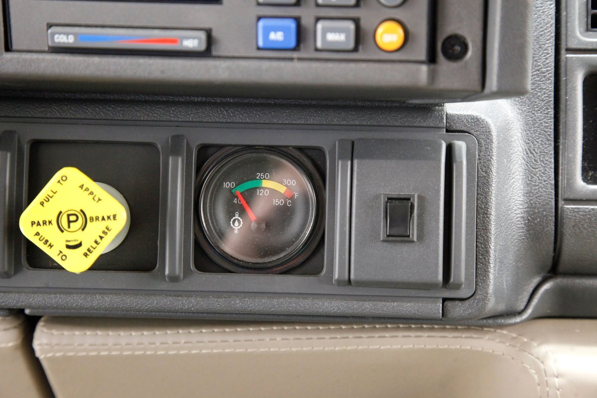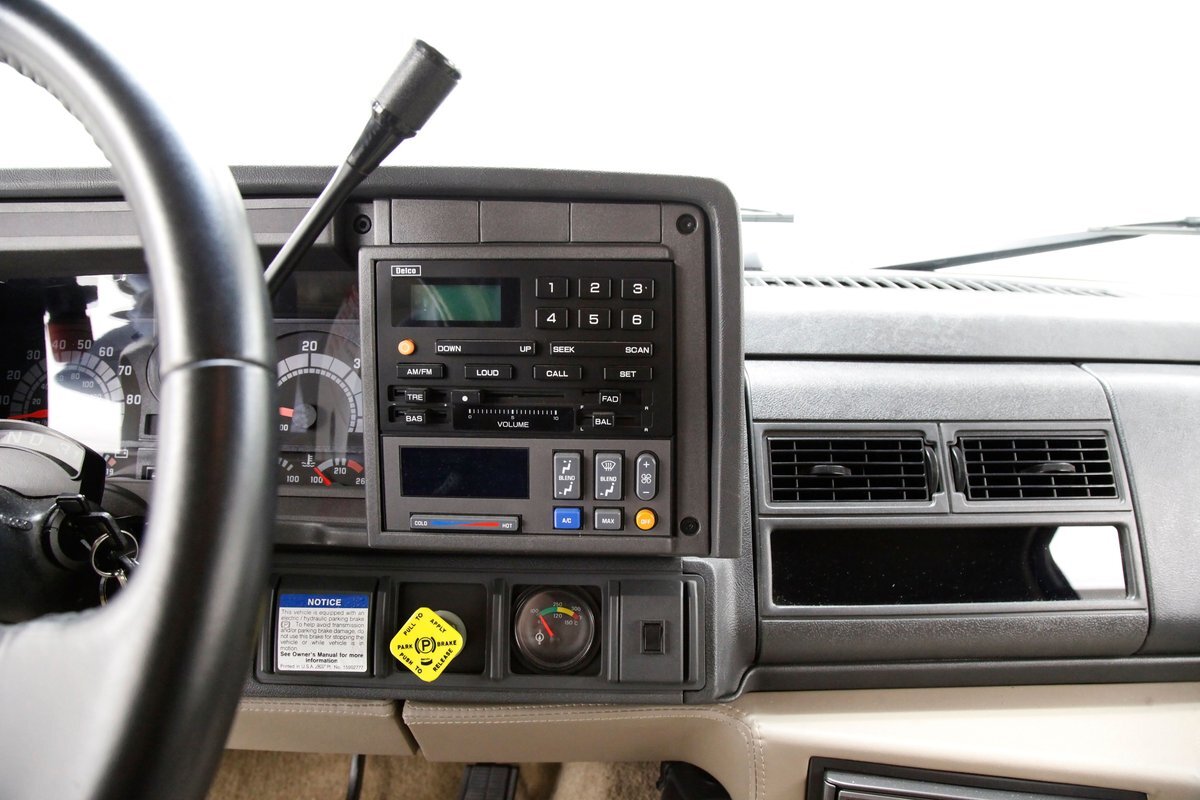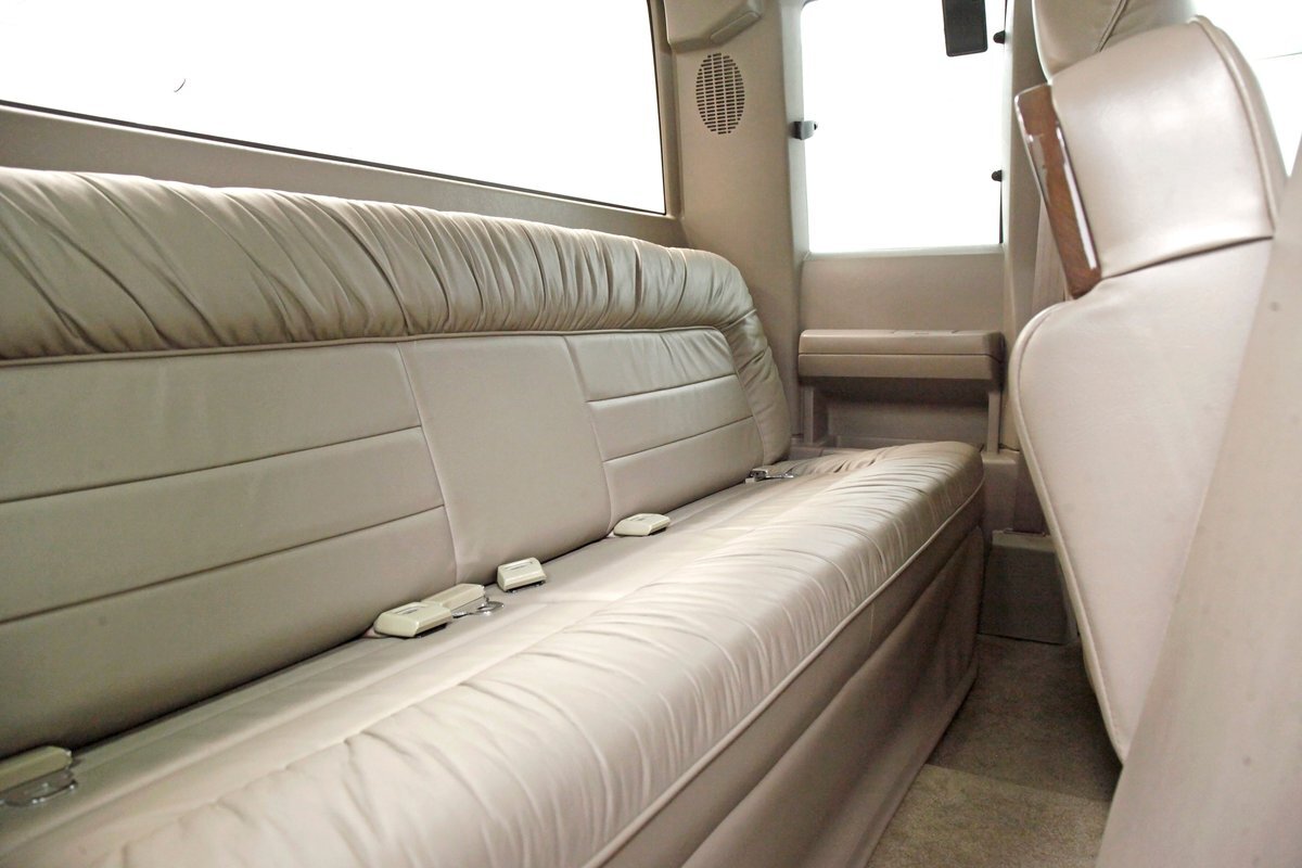 In true big rig fashion, you'll need some gumption to climb up to the driver's seat, over the fuel tanks and over not 1 but 2 steps to get in, it is not for the faint hearted. Once inside you are enveloped in the lap of luxury seated on any one of the front or rear tan leather living room recliners you can grab the wheel or your remote to the TV with VHS player or stereo as it is equipped with both. A square and rectangle dash is in front and shows all the essentials along with many conveniences to poke your fingers at for your comfort. The truck does have an airside bagged suspension activation button and all dash controls are pushbutton. Overhead in a roof console if you will, is the drop down TV, some lighting, input jacks and a bit of small item storage bins. The rear passengers are treated to a trio of chairs all slammed together all fun full tan luxurious leather and plenty of room for 3. The center seat back doubles as an armrest and there are climate controls and other conveniences available to these rear passengers. Tan carpeting floods the floors and right down to the door panels inside which all these features reside, is pure luxury with leather and vinyl power toggles and speakers. And if this is not enough a 3rd row leather seat is in which is a luxurious "simple", (not), bench also in tufted leather and room for another 3. A picture window gives the rear passengers something to peer out of to view the cargo being hauled.
