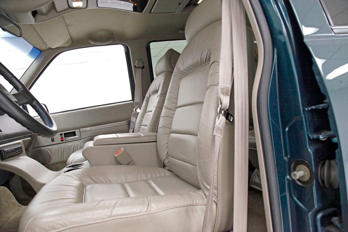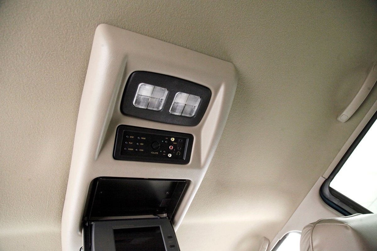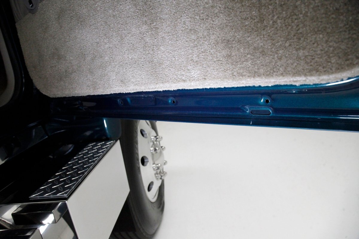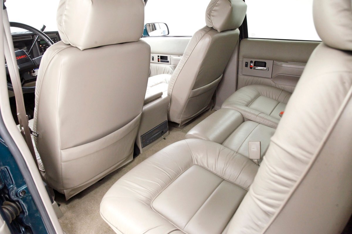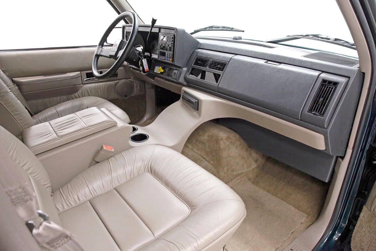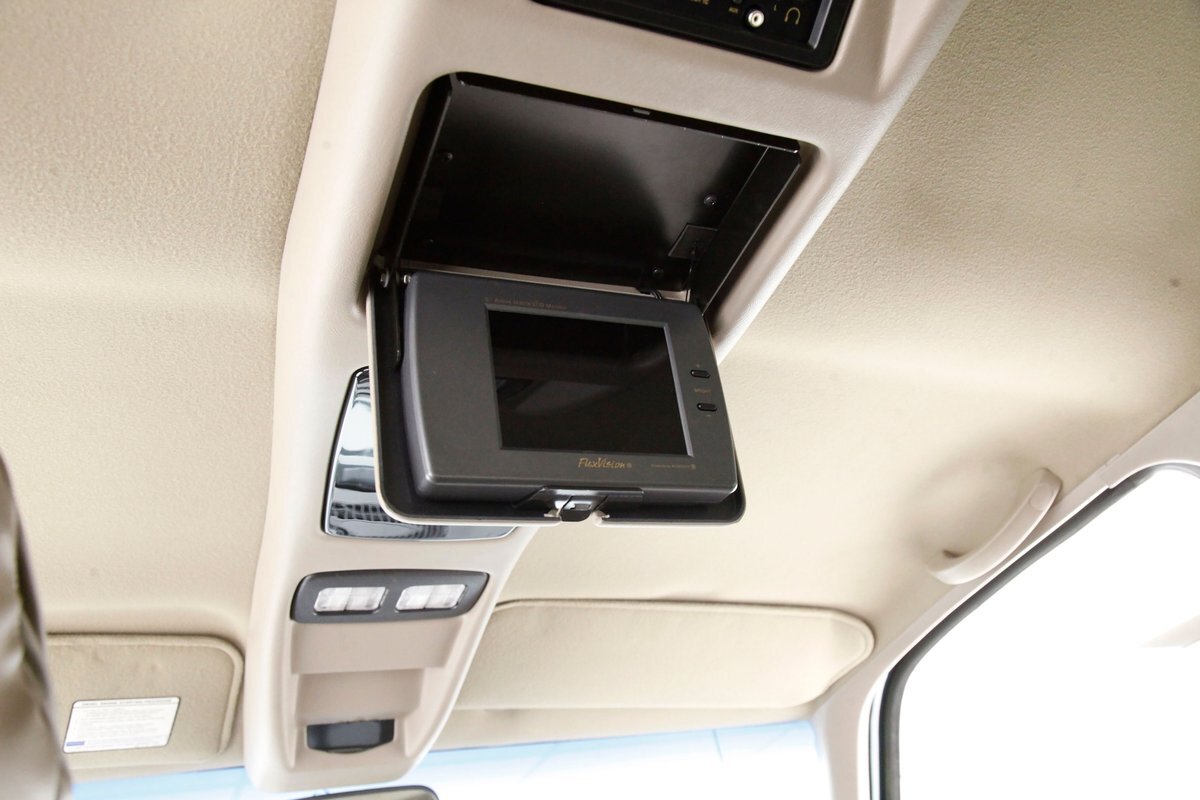 In true big rig fashion, you'll need some gumption to climb up to the driver's seat, over the fuel tanks and over not 1 but 2 steps to get in, it is not for the faint hearted. Once inside you are enveloped in the lap of luxury seated on any one of the front or rear tan leather living room recliners you can grab the wheel or your remote to the TV with VHS player or stereo as it is equipped with both. A square and rectangle dash is in front and shows all the essentials along with many conveniences to poke your fingers at for your comfort. The truck does have an airside bagged suspension activation button and all dash controls are pushbutton. Overhead in a roof console if you will, is the drop down TV, some lighting, input jacks and a bit of small item storage bins. The rear passengers are treated to a trio of chairs all slammed together all fun full tan luxurious leather and plenty of room for 3. The center seat back doubles as an armrest and there are climate controls and other conveniences available to these rear passengers. Tan carpeting floods the floors and right down to the door panels inside which all these features reside, is pure luxury with leather and vinyl power toggles and speakers. And if this is not enough a 3rd row leather seat is in which is a luxurious "simple", (not), bench also in tufted leather and room for another 3. A picture window gives the rear passengers something to peer out of to view the cargo being hauled.