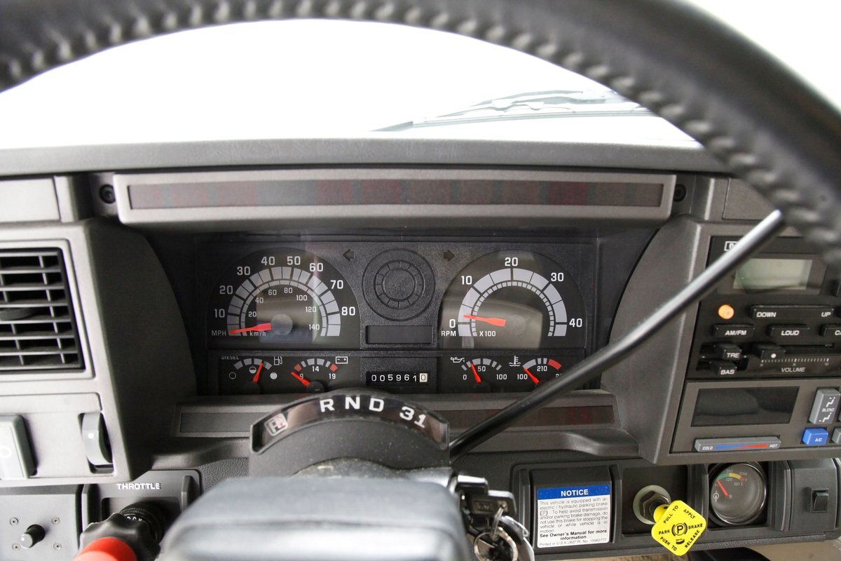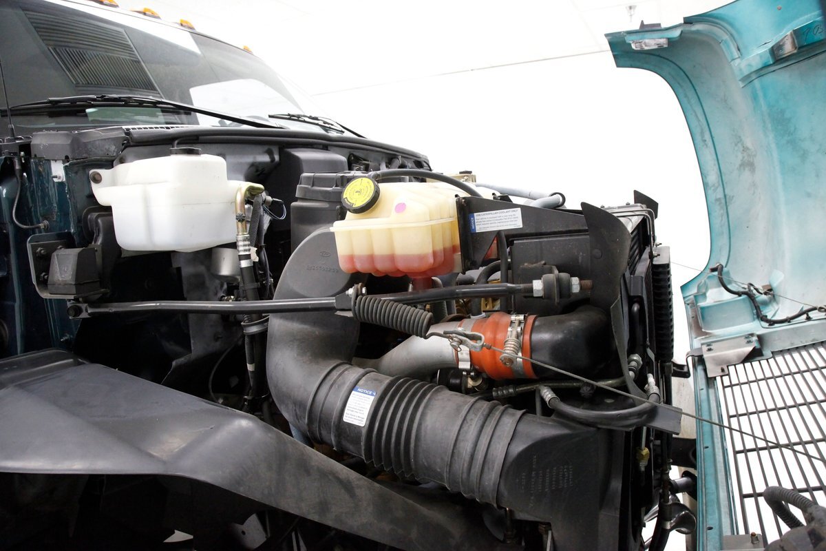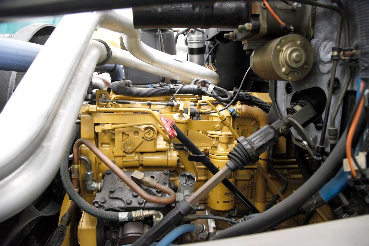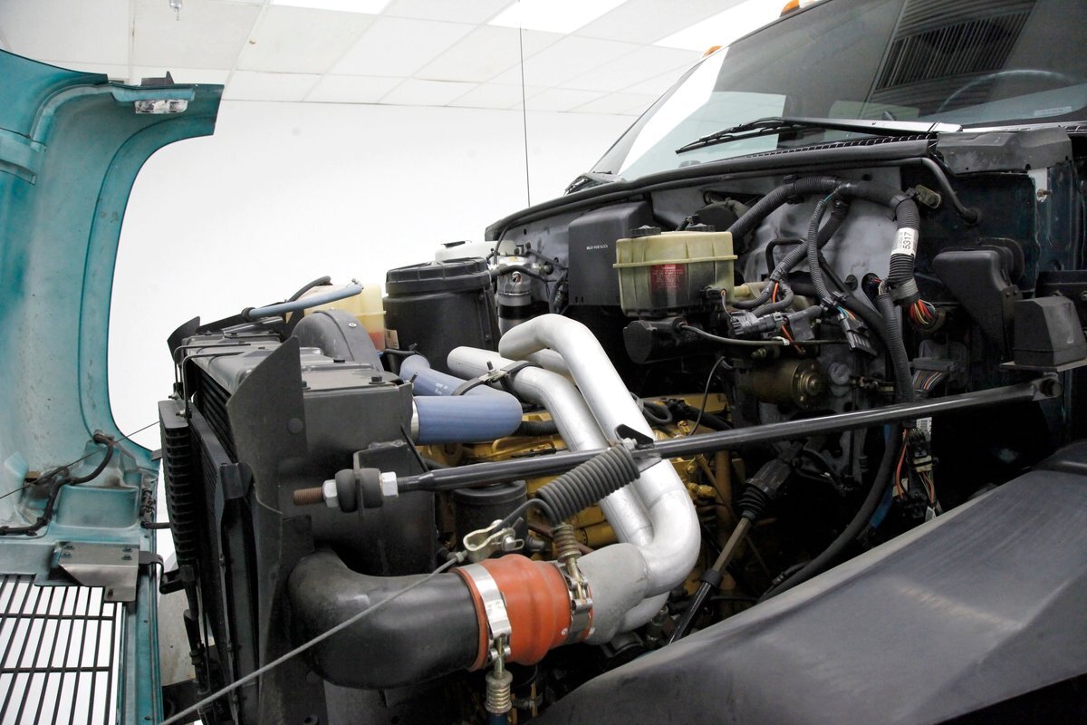 A flip forward of the front hinged fiberglass hood reveals a Cat 3116 6.6 liter inline 6 cylinder powerhouse capable of producing 205 horses. It is fed diesel by EFI and sports an Allison AT545 4-speed automatic transmission on back. A heavy duty rear axle keeps your rolling down the highway.