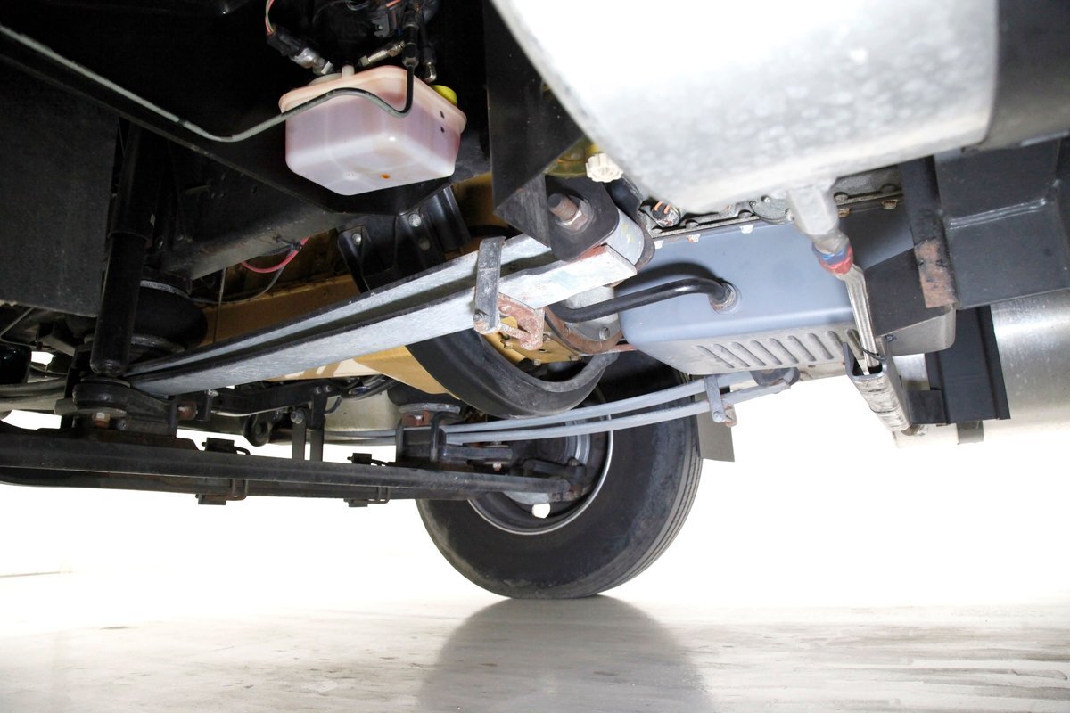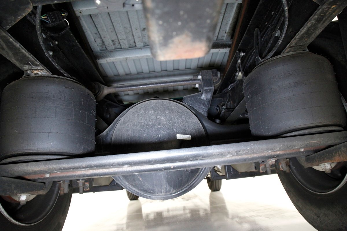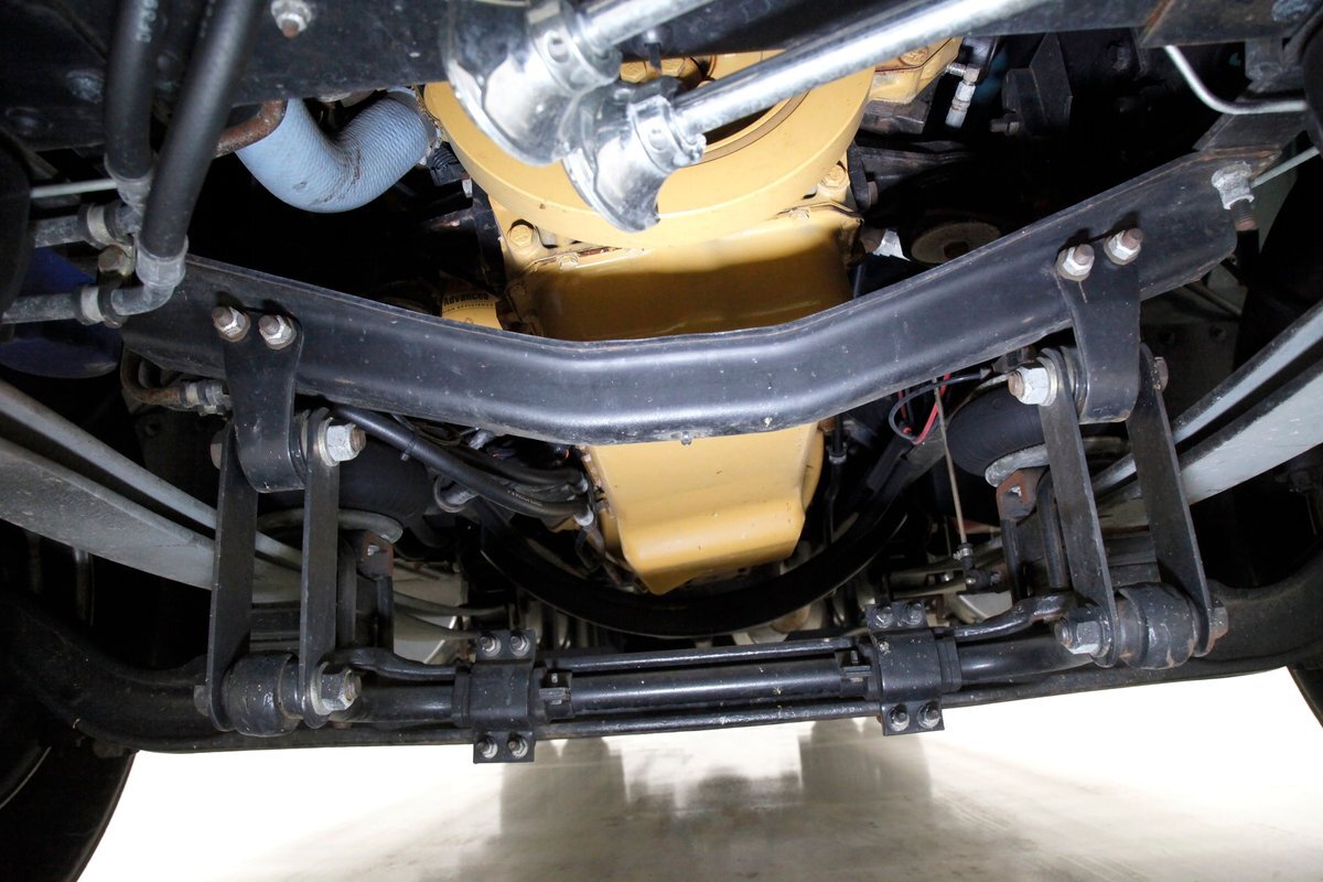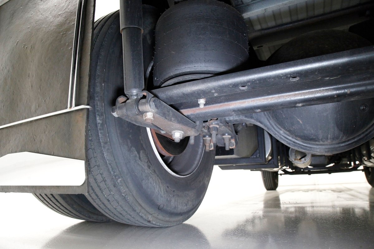 All clean, no rust, just black structural steel and stamped steel for the floor pans which have green overspray on them. Airbags are on for the suspension as well as leaf springs and the same set up is seen on the rear axle. Power disc braking is on all 4 corners.