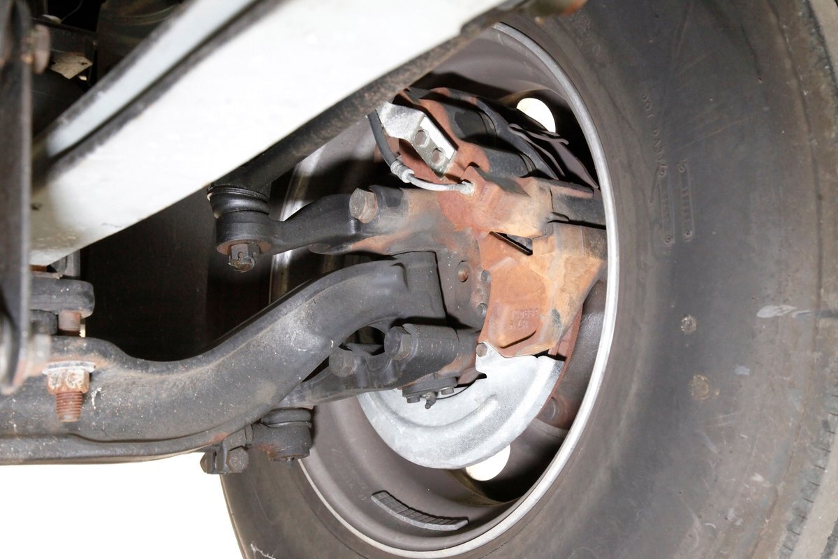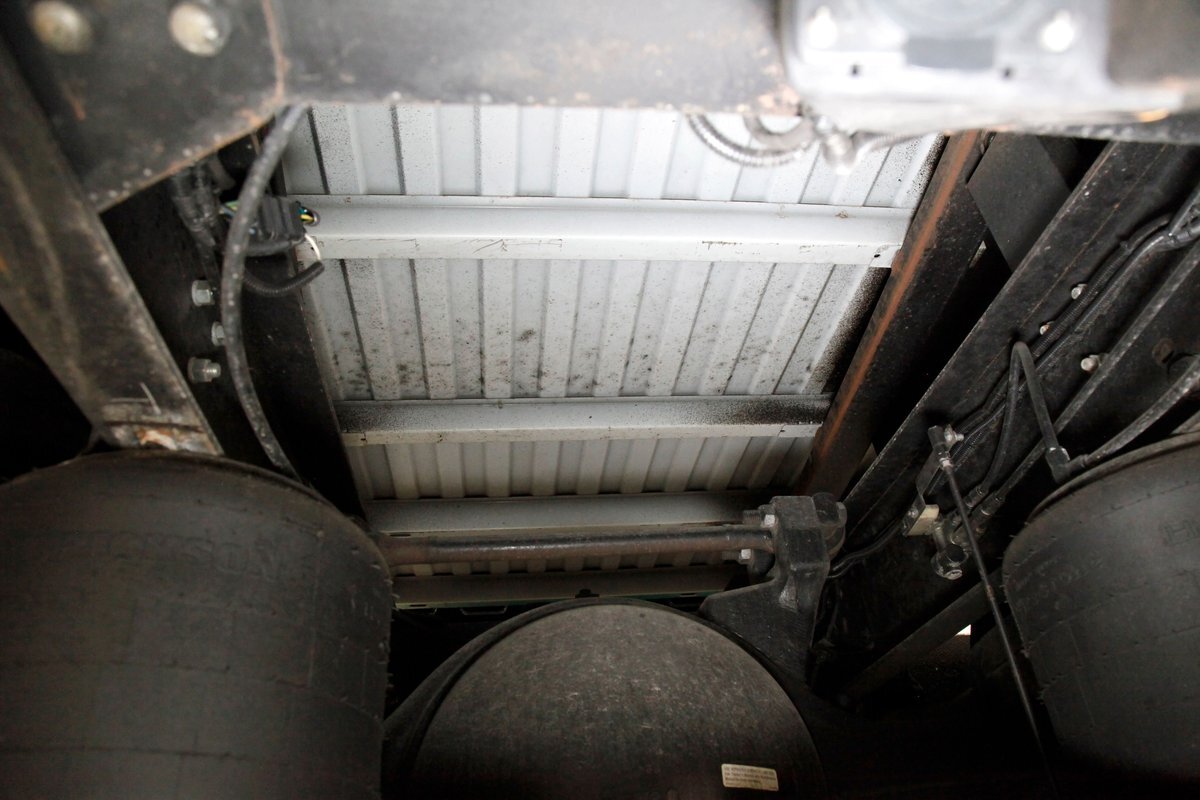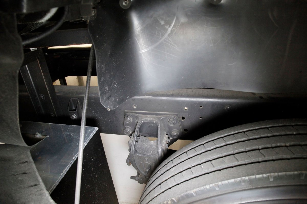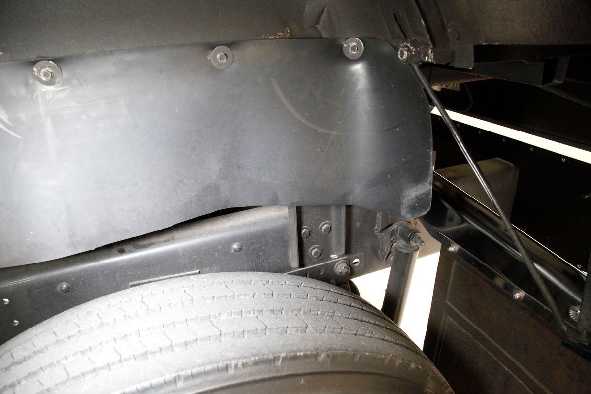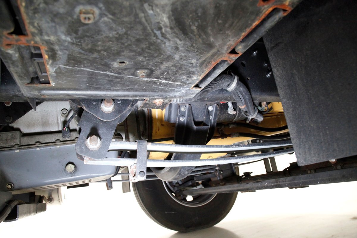 All clean, no rust, just black structural steel and stamped steel for the floor pans which have green overspray on them. Airbags are on for the suspension as well as leaf springs and the same set up is seen on the rear axle. Power disc braking is on all 4 corners.