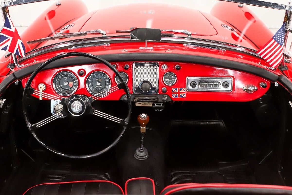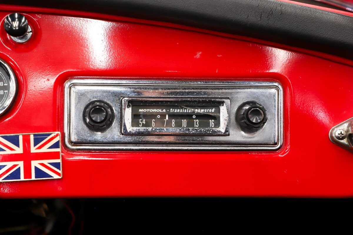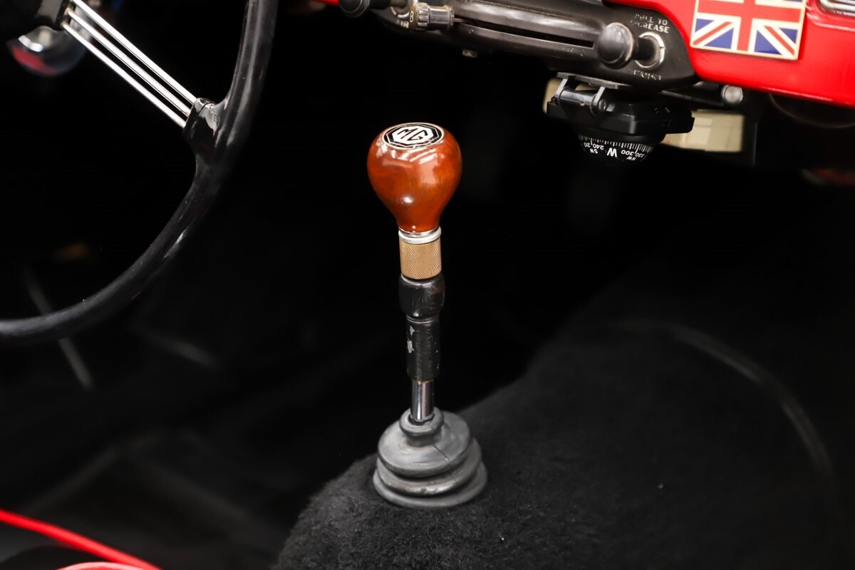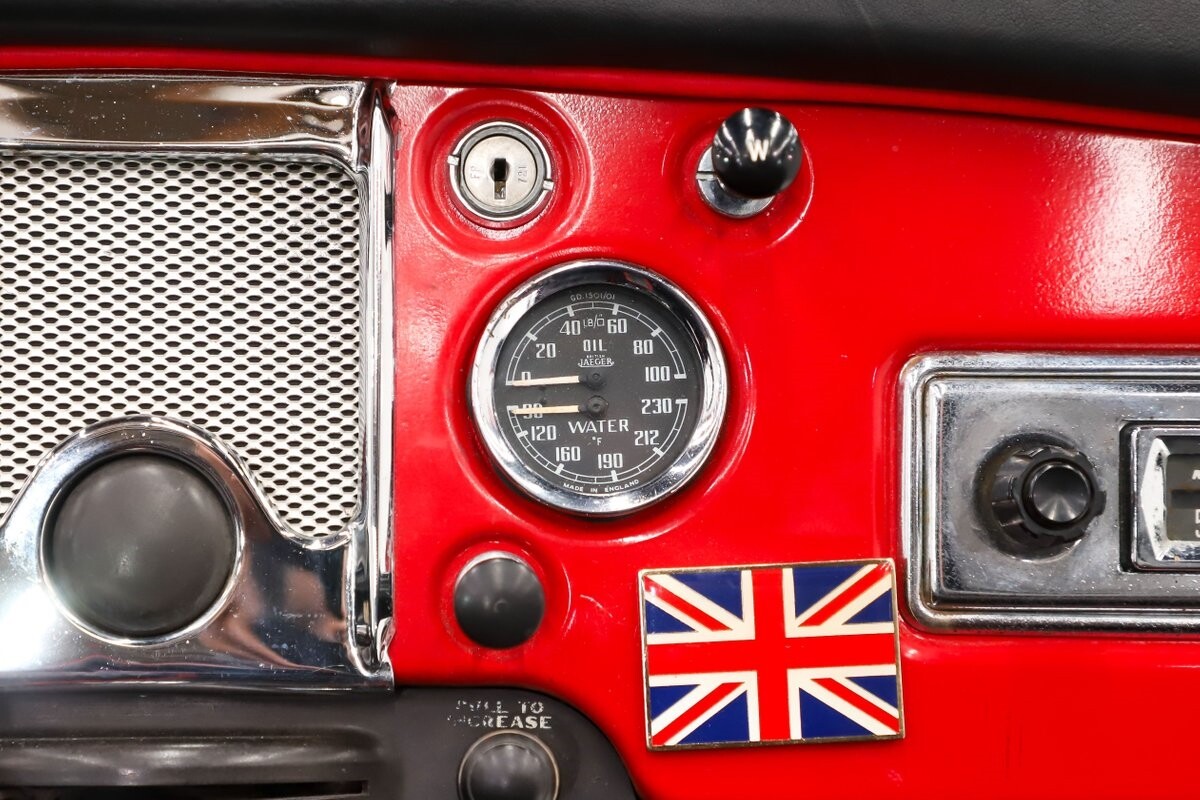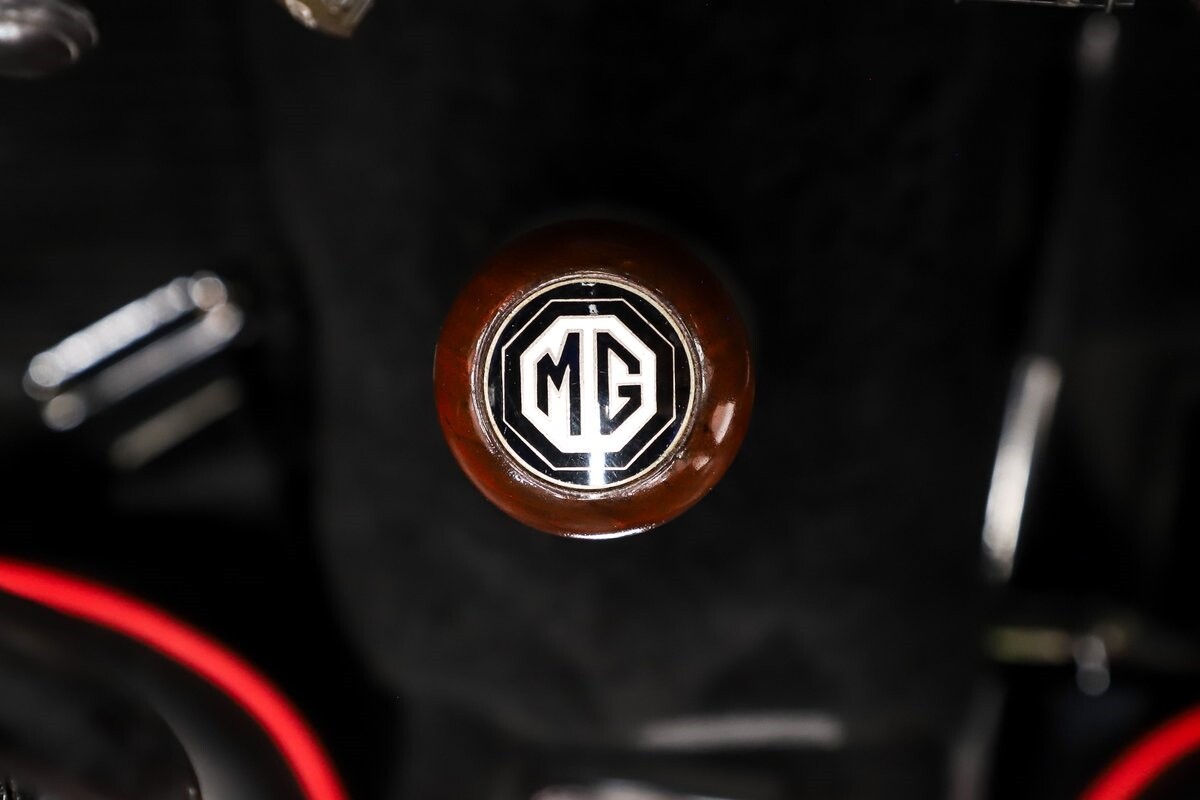 INTERIOR: The cabin is simplistic yet intriguing. The dash reminds you of an airplane cockpit. The gauges are stylish, matching, and complete with tachometer. It's even equipped with the factory AM radio and hidden under the dash is an 8-track player and speakers. Comfortable black with red piping bucket seats make driving this pleasurable. Other options include adjustable choke and throttle, and map lighting for your passenger to guide you on your road trip. Our favorite feature must be the original style 4 speed shifter coming up from the floor and completed with an authentic MG wood shift knob.