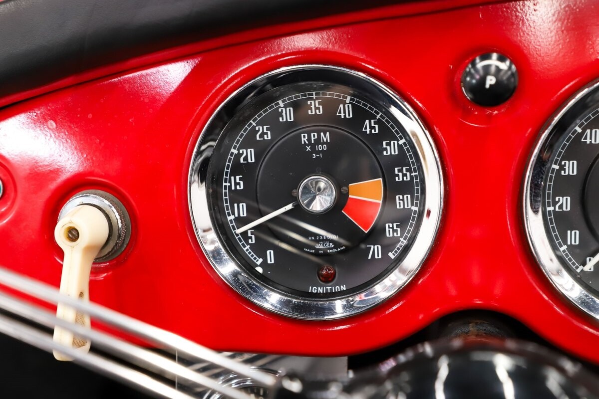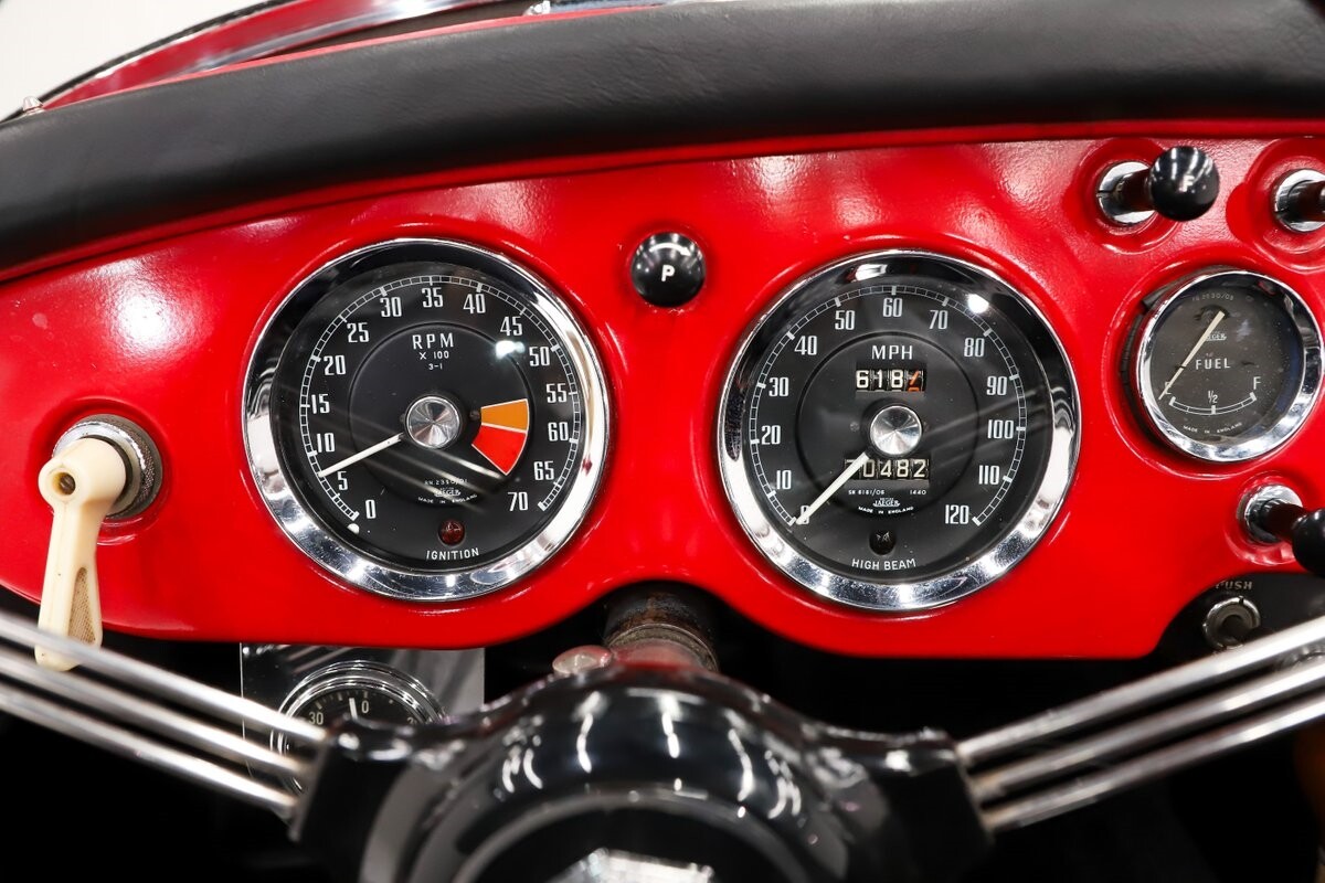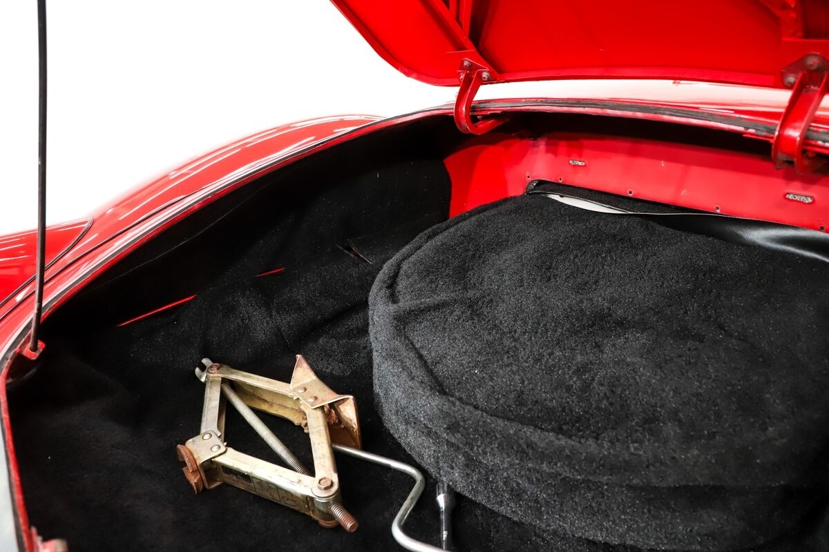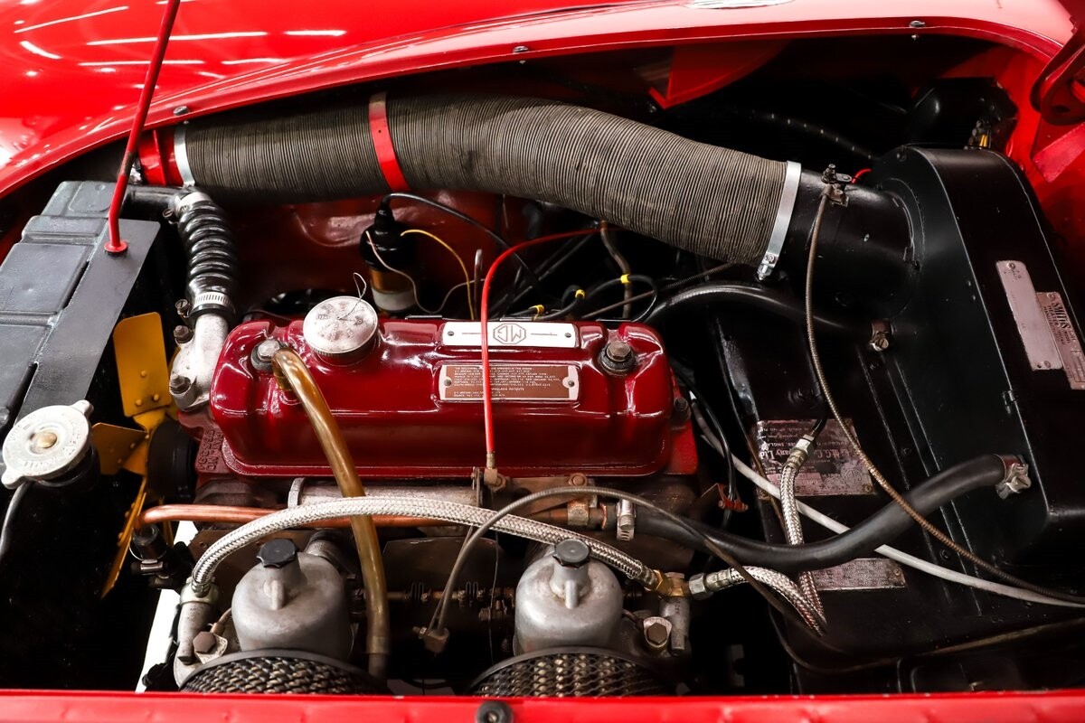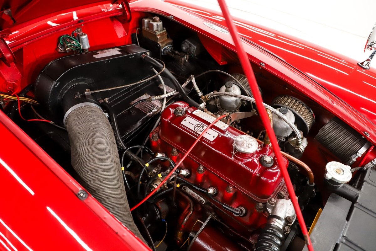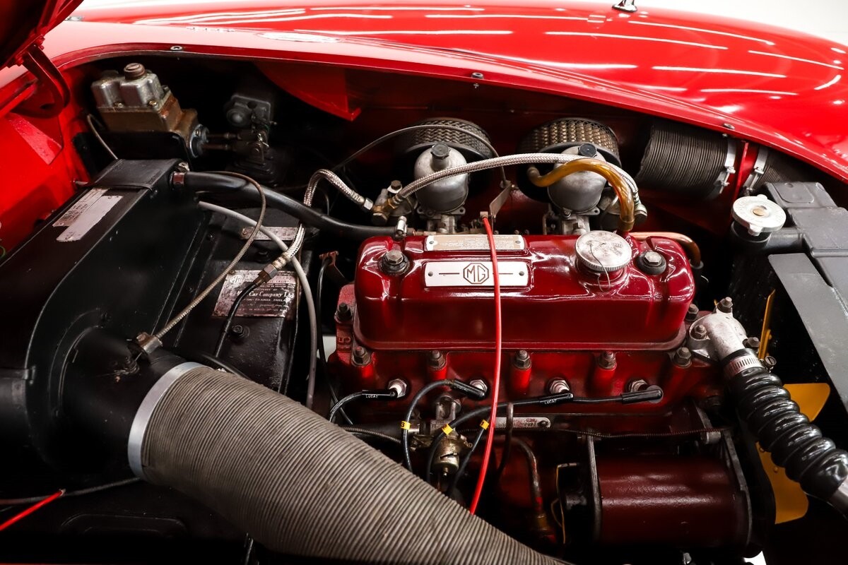 INTERIOR: The cabin is simplistic yet intriguing. The dash reminds you of an airplane cockpit. The gauges are stylish, matching, and complete with tachometer. It's even equipped with the factory AM radio and hidden under the dash is an 8-track player and speakers. Comfortable black with red piping bucket seats make driving this pleasurable. Other options include adjustable choke and throttle, and map lighting for your passenger to guide you on your road trip. Our favorite feature must be the original style 4 speed shifter coming up from the floor and completed with an authentic MG wood shift knob.