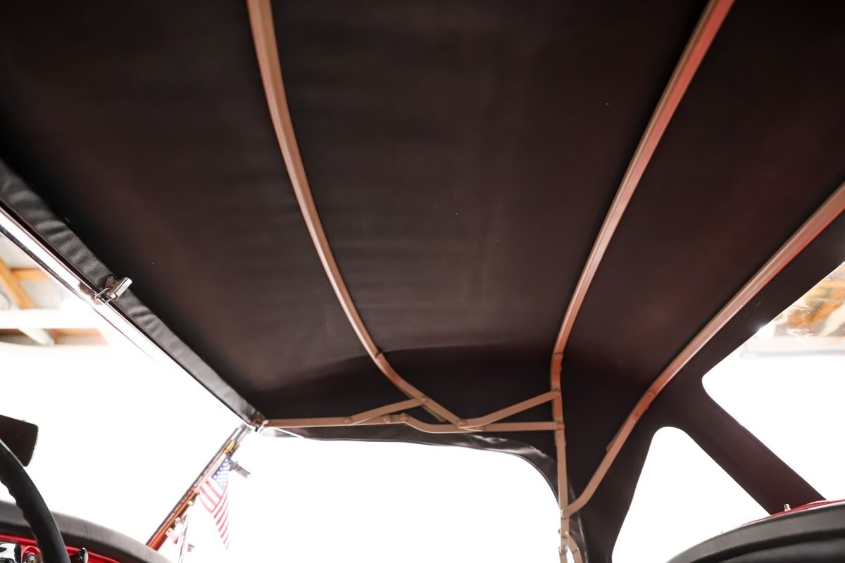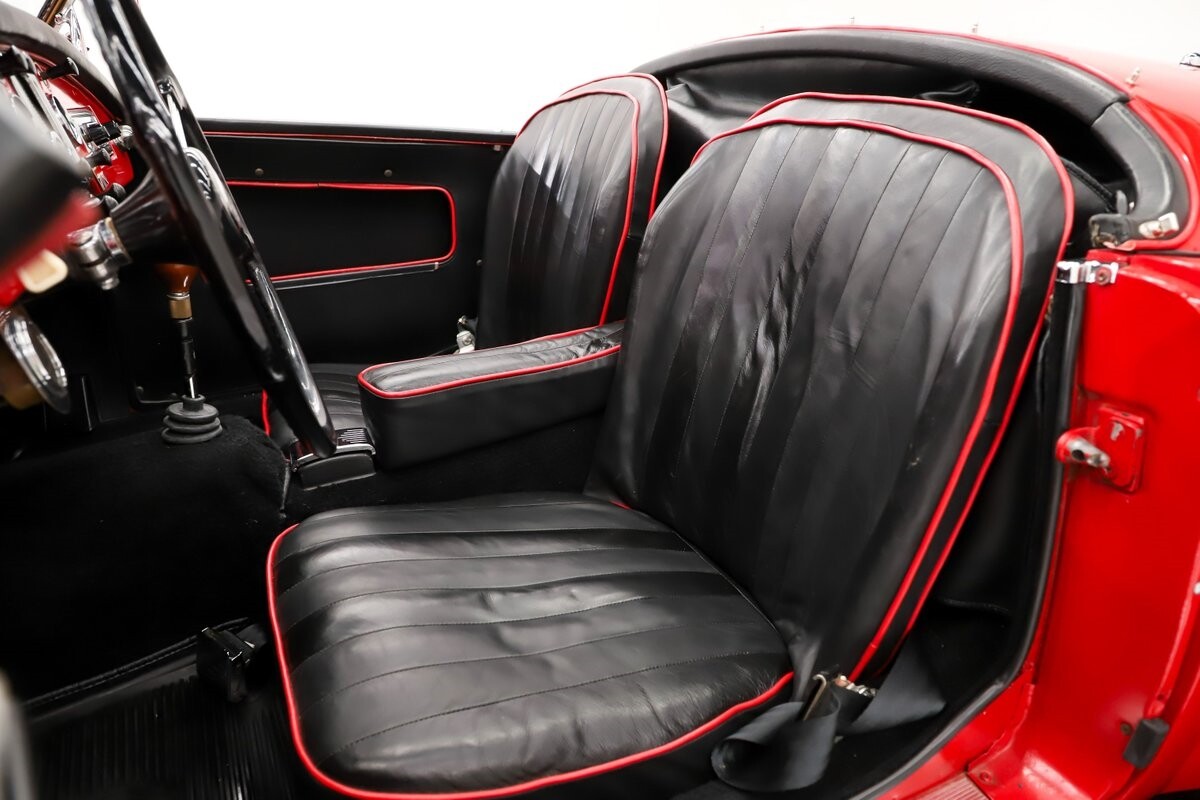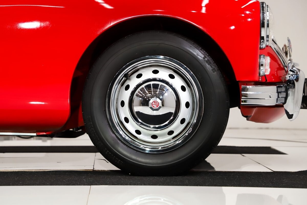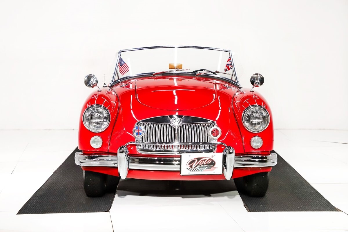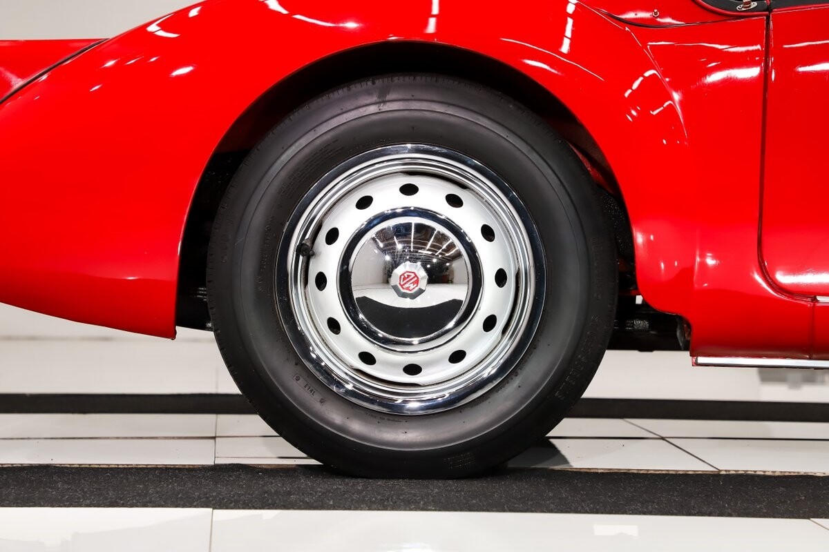 INTERIOR: The cabin is simplistic yet intriguing. The dash reminds you of an airplane cockpit. The gauges are stylish, matching, and complete with tachometer. It's even equipped with the factory AM radio and hidden under the dash is an 8-track player and speakers. Comfortable black with red piping bucket seats make driving this pleasurable. Other options include adjustable choke and throttle, and map lighting for your passenger to guide you on your road trip. Our favorite feature must be the original style 4 speed shifter coming up from the floor and completed with an authentic MG wood shift knob.