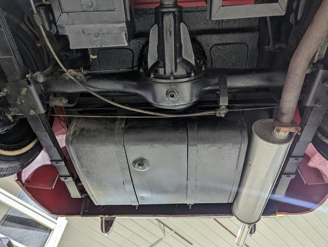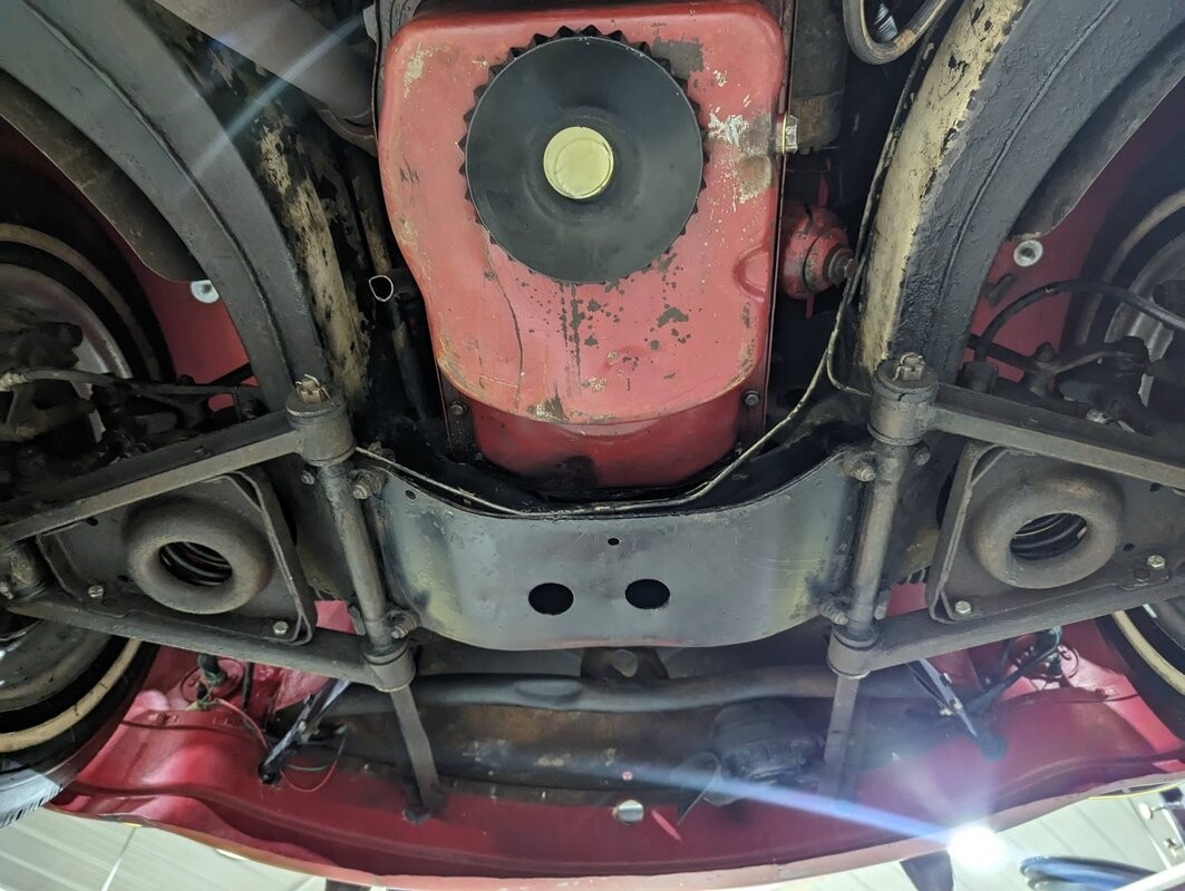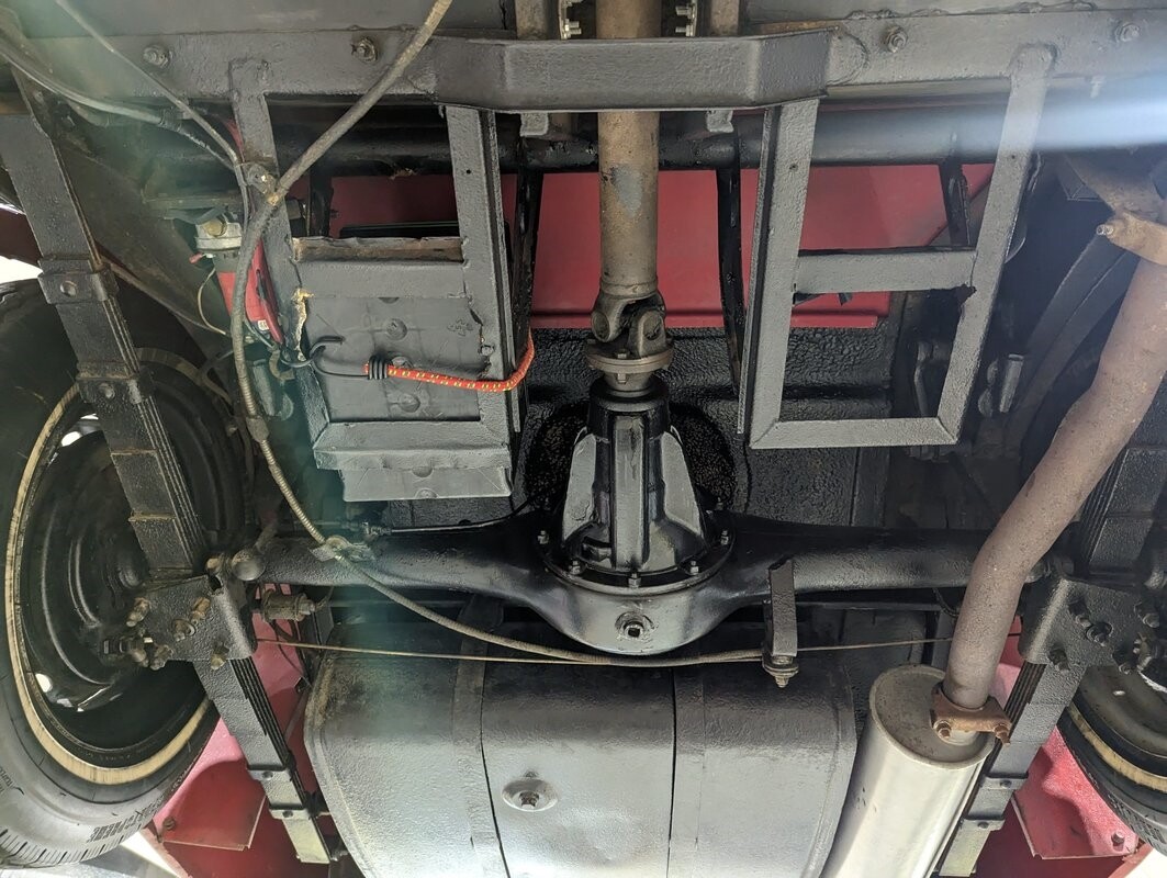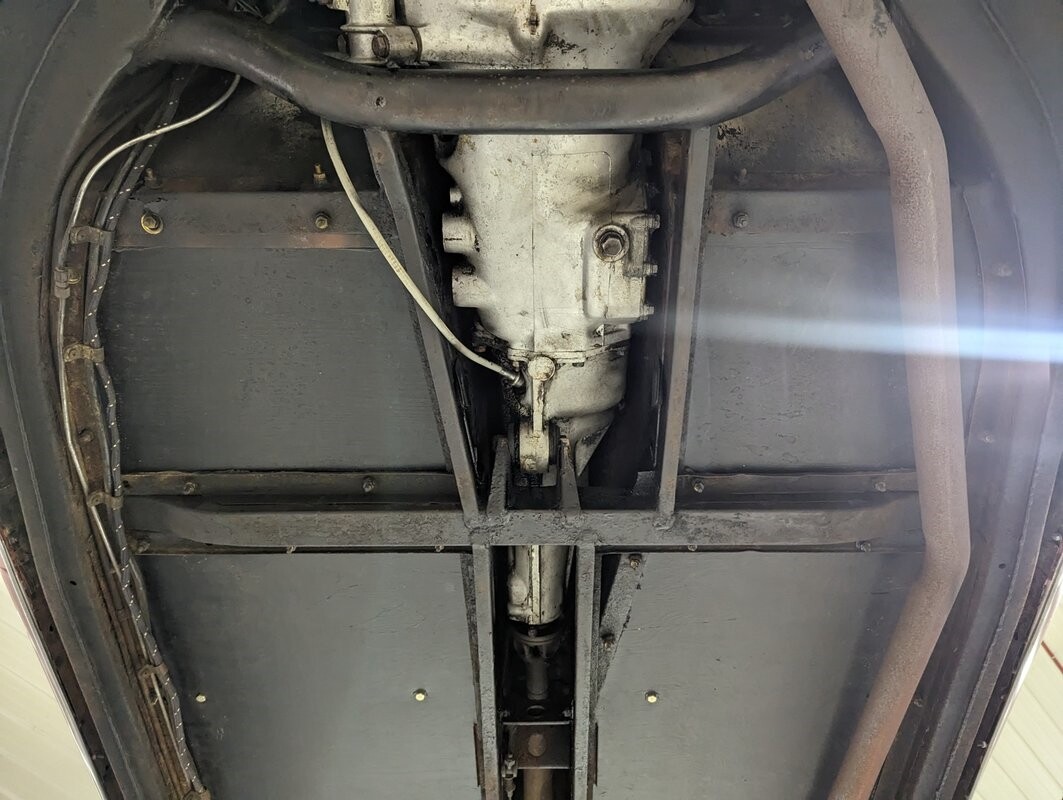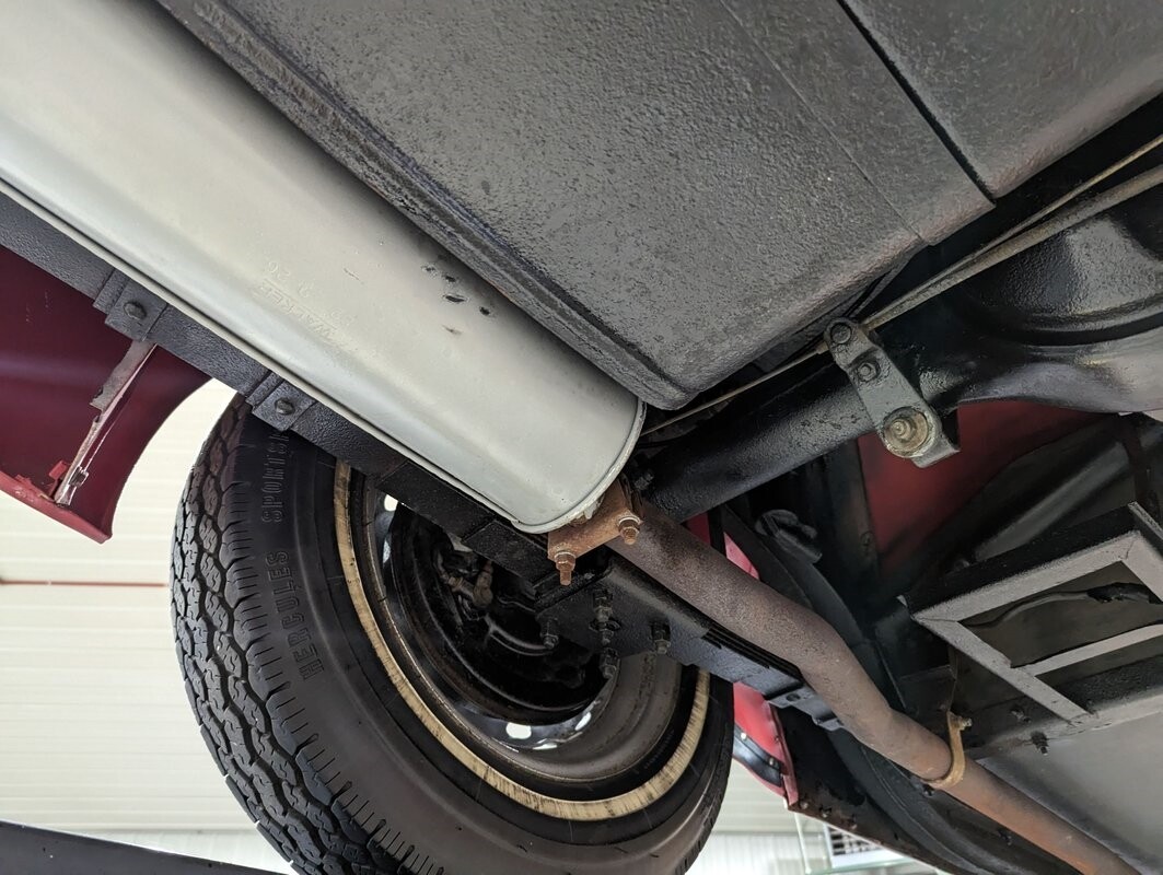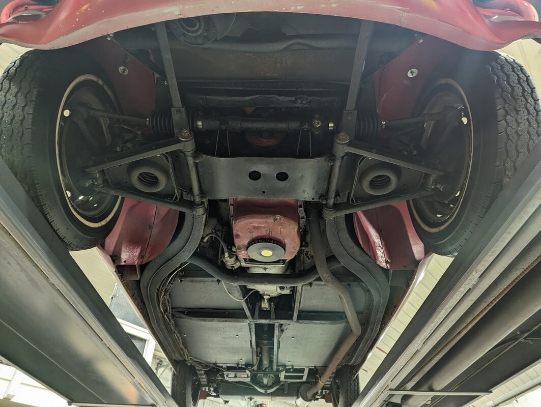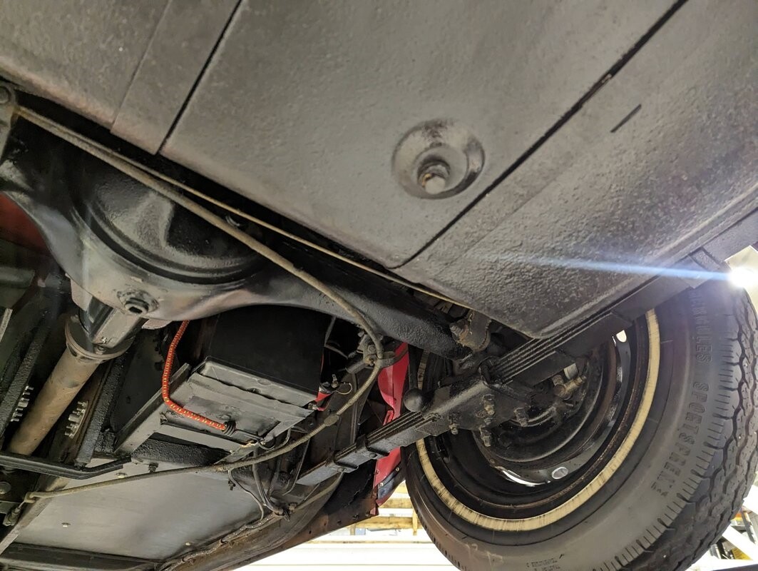 UNDERSIDE: Ground up restoration that's rust free. Everything was gone through. The independent front suspension looks to be in great shape. It features rack and pinion steering and front disc brakes. The rear leaf springs were replaced, and the rear drum brakes rebuilt. Braided fuel lines were installed, and the gas tank was cleaned, prepped, and painted black. The fuel tank was refurbished and painted a nice satin black. The correct exhaust is hung properly and has a newer coated Walker muffler. The engine is painted and looks clean. It's mated to its correct 4 speed manual transmission. The rear end has been prepped, painted, and refinished in satin black. The frame and floors were stripped, prepped, and undercoated in a black texture guard.
