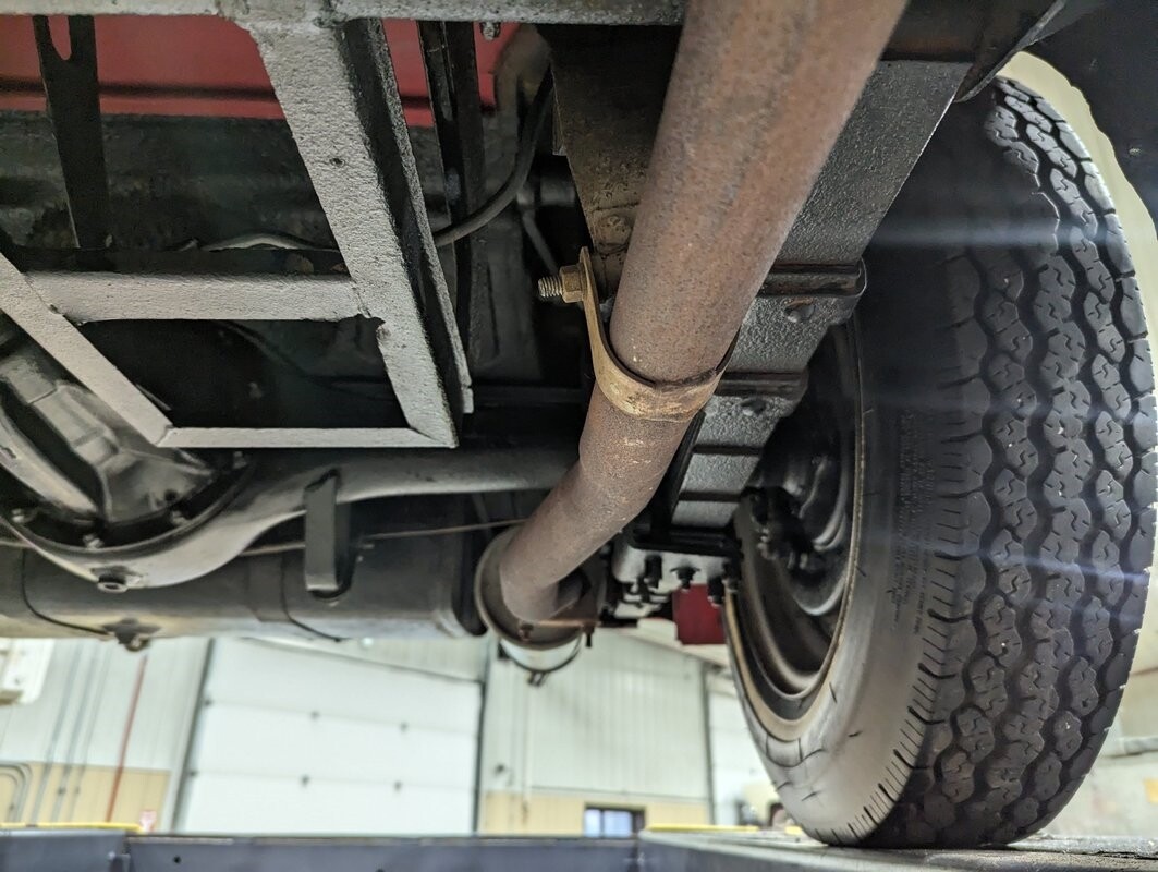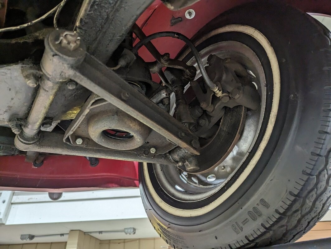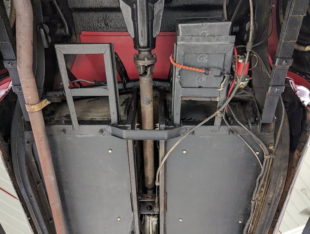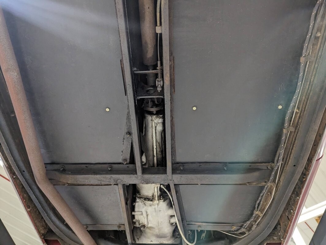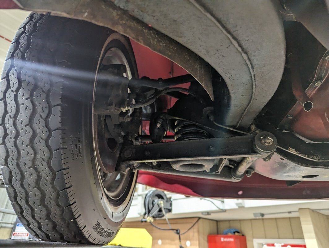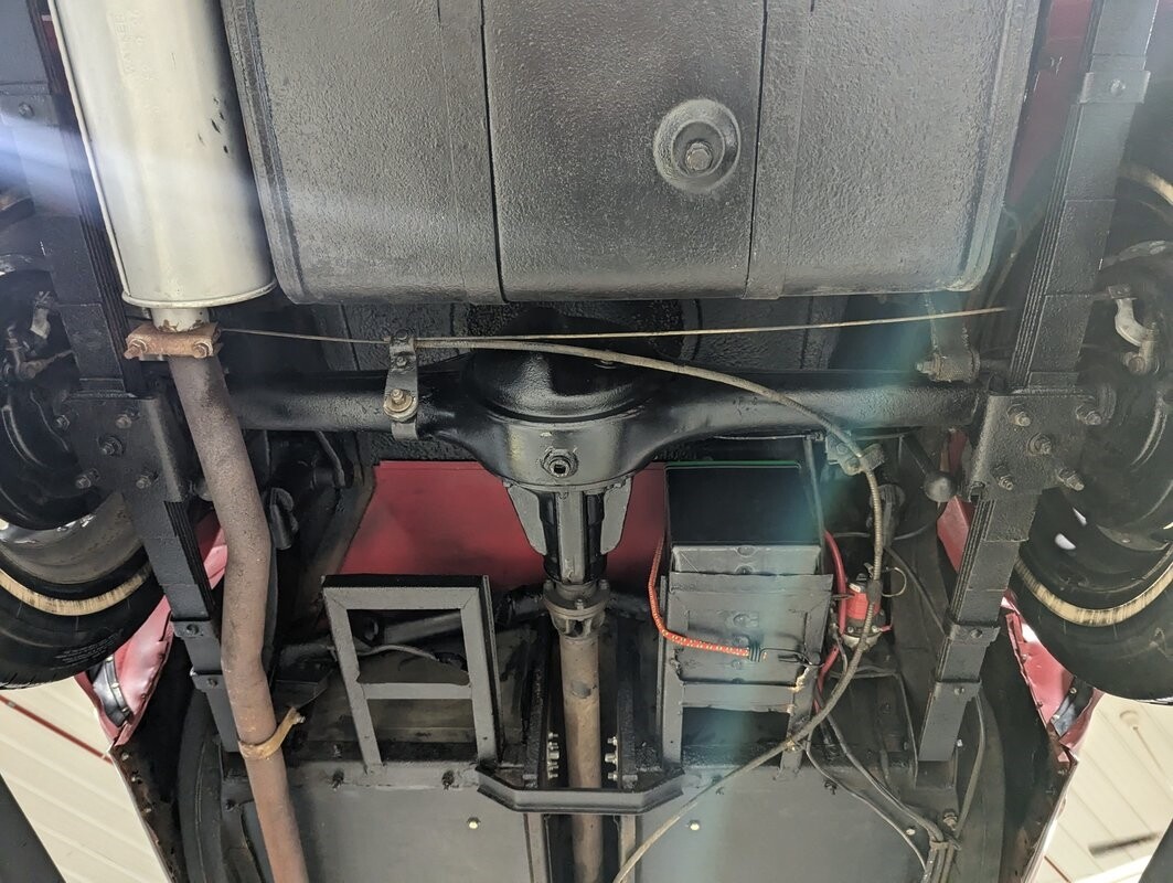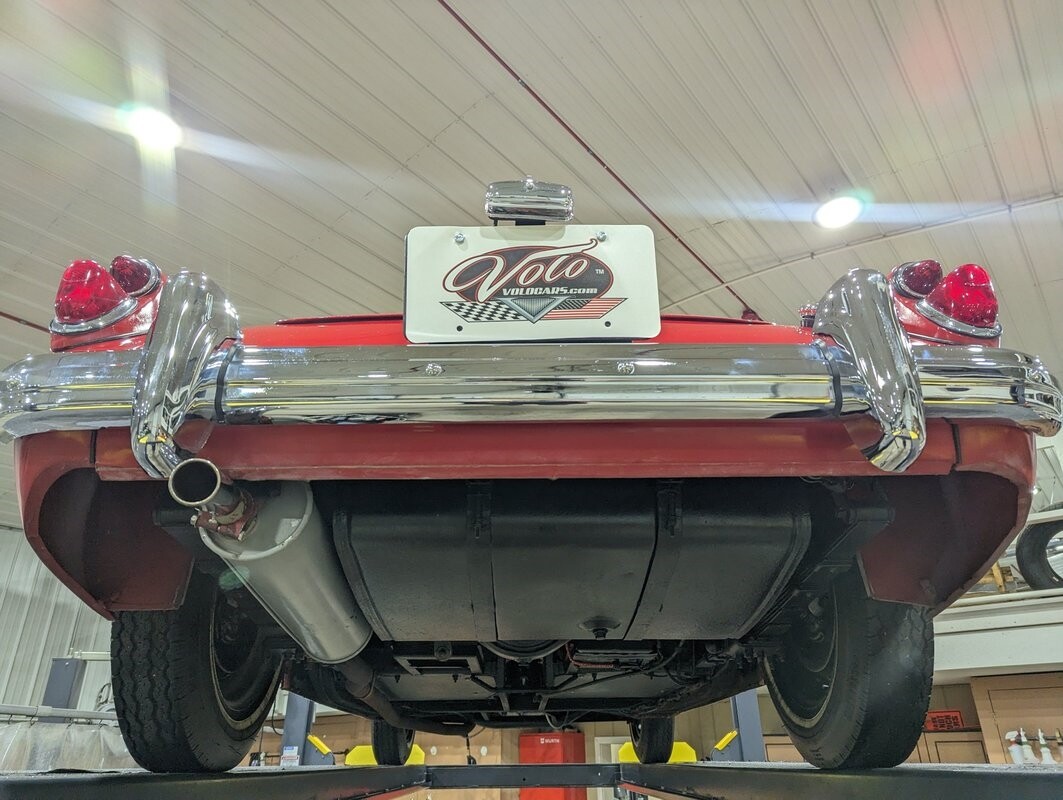 UNDERSIDE: Ground up restoration that's rust free. Everything was gone through. The independent front suspension looks to be in great shape. It features rack and pinion steering and front disc brakes. The rear leaf springs were replaced, and the rear drum brakes rebuilt. Braided fuel lines were installed, and the gas tank was cleaned, prepped, and painted black. The fuel tank was refurbished and painted a nice satin black. The correct exhaust is hung properly and has a newer coated Walker muffler. The engine is painted and looks clean. It's mated to its correct 4 speed manual transmission. The rear end has been prepped, painted, and refinished in satin black. The frame and floors were stripped, prepped, and undercoated in a black texture guard.