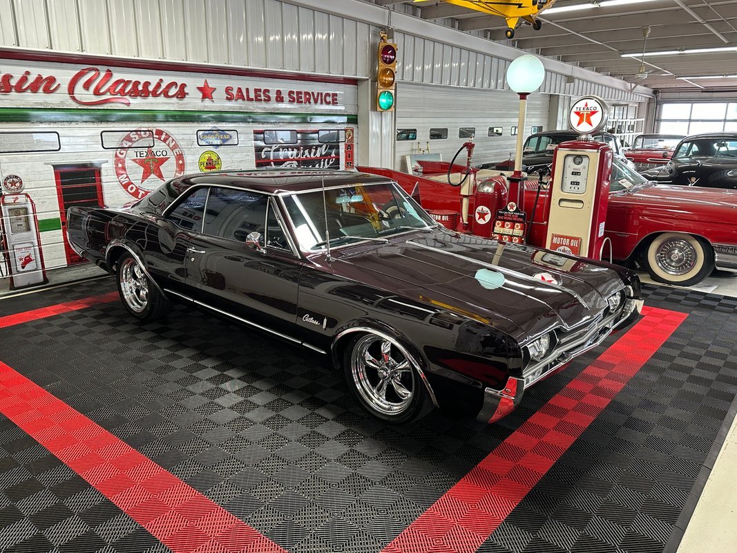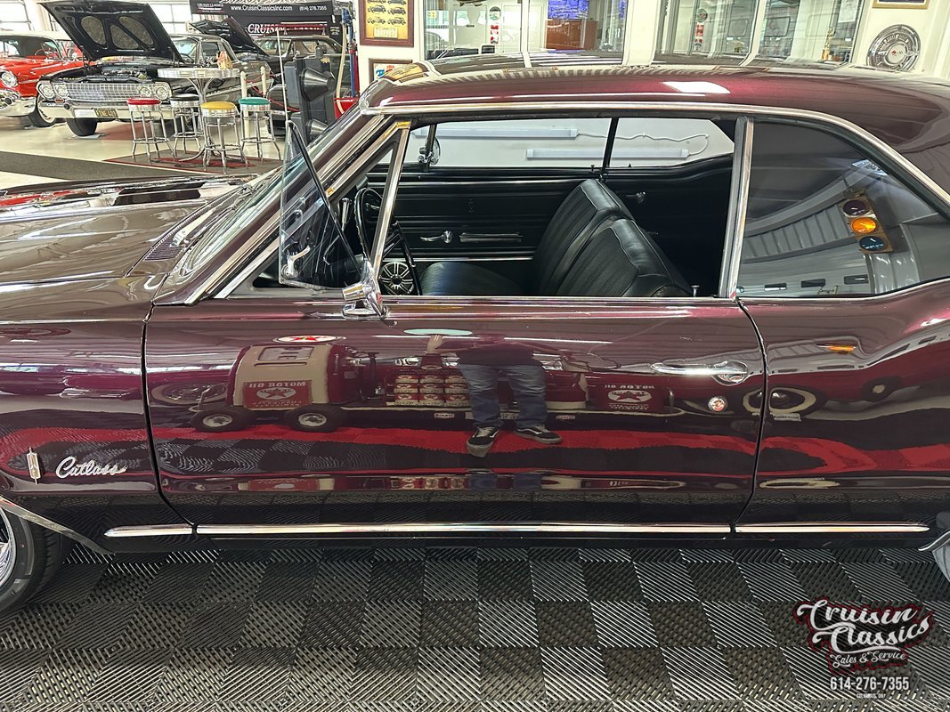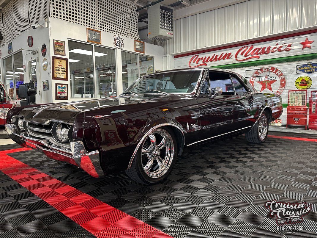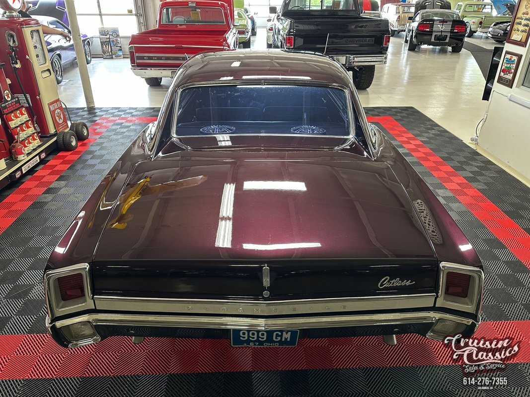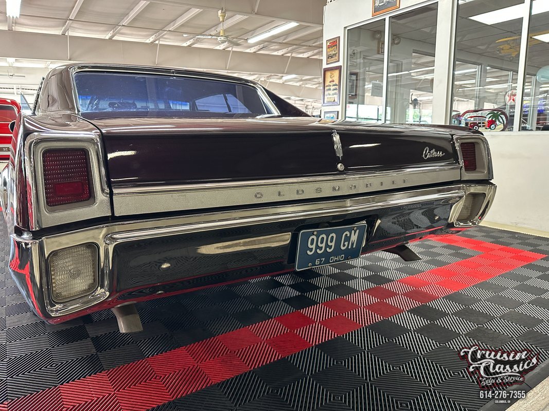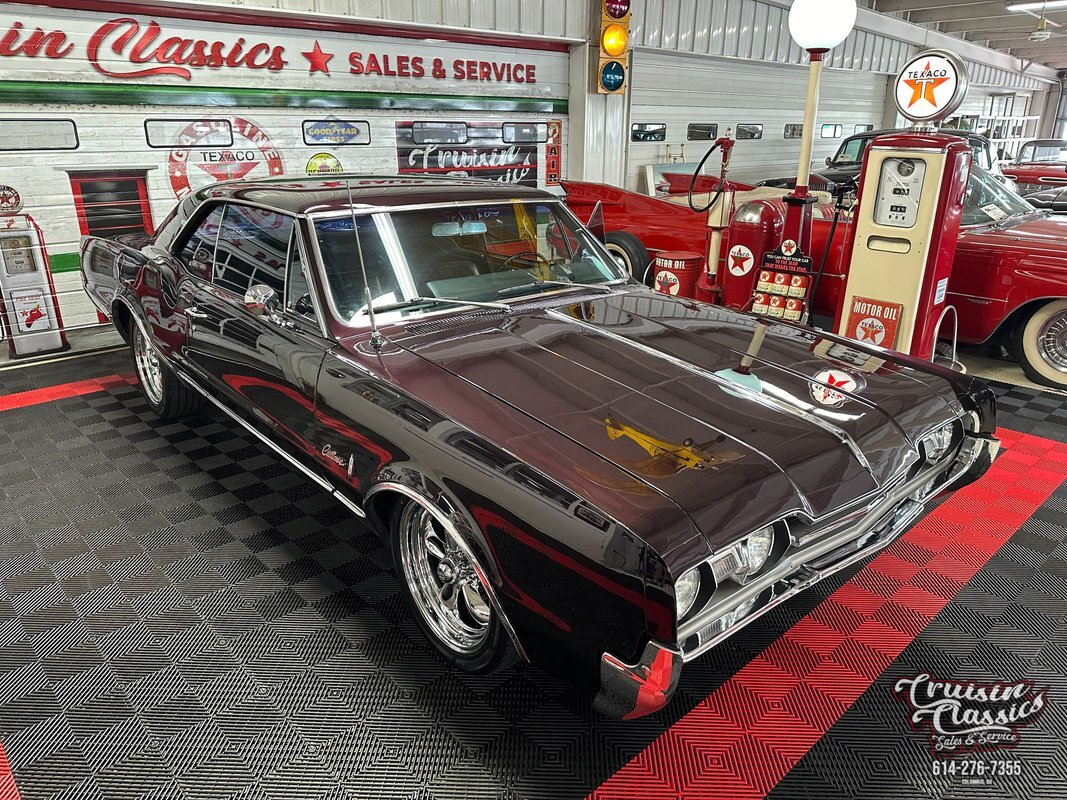 Cruisin Classics is pleased to present to you today this 1967 Oldsmobile Cutlass. This Cutlass comes to us dressed in a glossy coat of dark purple paint in good driver condition accented by gleaming brightwork. Up front you'll find a bright hood spine that culminates with an Oldsmobile emblem at the forward edge. The side-by-side quad headlights feature turn signal indicators in the center of each set and they sit above a chrome bumper in great condition. Brightwork continues around the side of the car with wheel lip molding, body side molding, and drip rail moldings. Gleaming window trim looks great next to the tinted windows. Adding a little more to the visual pop are chrome dual side mirrors and door handles. Both fenders are adorned with Oldsmobile symbol and "Cutlass" script badging in good condition. This Olds has a killer stance courtesy of some lowering springs as it sits atop eye-catching chrome 5-spoke American Racing wheels wrapped in Landspider Citytraxx H/P tires. At the rear you'll find a bright band across the trunk lip with "OLDSMOBILE" lettering on it, another "Cutlass" script badge above the band on the right side, and another chrome bumper with a mirror finish.