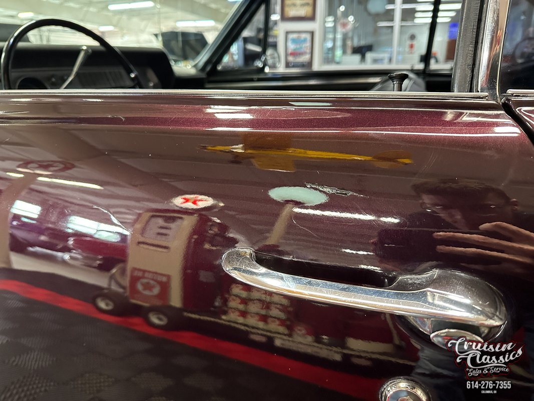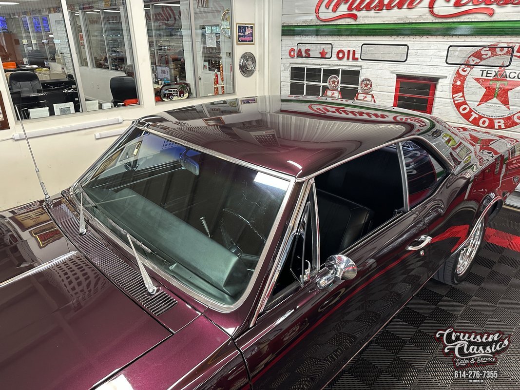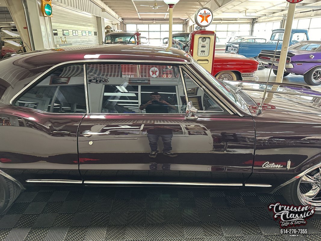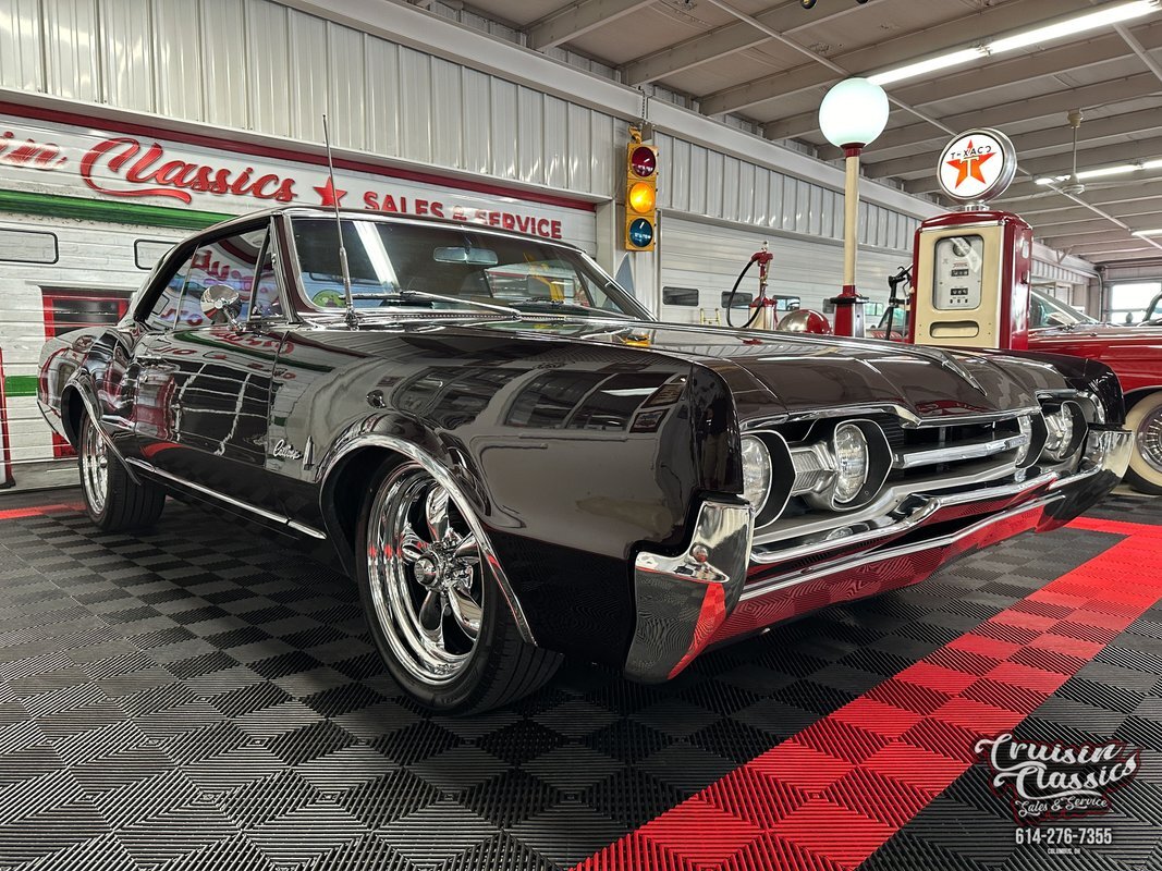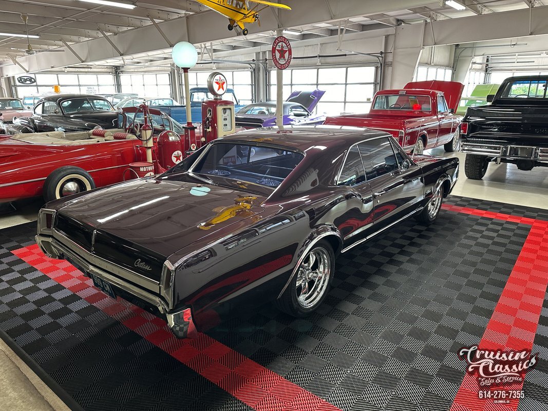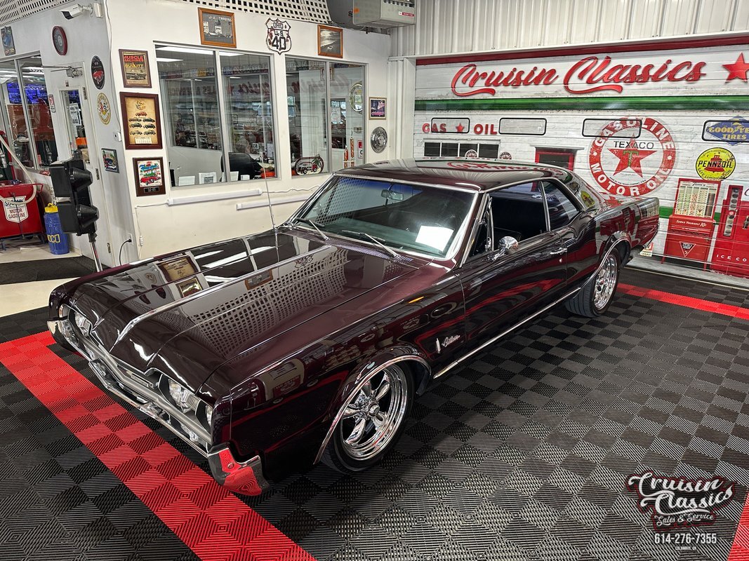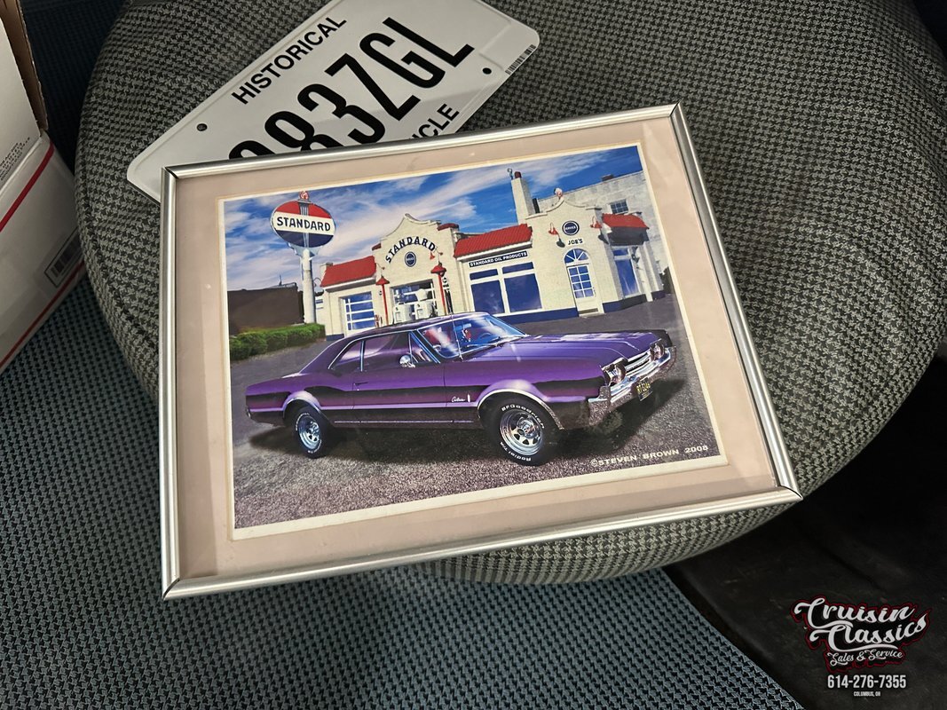 Cruisin Classics is pleased to present to you today this 1967 Oldsmobile Cutlass. This Cutlass comes to us dressed in a glossy coat of dark purple paint in good driver condition accented by gleaming brightwork. Up front you'll find a bright hood spine that culminates with an Oldsmobile emblem at the forward edge. The side-by-side quad headlights feature turn signal indicators in the center of each set and they sit above a chrome bumper in great condition. Brightwork continues around the side of the car with wheel lip molding, body side molding, and drip rail moldings. Gleaming window trim looks great next to the tinted windows. Adding a little more to the visual pop are chrome dual side mirrors and door handles. Both fenders are adorned with Oldsmobile symbol and "Cutlass" script badging in good condition. This Olds has a killer stance courtesy of some lowering springs as it sits atop eye-catching chrome 5-spoke American Racing wheels wrapped in Landspider Citytraxx H/P tires. At the rear you'll find a bright band across the trunk lip with "OLDSMOBILE" lettering on it, another "Cutlass" script badge above the band on the right side, and another chrome bumper with a mirror finish.
