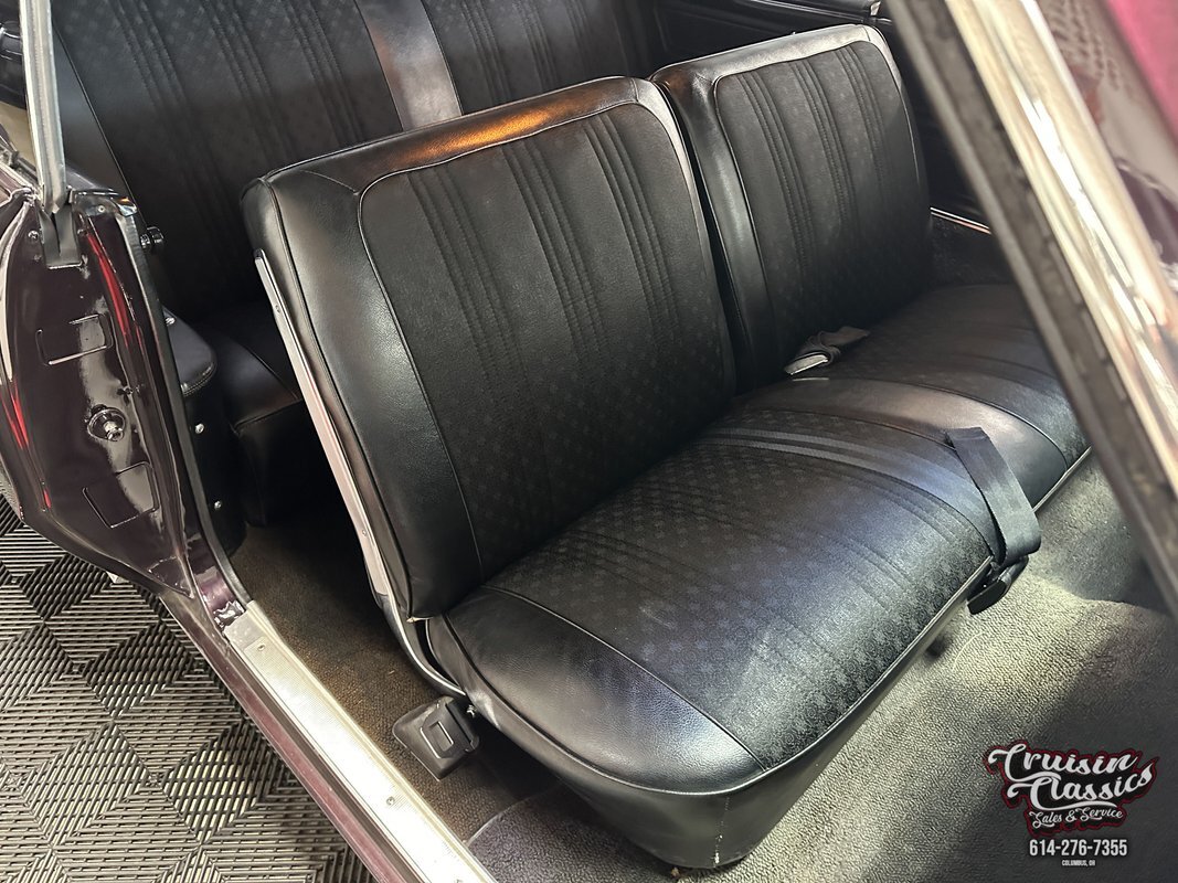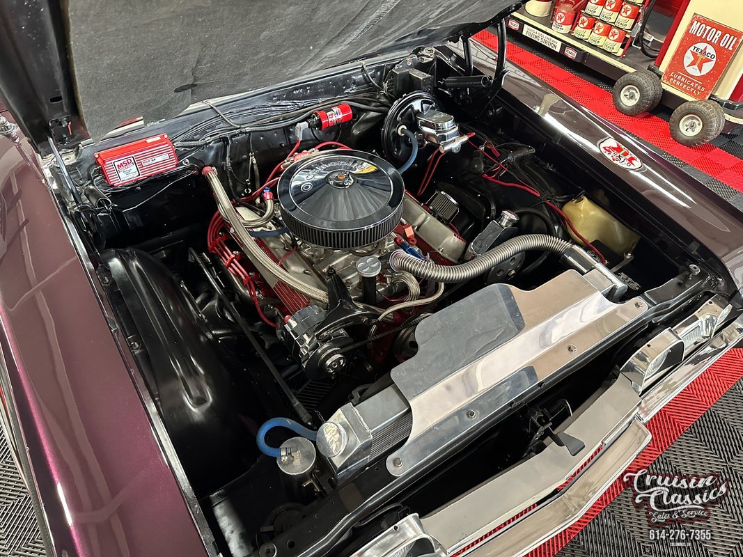 Lift the hood to find a clean and tidy engine bay with a 350ci Rocket V-8 at the center. The red block is topped off with stock heads, finned Holley valve covers with red accents, a ceramic-coated Performance intake manifold, a Holley 4-barrel carburetor, and a chrome Oldsmobile air cleaner. The V-8 is mated to a TH350 3-speed automatic transmission and a torque converter with a 3,000 stall that send power to the open rear end via a 12-bolt axle. Exhaust travels through headers and Dual Performance mufflers to exit below the rear bumper with a very nice rumble. Other highlights under the hood include MSD electronic ignition, a chrome power steering fill, and a 4-row aluminum radiator with dual electric fans to keep things cool. Stopping power comes from drum brakes on all 4 corners with a chrome master cylinder and new booster. Ride quality and handling are excellent with new shocks, ball joints, tie rod ends & links, drag link, and idler arm.