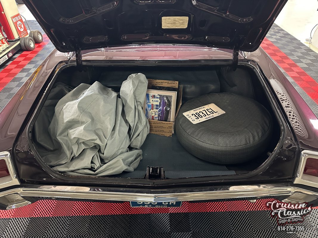When you open the drivers door the dome light comes on to illuminate an all-black interior. The door panels appear original and exhibit light wear. A 6" Polk speaker has been added to each door toward the front in the lower carpeted section. The comfortable bench seats are covered in a combination of black vinyl and fabric with a cool design. Ahead of the driver is a 3-spoke OEM steering wheel in very good condition with a working horn and a shifter behind it on the column. The crack-free black padded dash is home to the factory speedometer, fuel gauge, and temp gauge with warning lights for gen, oil, and hot. An Autometer tachometer has been added in the dash between the heater controls and the original AM radio (inop.). Meanwhile, beneath the dash, you'll find additional Autometer gauges for voltage and oil pressure. The afore-mentioned heater works just as it should with a strong fan. To the far right, behind the flip-up door of the glovebox, you'll discover a newer Sony AM/FM/CD stereo with remote as well as the original owners manual and warranty booklet. This stereo not only plays through the door speakers, but also a set of Polk 6X9's in the rear package tray. Underfoot is black hook & loop carpet while overhead is a tight black vinyl headliner. Around back in the trunk is a vinyl mat, a spare tire with vinyl cover, a factory-style jack, a car cover, and a box of trophies, plaques, and awards the car has earned over time.