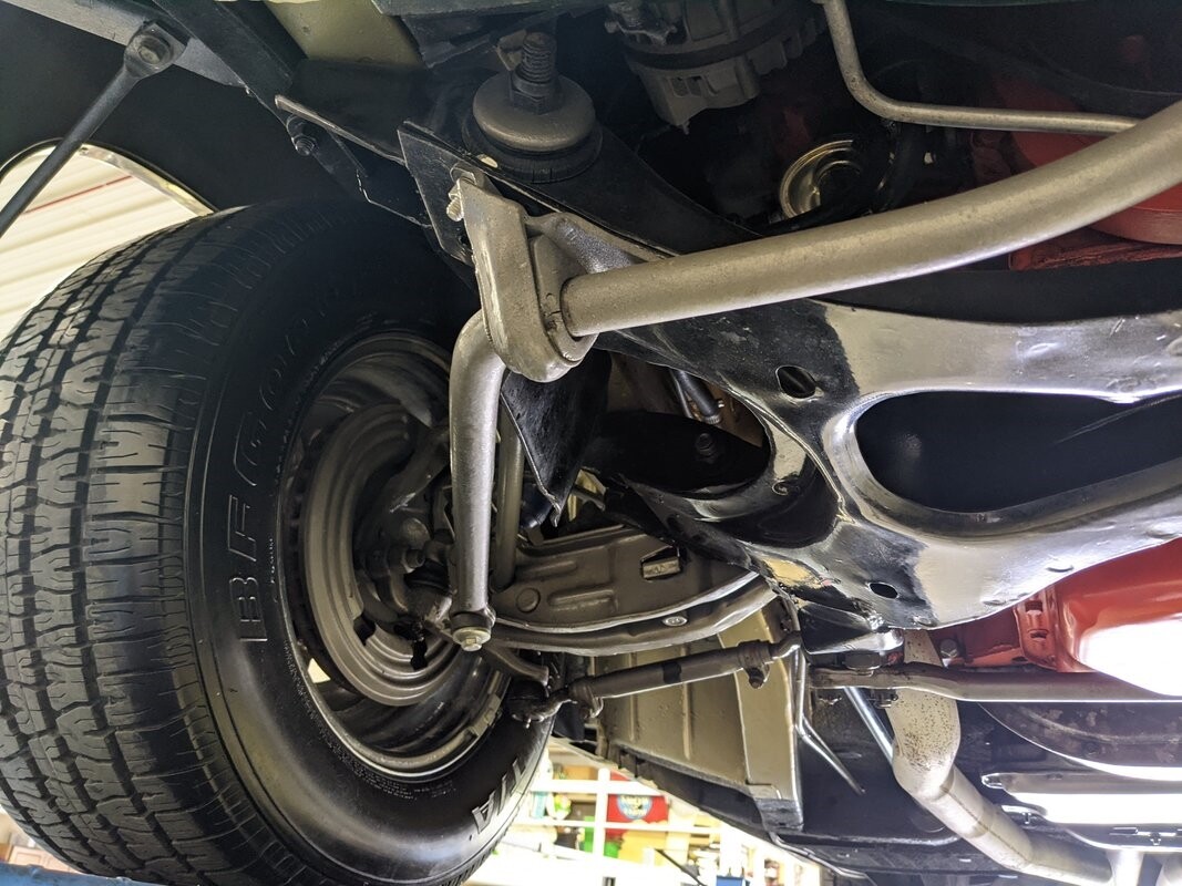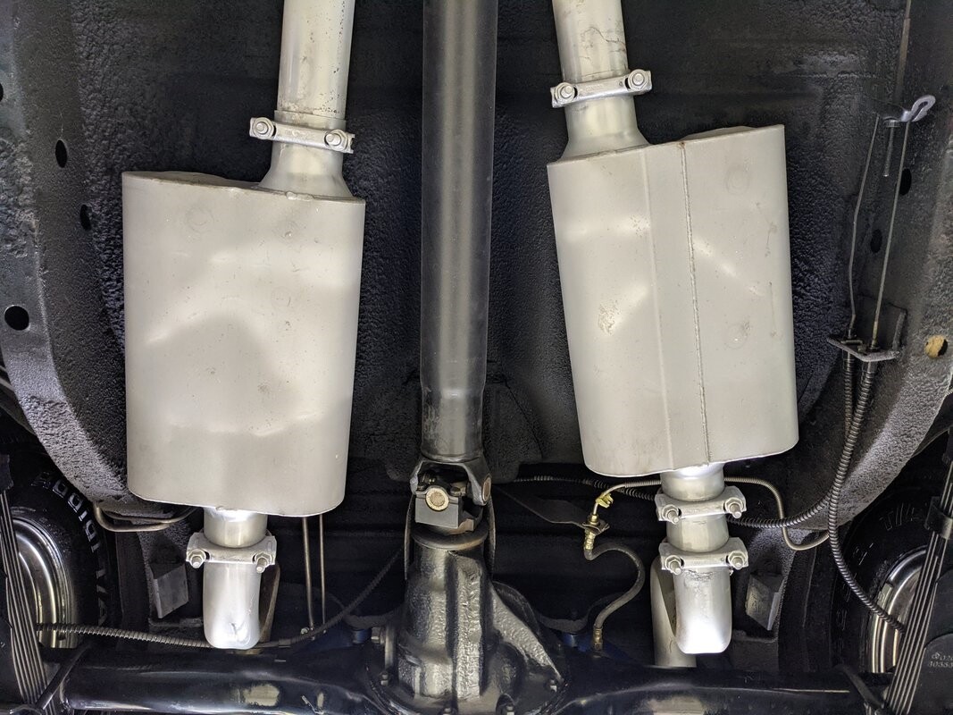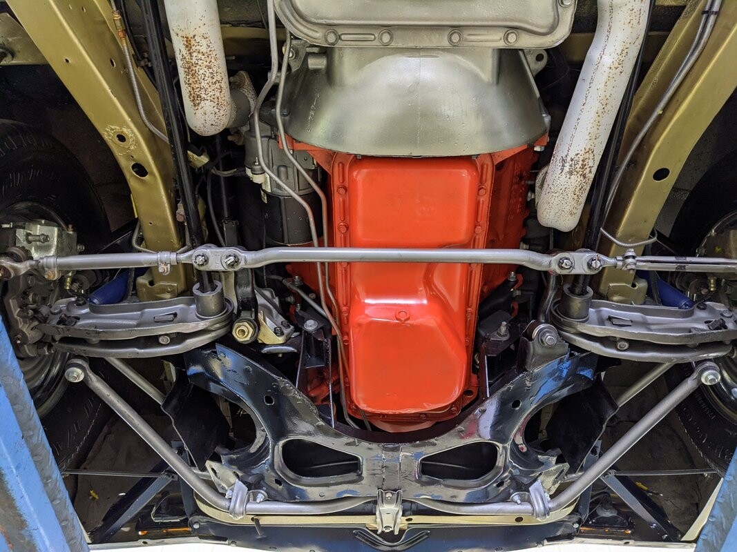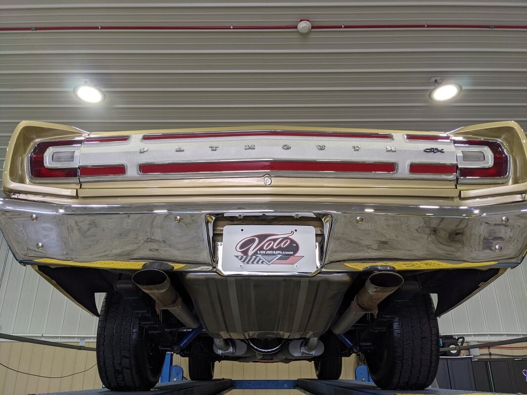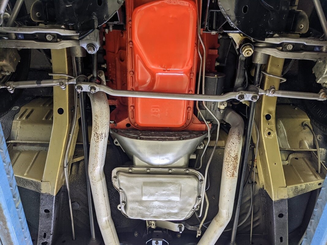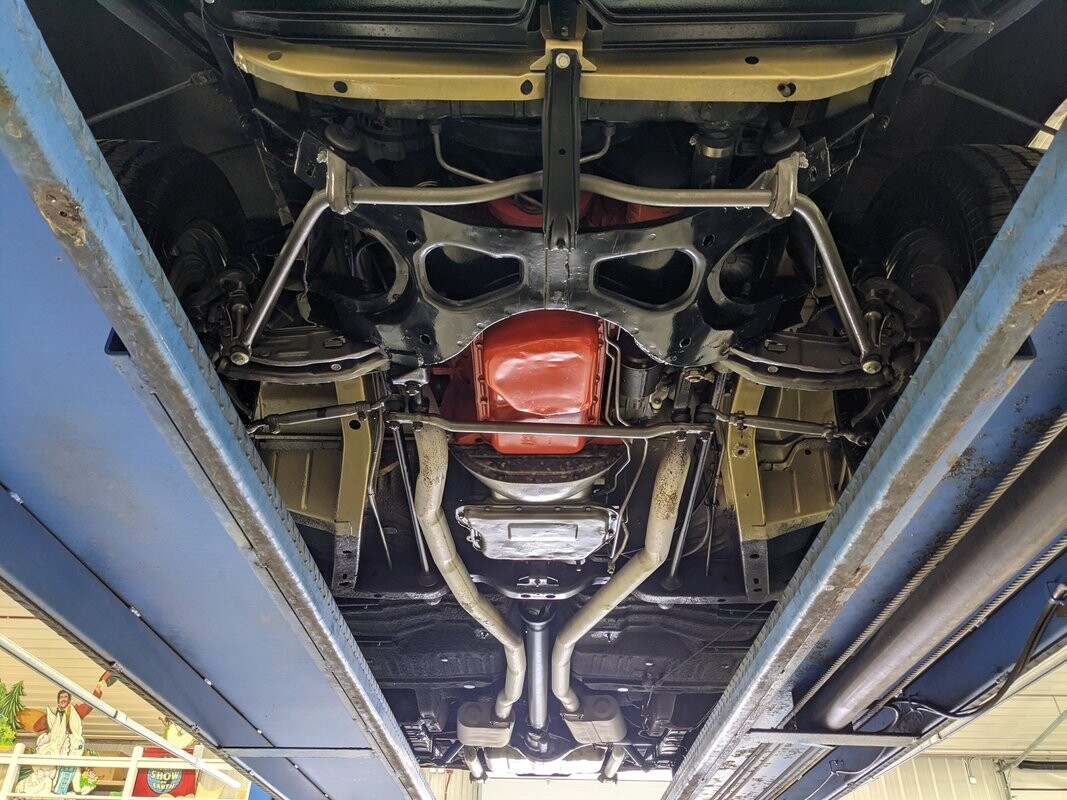 UNDERSIDE: Very clean, solid original metal. Many components were rebuilt or replaced. The front end suspension and steering has been rebuilt and detailed. The rear springs and shocks look fresh. Disc brake upgrade in front, e-brake assembly is hooked up, lines and hoses were replaced. Dual exhaust with Flowmaster mufflers and correct tips. Fuel tank, straps and lines were replaced. Looking up at the motor it is spotless, starter looks fresh. Correct 727 Torqueflite automatic looks fresh. The driveshaft was rebuilt and painted. The 8 3/4 rear end is gloss black.