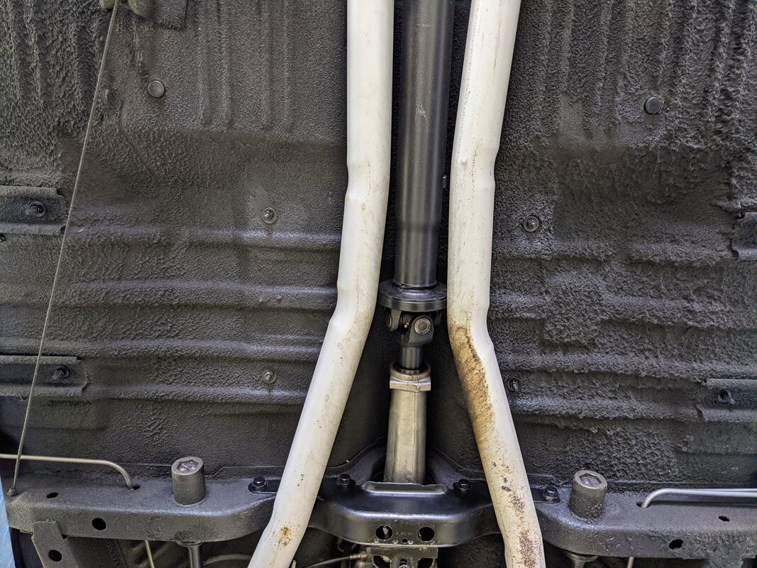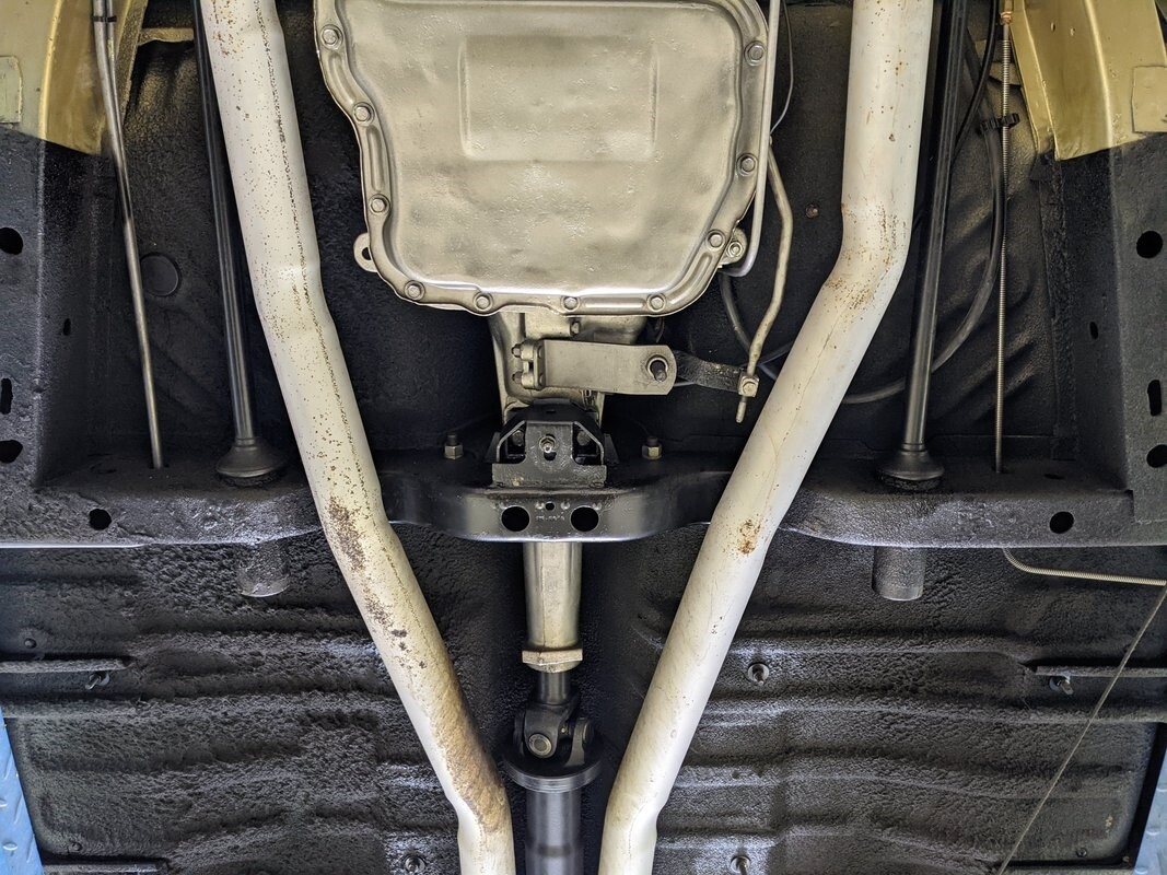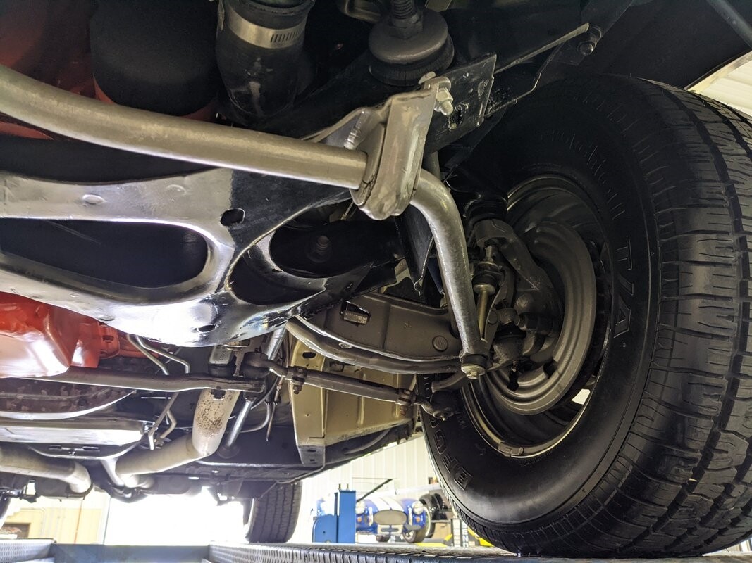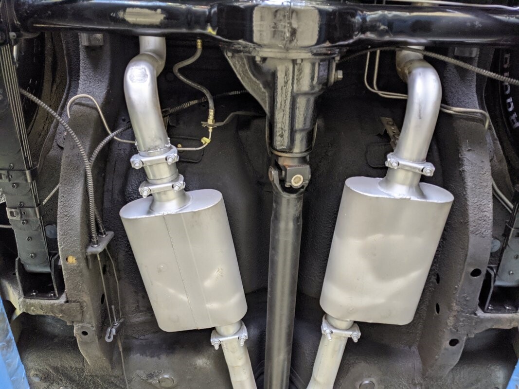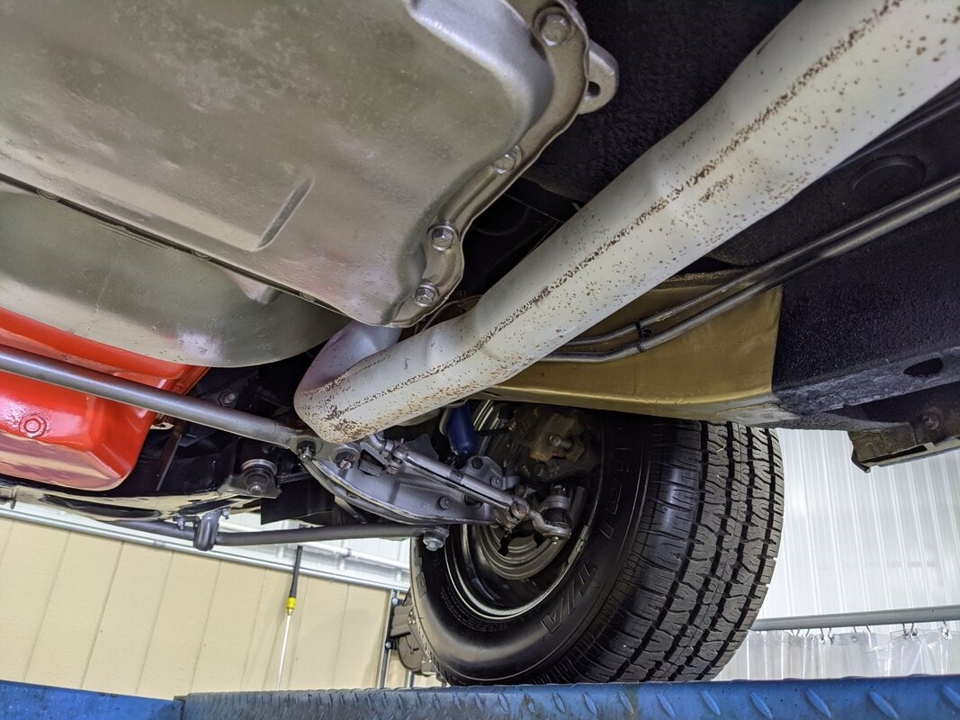 UNDERSIDE: Very clean, solid original metal. Many components were rebuilt or replaced. The front end suspension and steering has been rebuilt and detailed. The rear springs and shocks look fresh. Disc brake upgrade in front, e-brake assembly is hooked up, lines and hoses were replaced. Dual exhaust with Flowmaster mufflers and correct tips. Fuel tank, straps and lines were replaced. Looking up at the motor it is spotless, starter looks fresh. Correct 727 Torqueflite automatic looks fresh. The driveshaft was rebuilt and painted. The 8 3/4 rear end is gloss black.