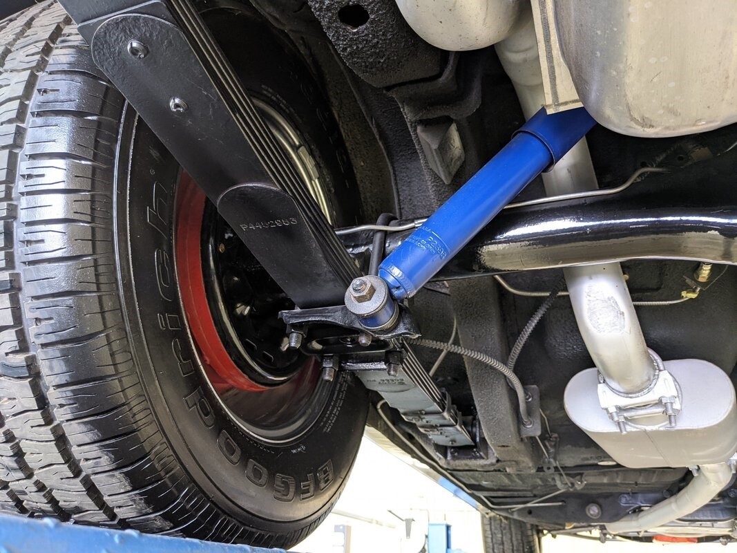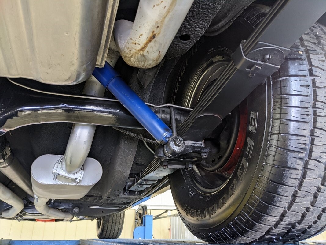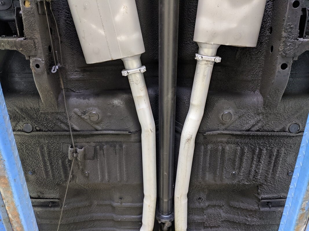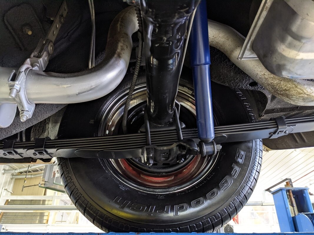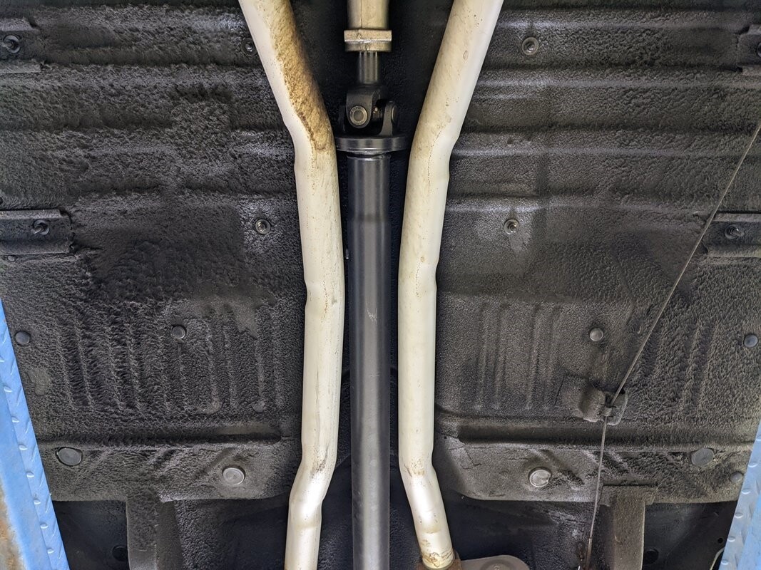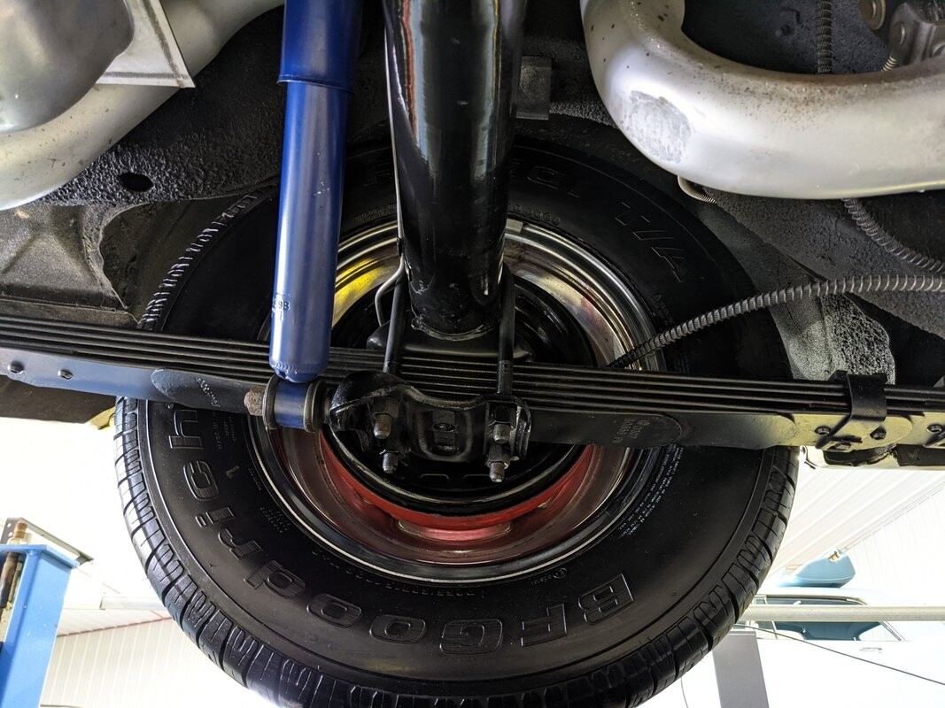 UNDERSIDE: Very clean, solid original metal. Many components were rebuilt or replaced. The front end suspension and steering has been rebuilt and detailed. The rear springs and shocks look fresh. Disc brake upgrade in front, e-brake assembly is hooked up, lines and hoses were replaced. Dual exhaust with Flowmaster mufflers and correct tips. Fuel tank, straps and lines were replaced. Looking up at the motor it is spotless, starter looks fresh. Correct 727 Torqueflite automatic looks fresh. The driveshaft was rebuilt and painted. The 8 3/4 rear end is gloss black.