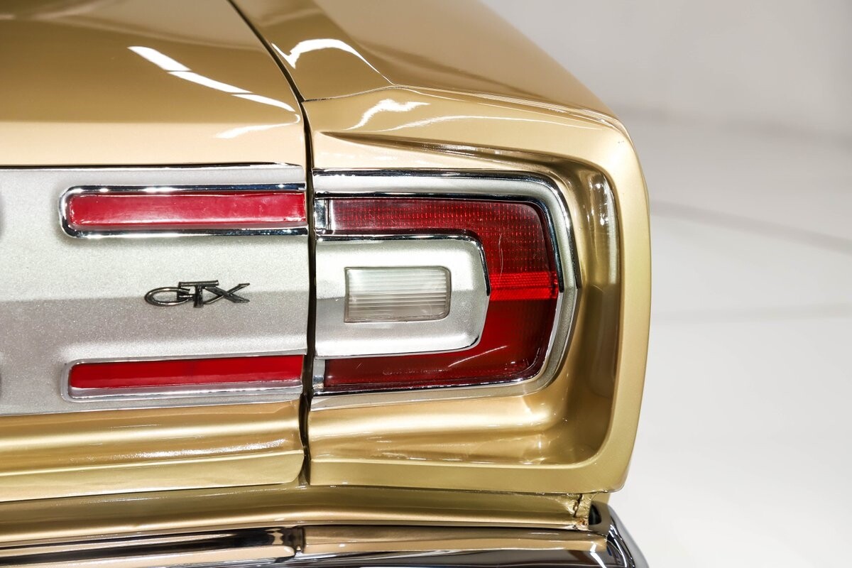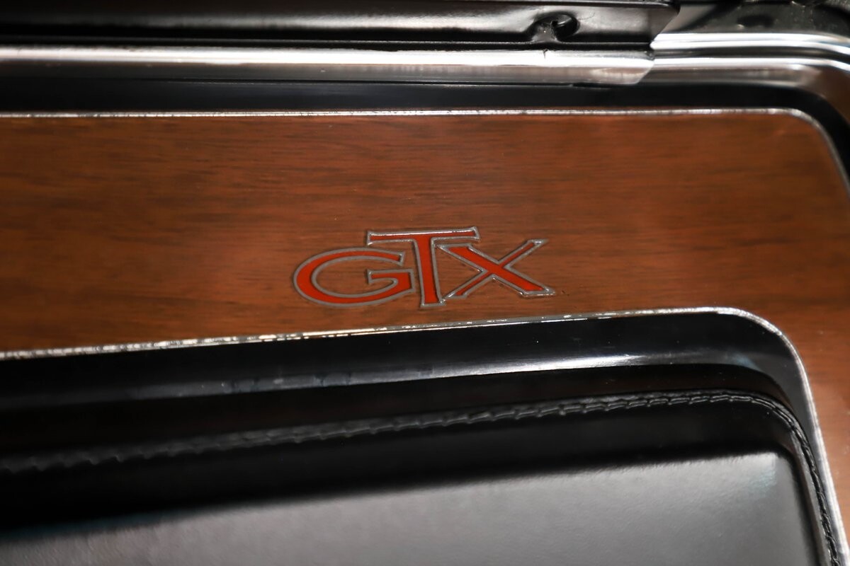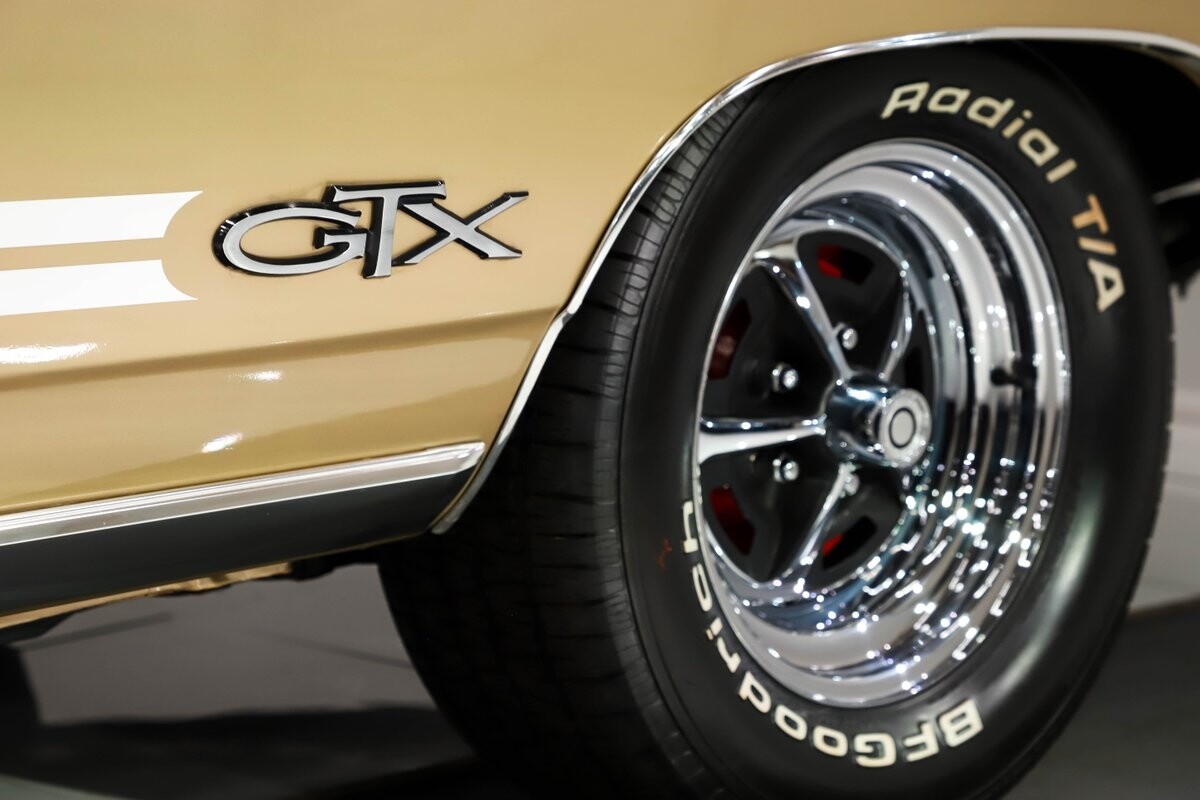 EXTERIOR: The body is straight, no rust or damage. The paint is exceptional- metal flake is laid out evenly and the clear coat is polished like glass. Jambs are painted real slick. Weatherstrips and window seals were replaced. Very classy looking color. Painted on satin black hood patch. The double white stripes bring attention to the GTX callout. Bumpers are shiny and straight. Grill looks like a good original that's been polished. Stainless trim is straight and polished. The tail panel is excellent, taillights look new. Vinyl top is excellent. 15 inch Magnum 500 wheels are sparkling and have new BFG tires that were just installed.
