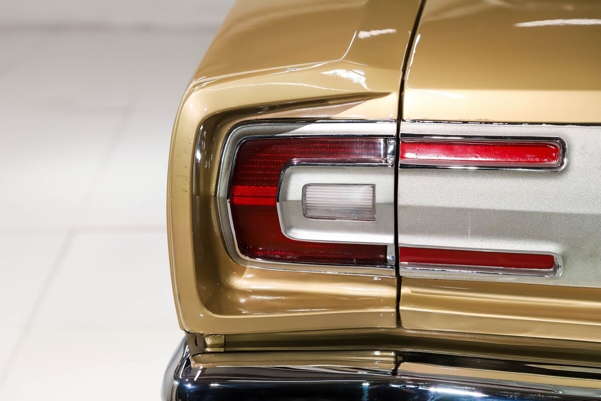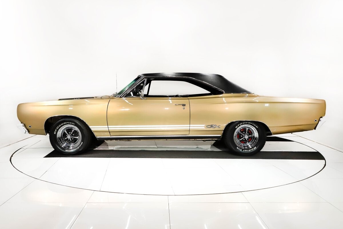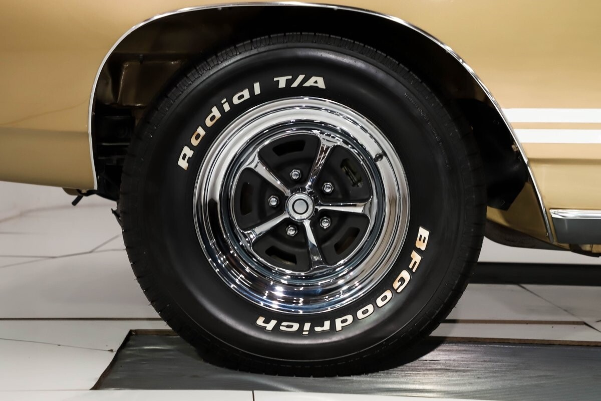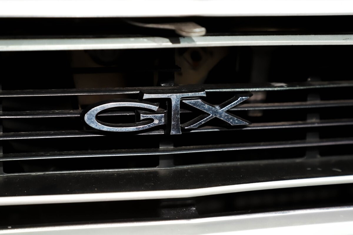 EXTERIOR: The body is straight, no rust or damage. The paint is exceptional- metal flake is laid out evenly and the clear coat is polished like glass. Jambs are painted real slick. Weatherstrips and window seals were replaced. Very classy looking color. Painted on satin black hood patch. The double white stripes bring attention to the GTX callout. Bumpers are shiny and straight. Grill looks like a good original that's been polished. Stainless trim is straight and polished. The tail panel is excellent, taillights look new. Vinyl top is excellent. 15 inch Magnum 500 wheels are sparkling and have new BFG tires that were just installed.