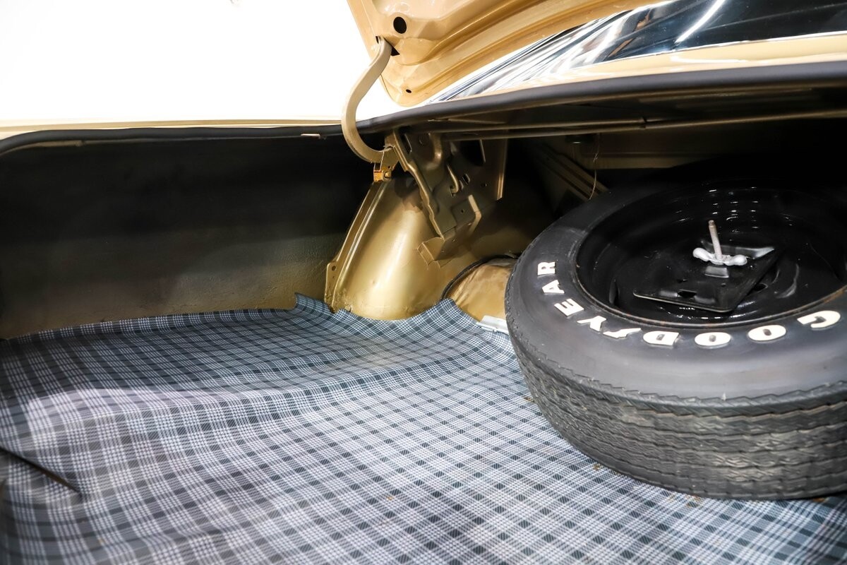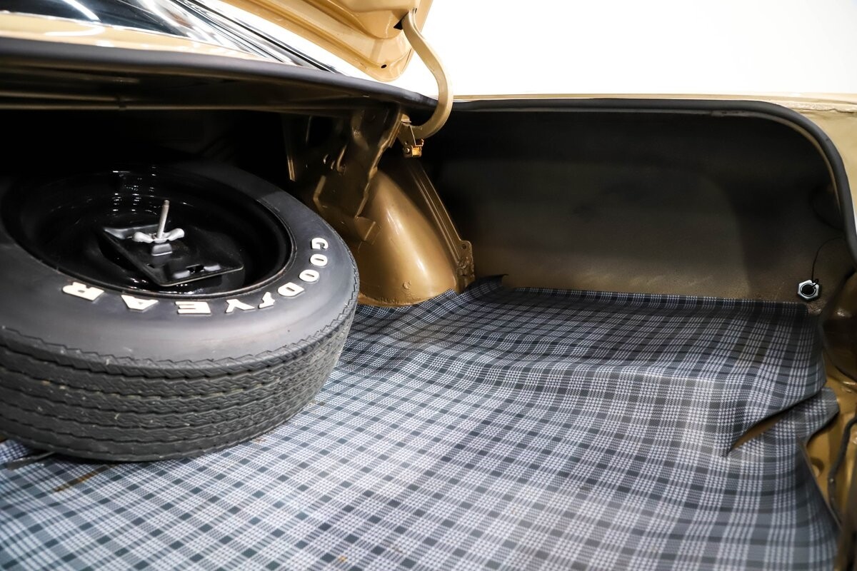 TRUNK COMPARTMENT: Pristine metal, the trunk floor was replaced. Repainted body color. The mat and weatherstrip were replaced. It has a jack and spare assembly.